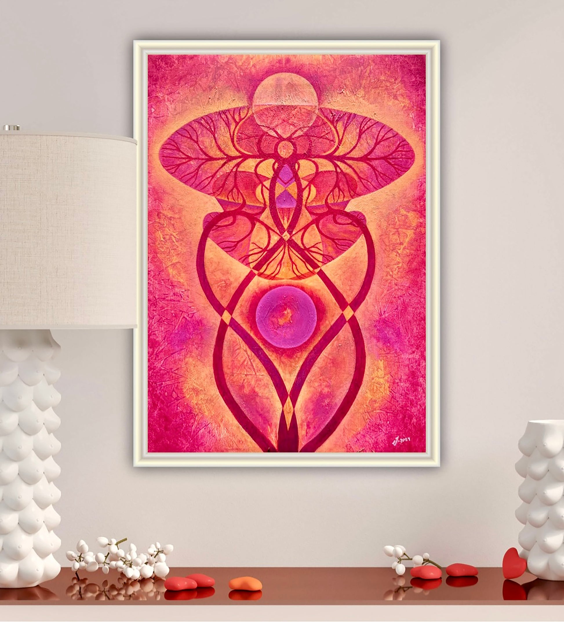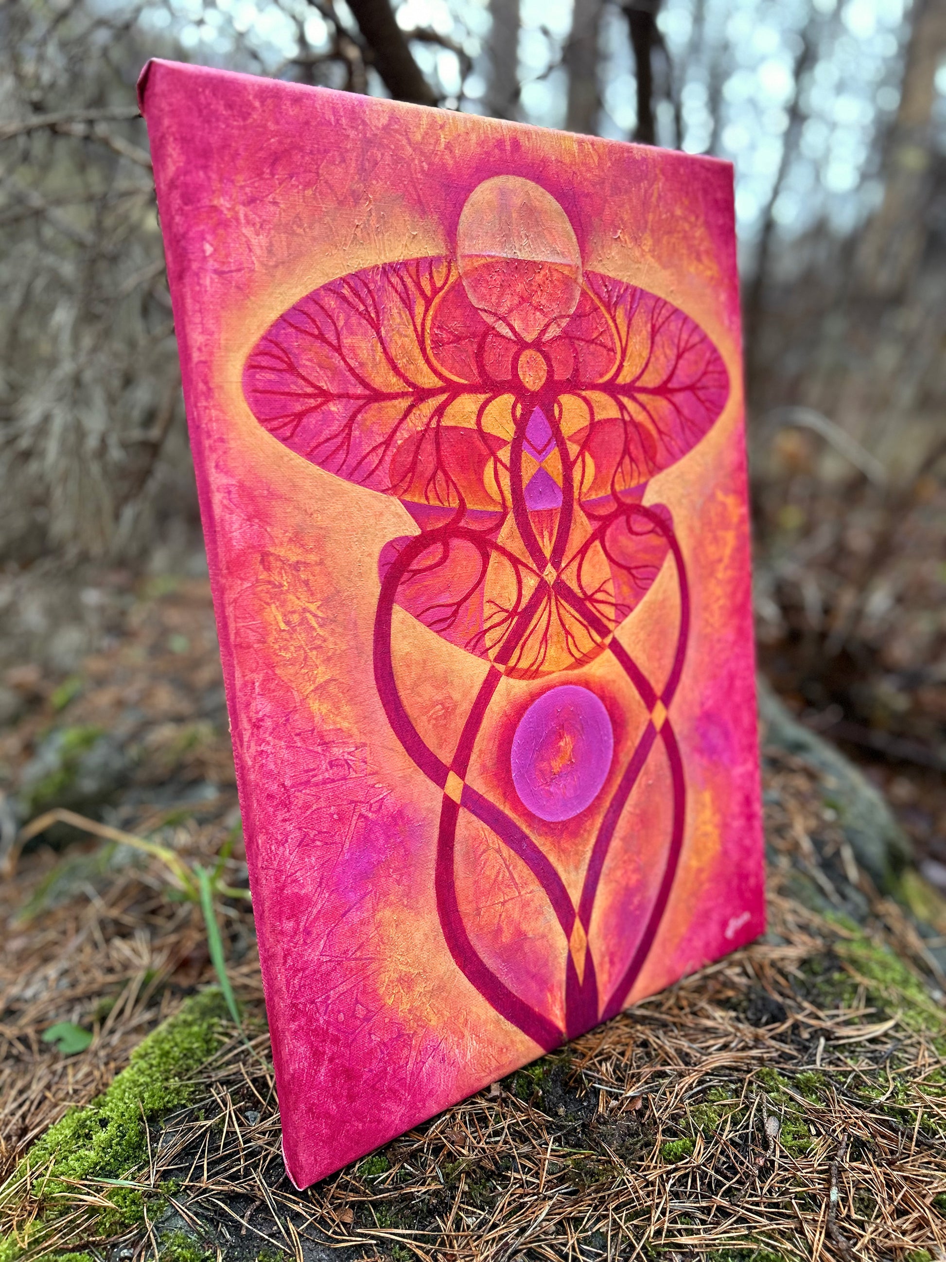 Semi-abstrakt målning där näckrosblad sammanflätas i en fusion av värme och styrka.