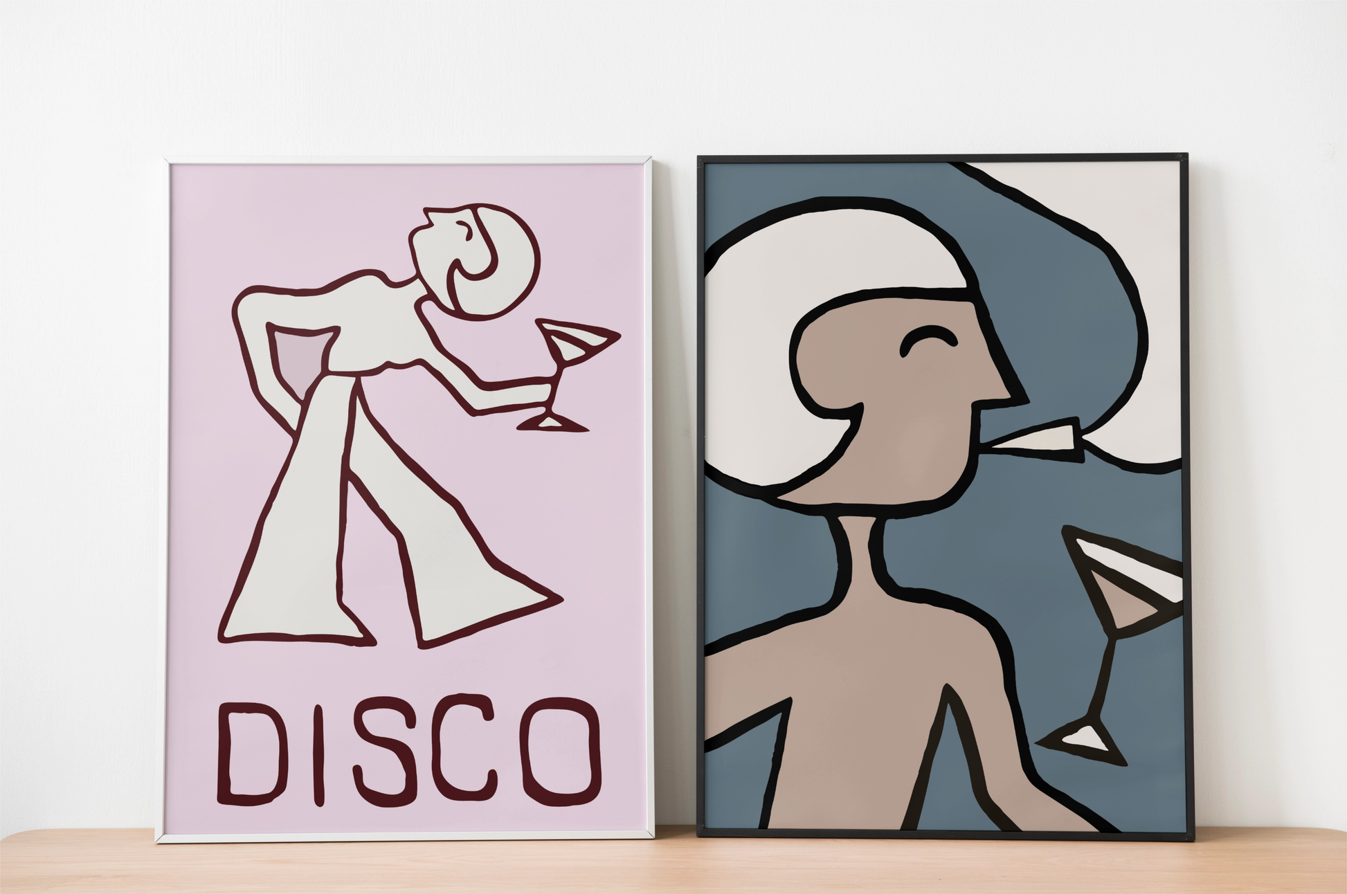 Poster av den ursprungliga målningen Galej av Josefin Blomkvist. Mot en blå bakgrund avbildas en stiliserad figur som röker, tillsammans med ett cocktailglas. Ge ditt hem en färgglad och lekfull känsla med detta unika konstverk!