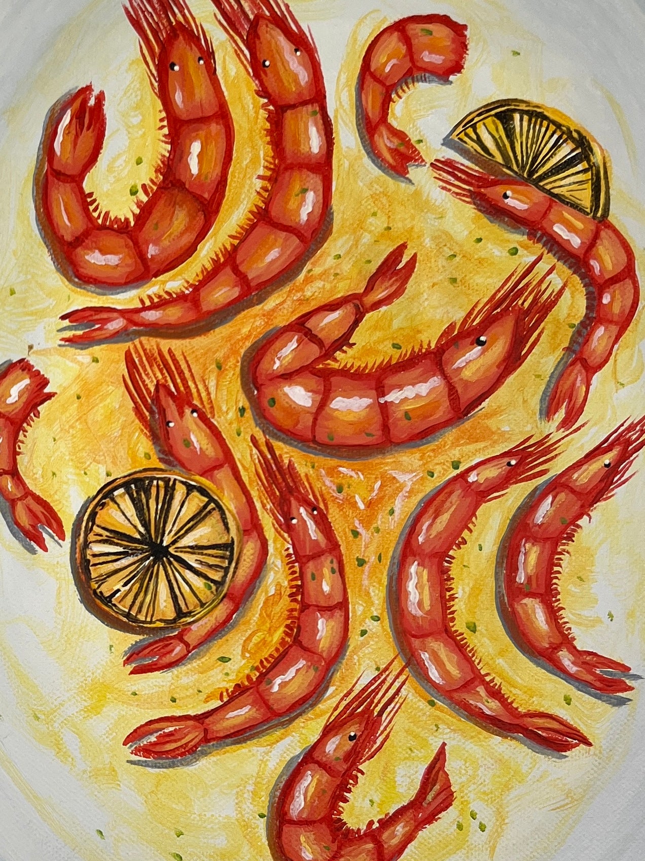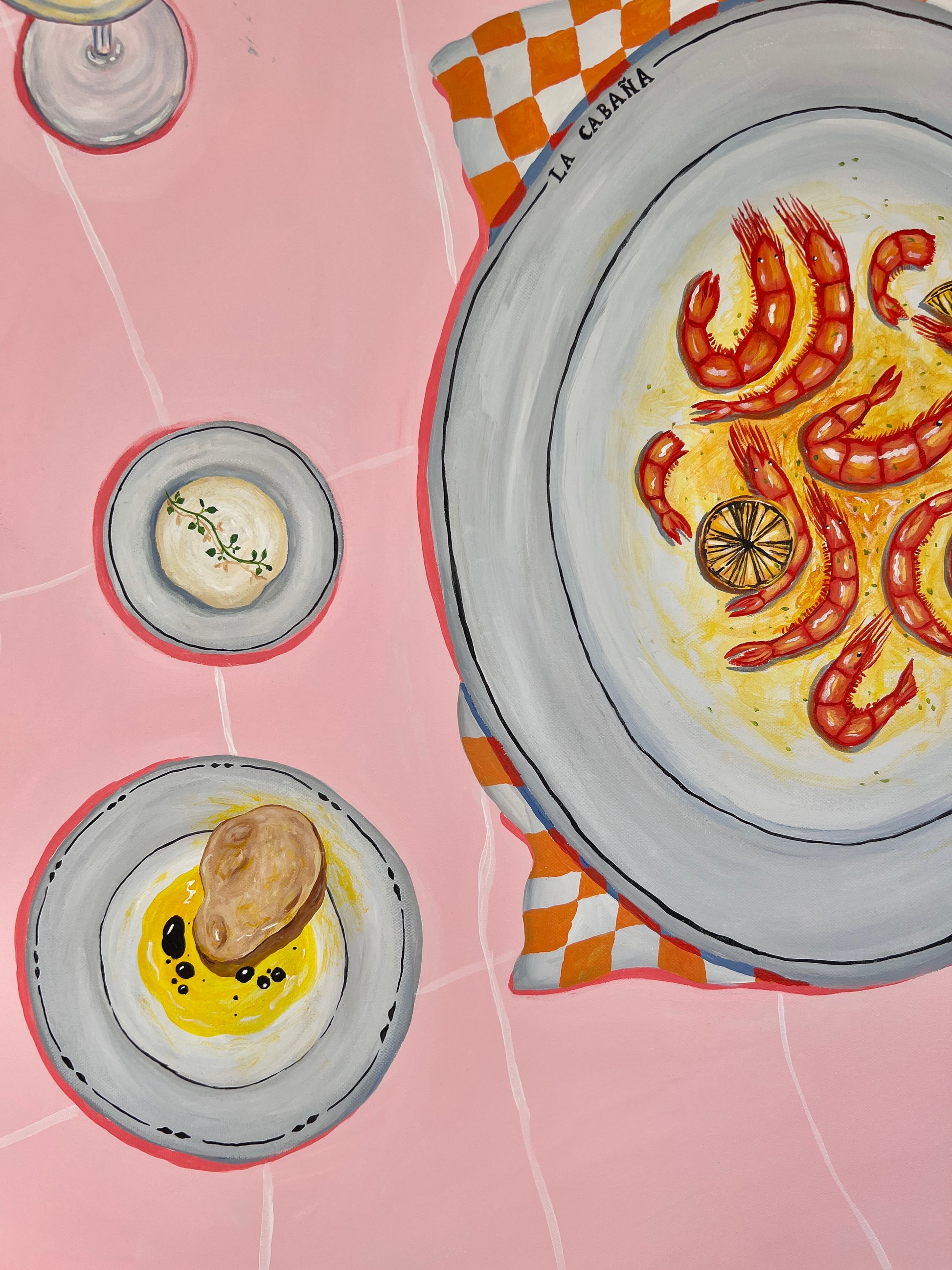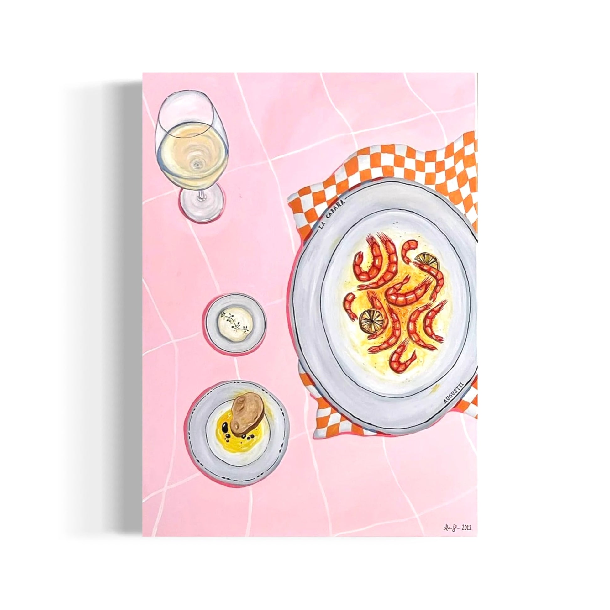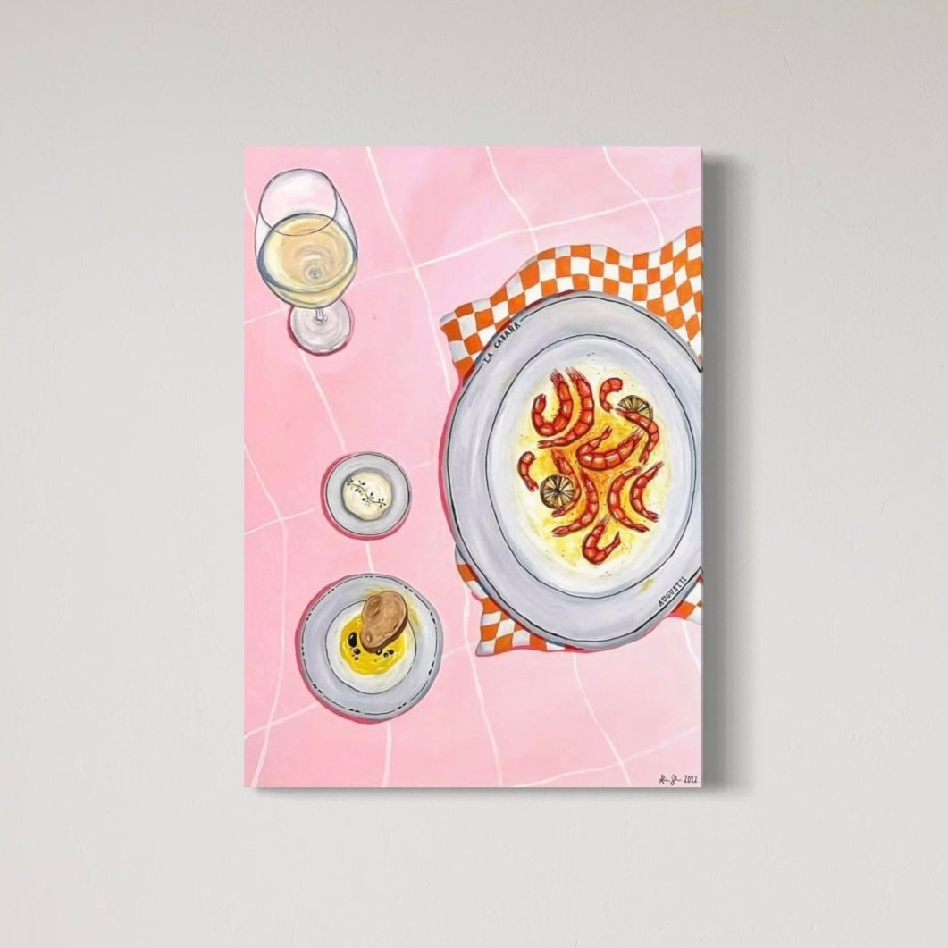 En vacker visualisering av en måltid med mat och dryck på en vågig, rutig och rosa bakgrund - så skulle man kunna beskriva den handgjorda akrylmålningen "Gambas" av Alice Söderholm. Gör din heminredning mer unik och rolig med detta konstverk!