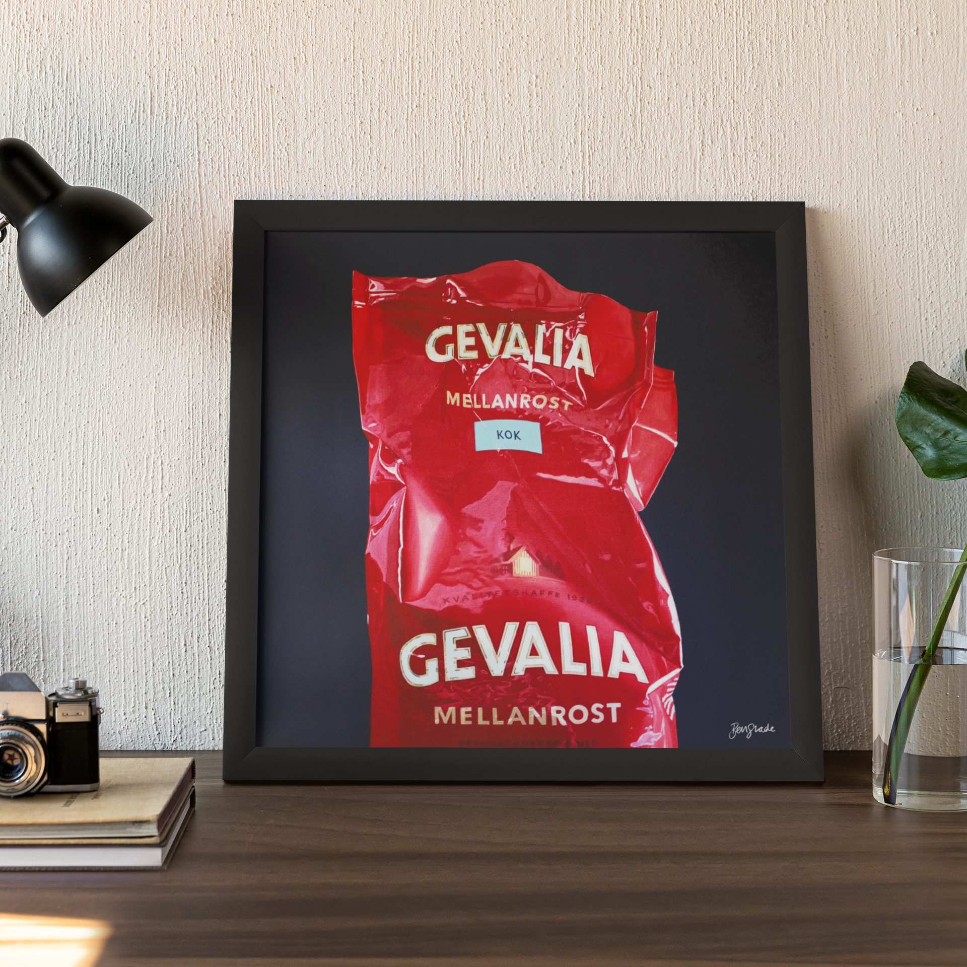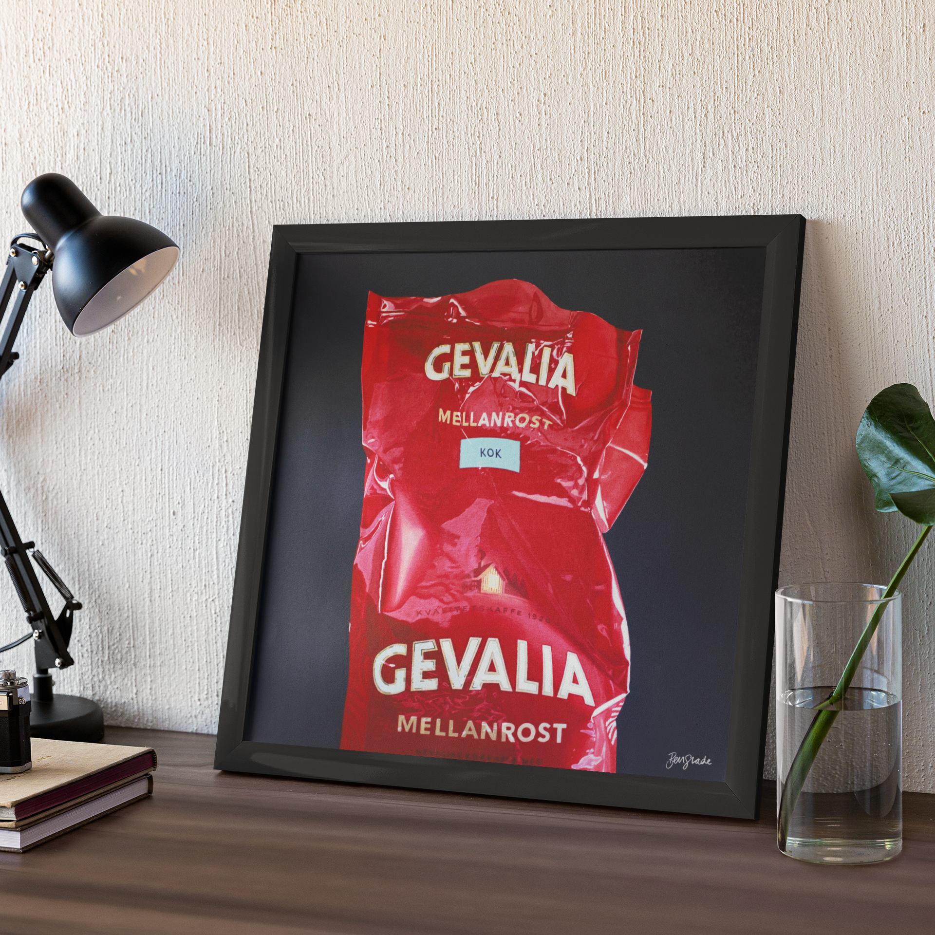Tryckt reproduktion av det ursprungliga akrylkonstverket "Gevalia" av Ben Slade.