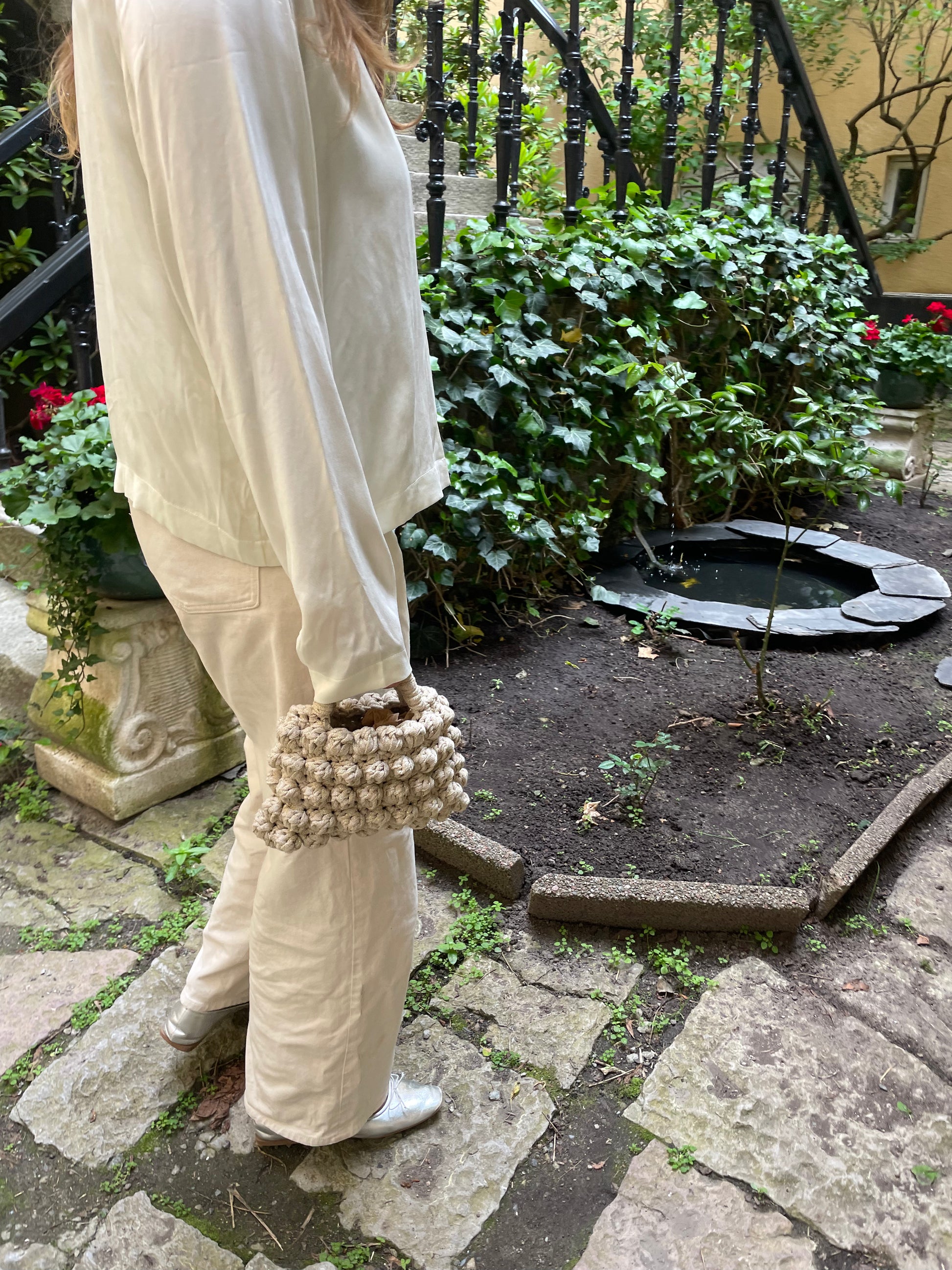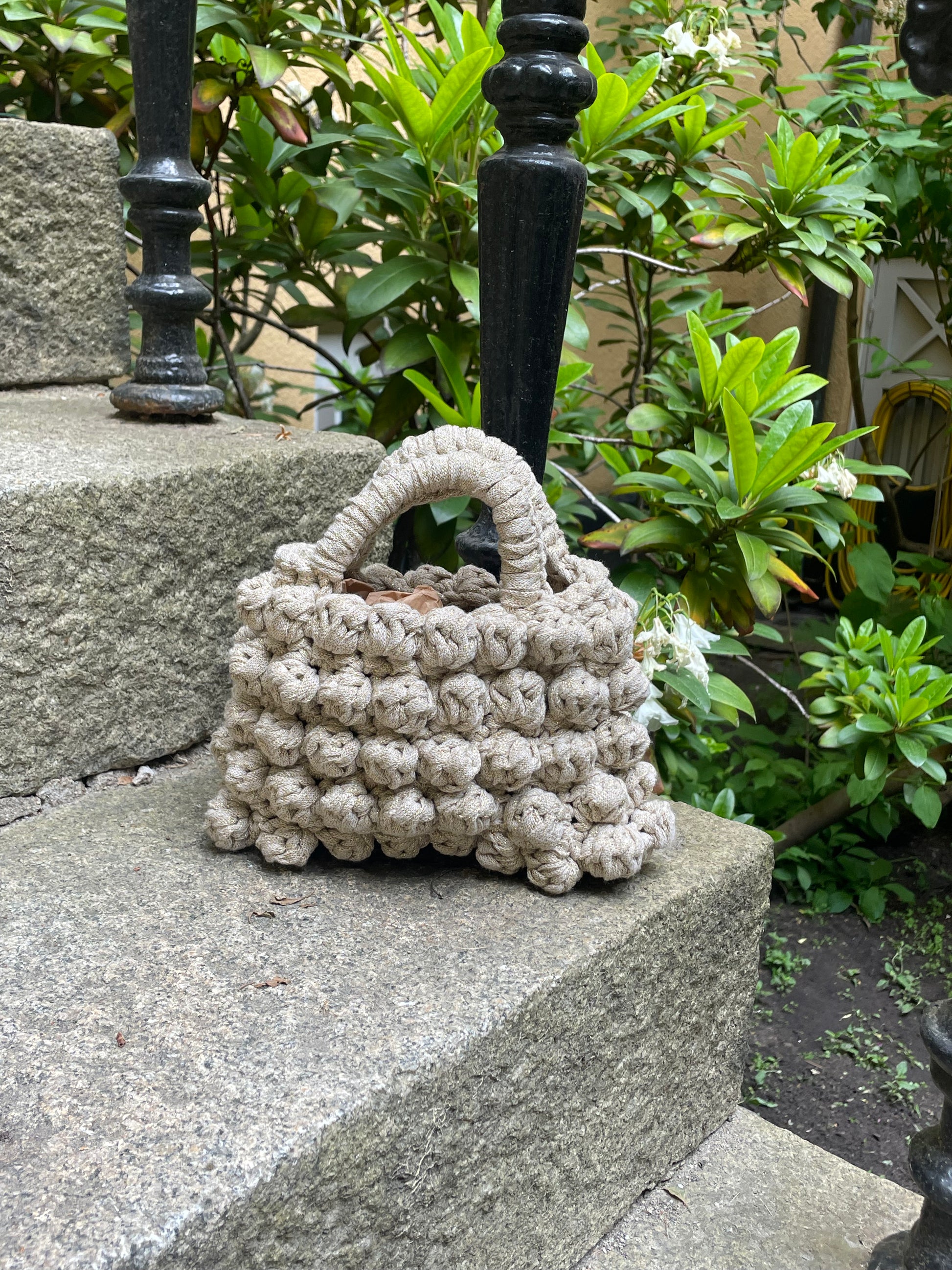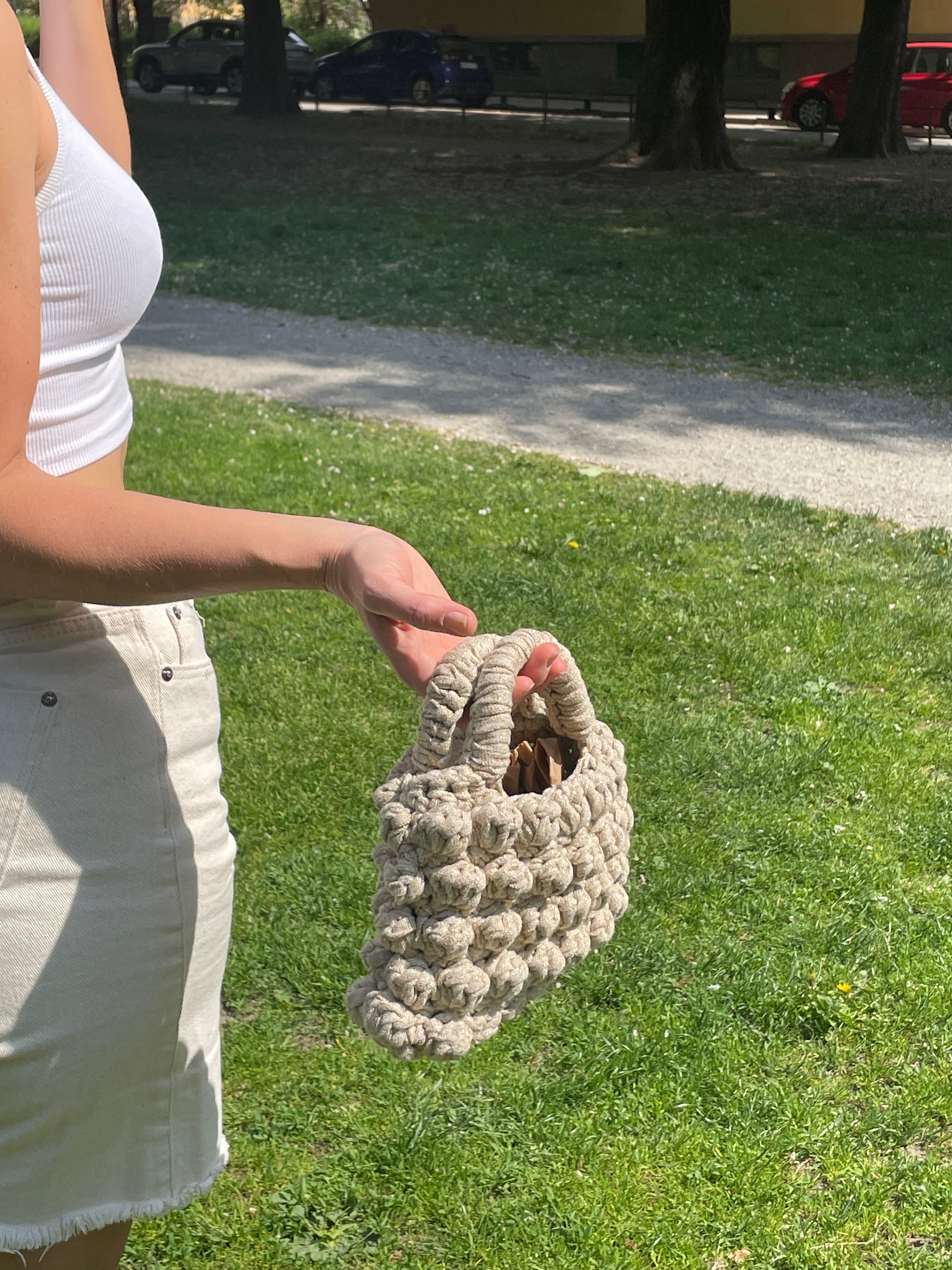 Guld Mini-bobble är den perfekta accessoaren för alla tillfällen, både under sommaren och vintern! En unik, snygg virkad väska som piffar upp vilken outfit som helst.