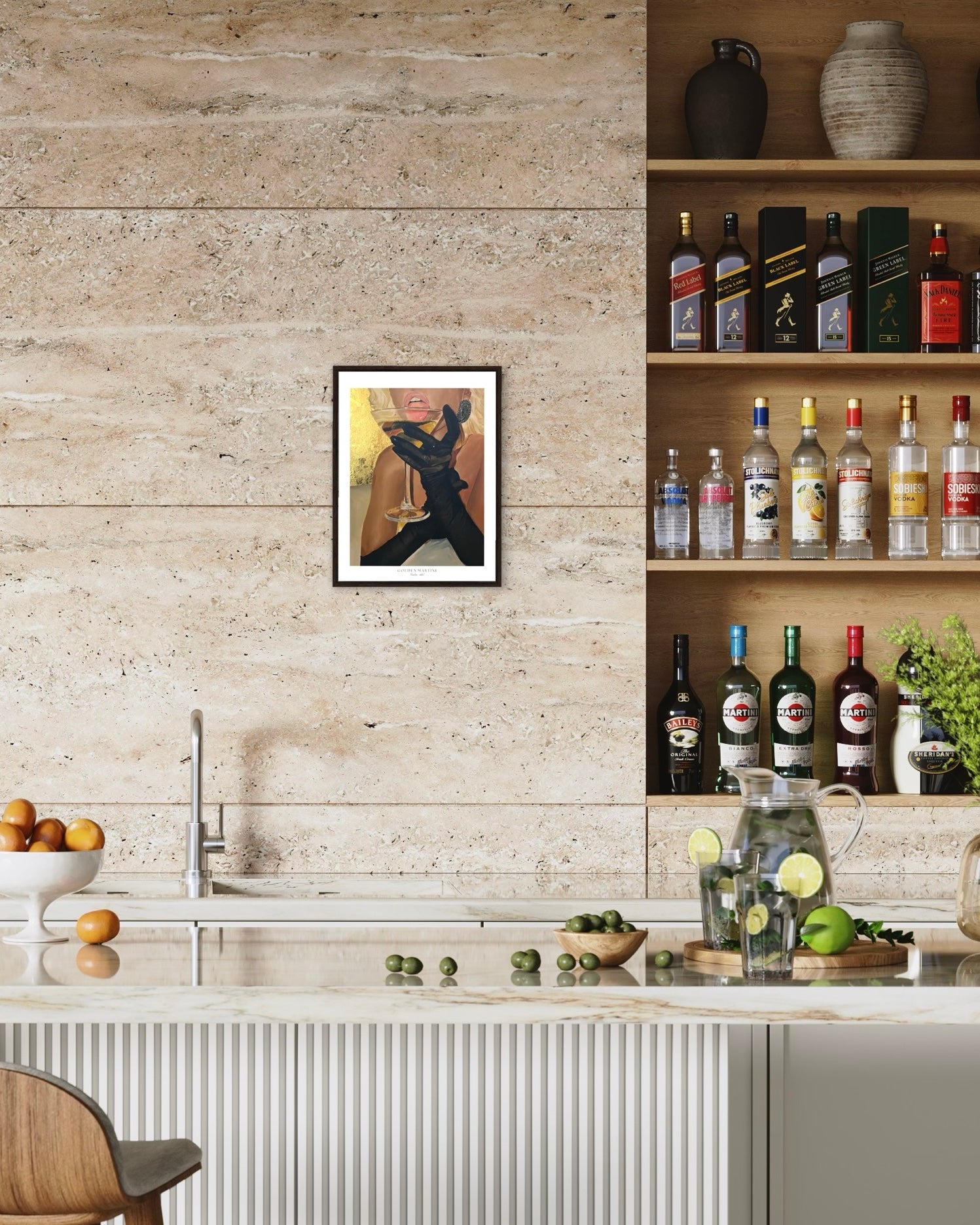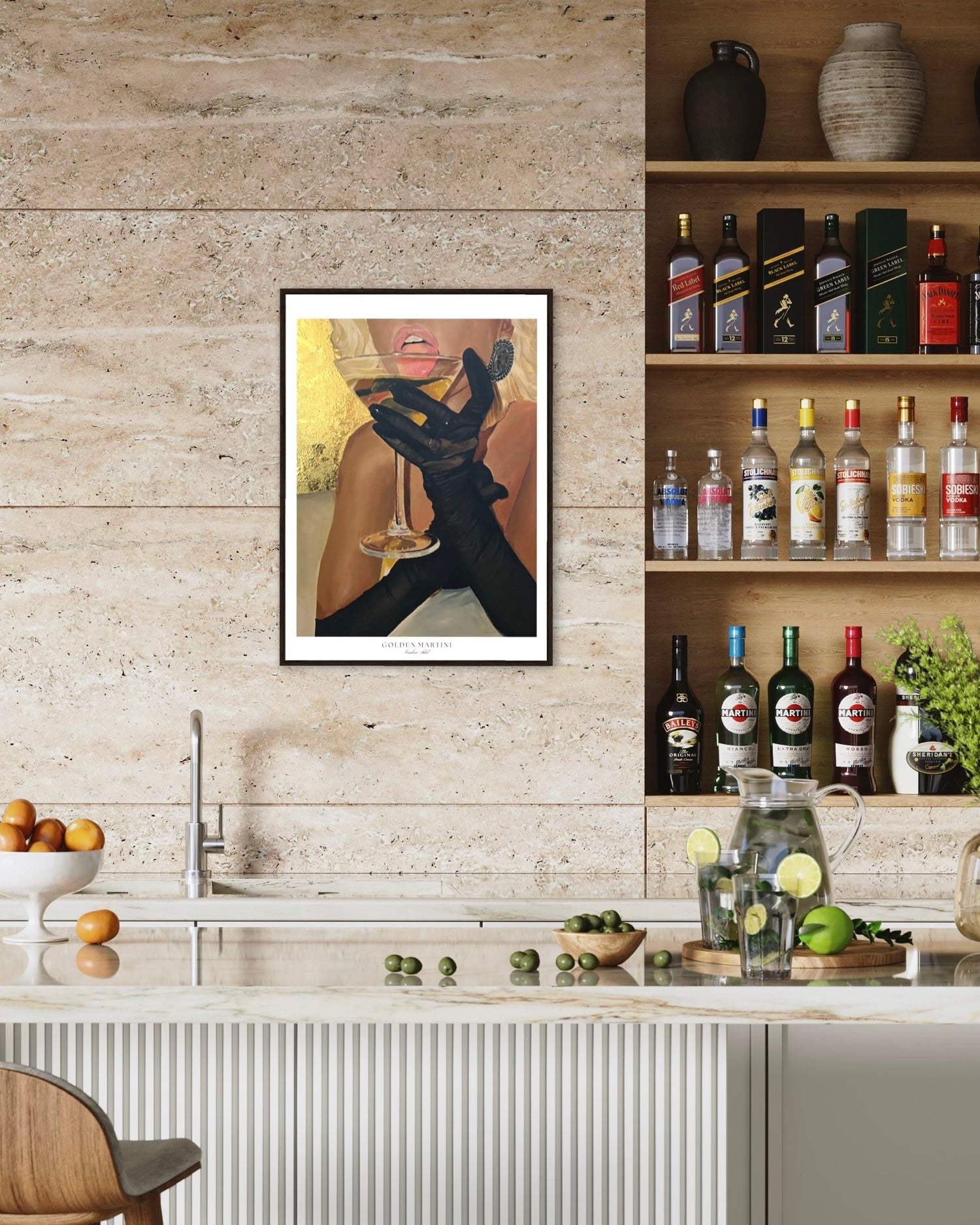 Gyllene Martini affisch. Ursprungligen målad av Tindra Ädel med akryl och bladguld. Referensbild fotograferad av Sasha Maslova. Affischer av museumkvalitet gjorda på tjockt matt papper. Ram ingår ej!