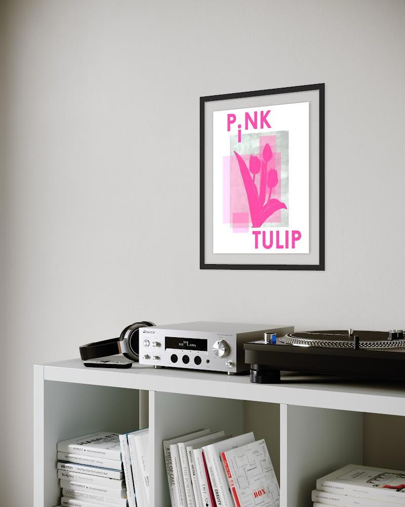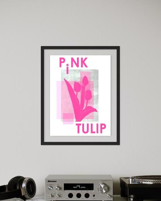 PiNK TULIP är din egen blomsterbukett som aldrig vissnar, låt det alltid vara tulpan-säsong! Basen är handgjord och kan köpas som ett originalverk på webbplatsen, men affischen inkluderar texttillägg och grafiska element skapade i Adobe Photoshop.
