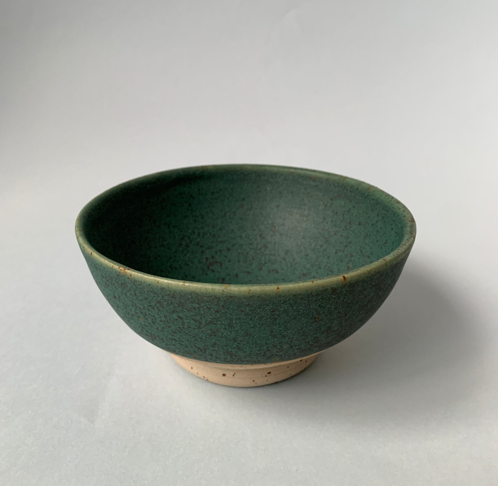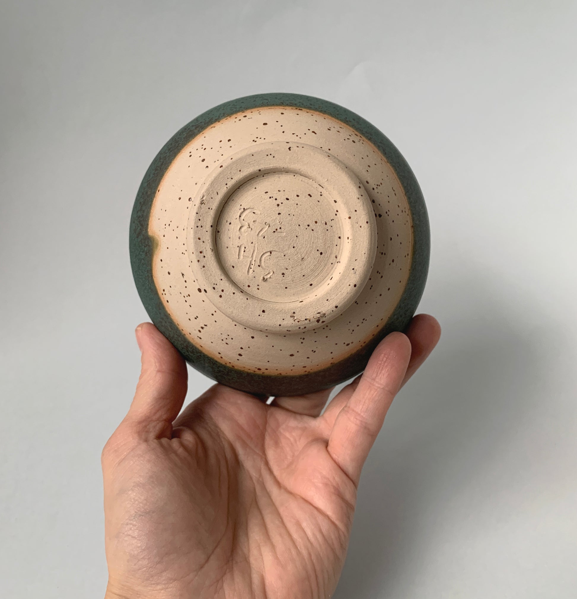 Färg: Ljus lera med lavafläckar, glaserad med en matt, koppargrön glasyr.