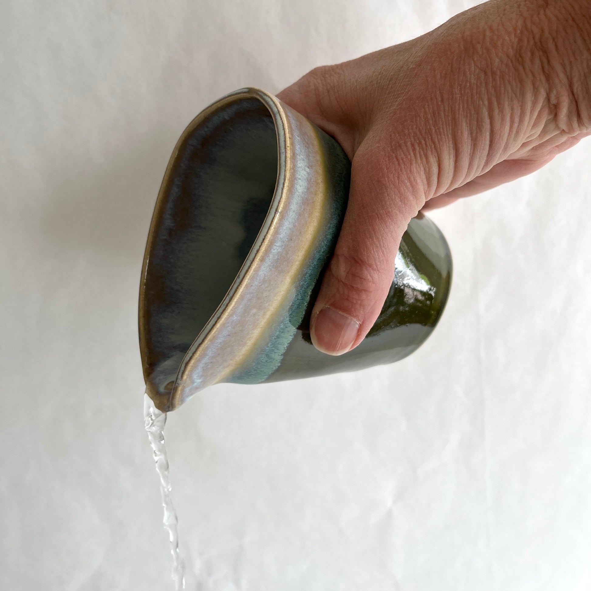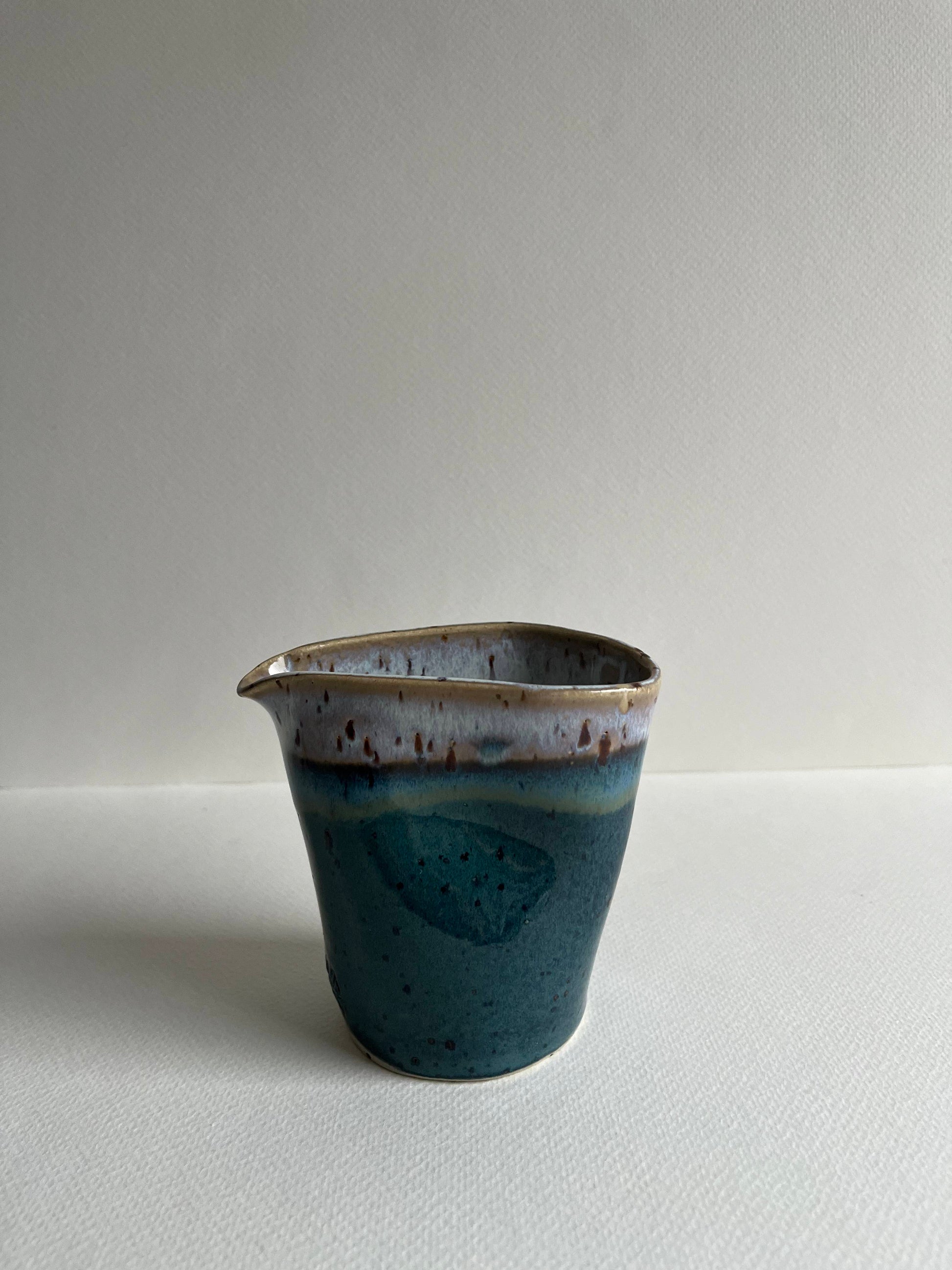 En handgjord keramikkanna i ljusblå färg och unik form, gjord av duktiga Stilla Sinnet. Denna stilfulla, tidlösa design är perfekt för att hälla vätskor med och för att ge ditt kök ett lyft!