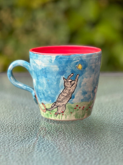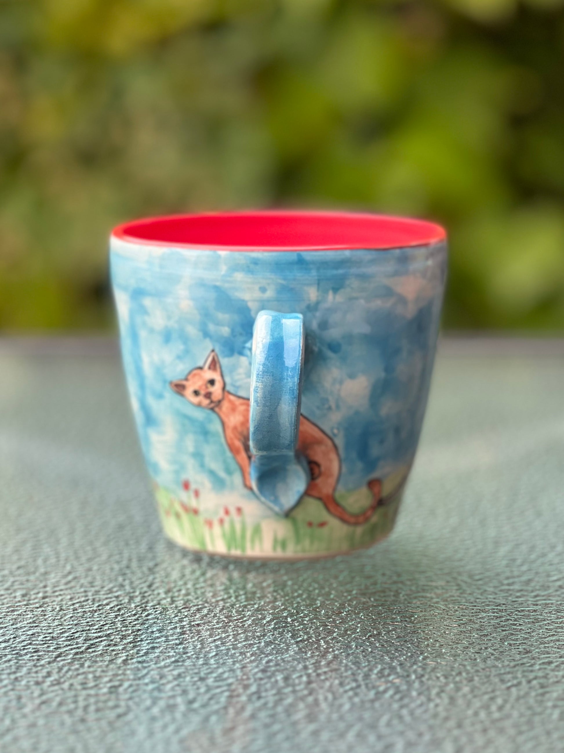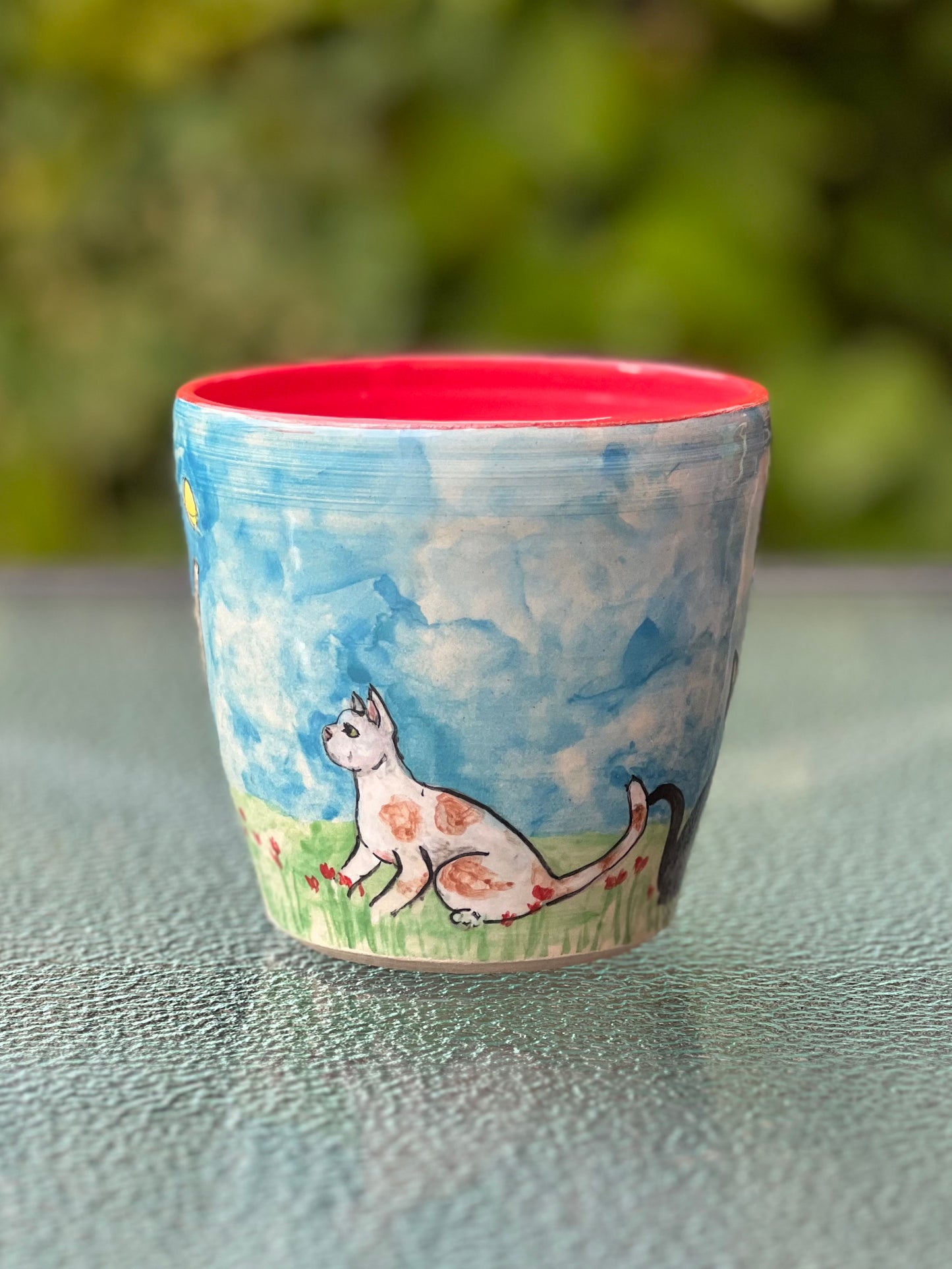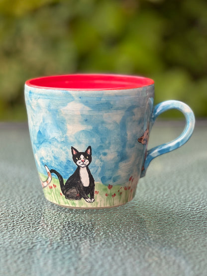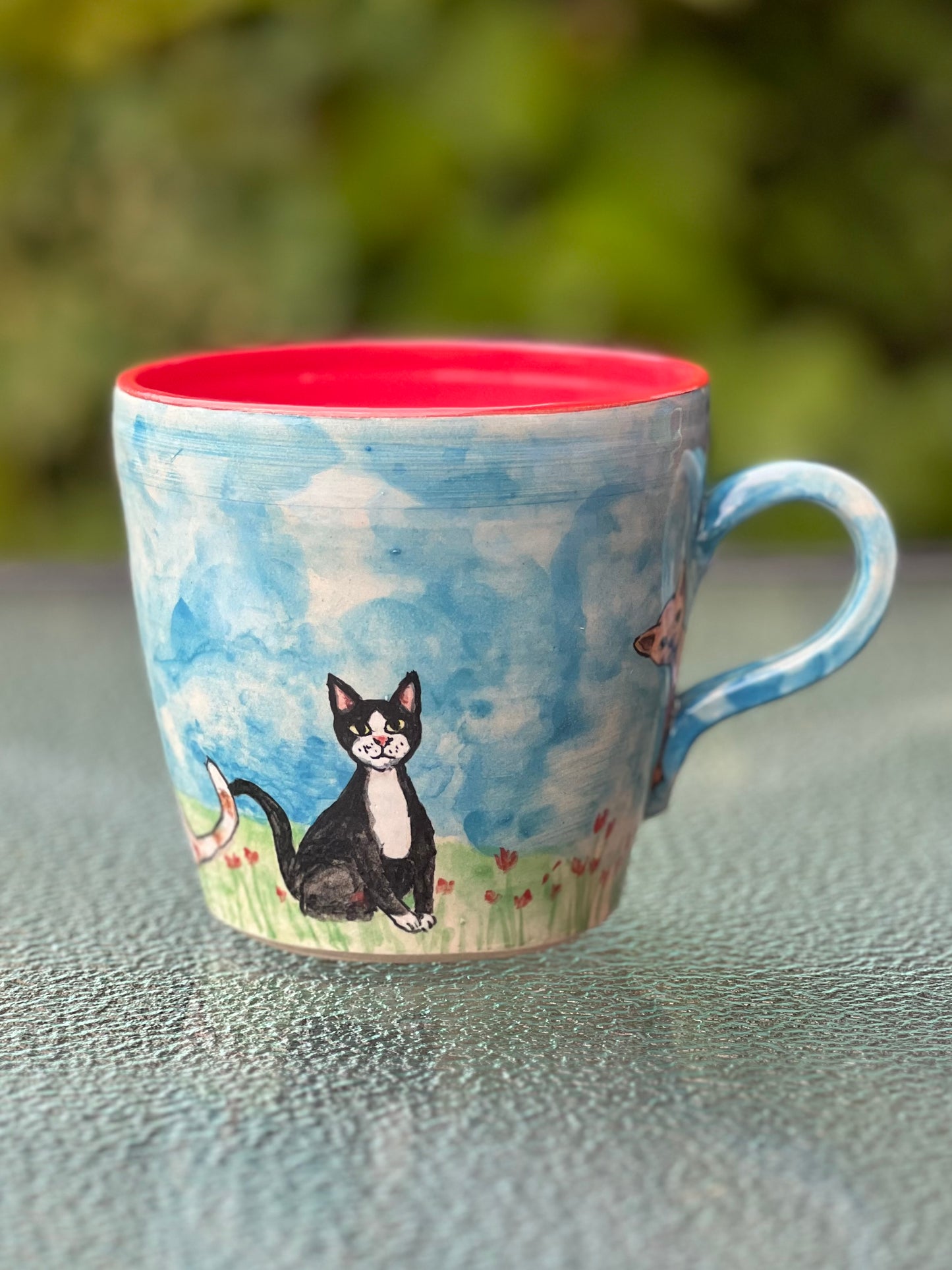 Njut av ditt favoritte eller kaffe i denna charmiga handgjorda stengodsmugg, som visar en glad scen med lekfulla katter på en blomstrande äng. Varje mugg är noggrant drejad och handmålad, vilket gör varje exemplar helt unikt.