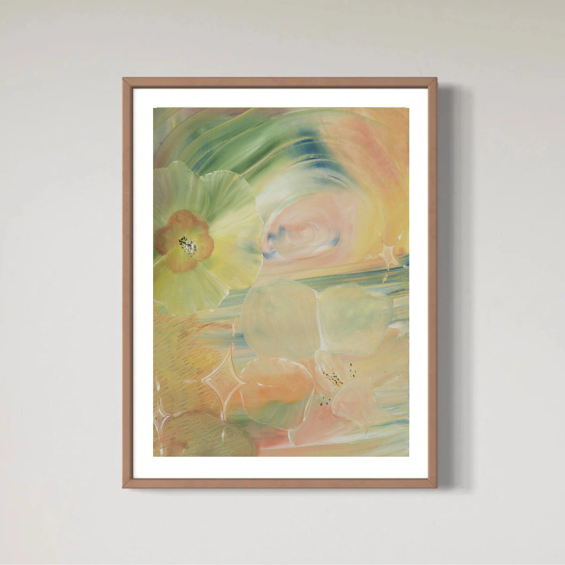Print av en av mina eteriska blomstermålningar som föreställer en hibiskus, orkidé och stjärnor. Printen är huvudsakligen grön med inslag av rosa, orange och blått. Den är tryckt på Posterpapper som mäter 21x30 cm.