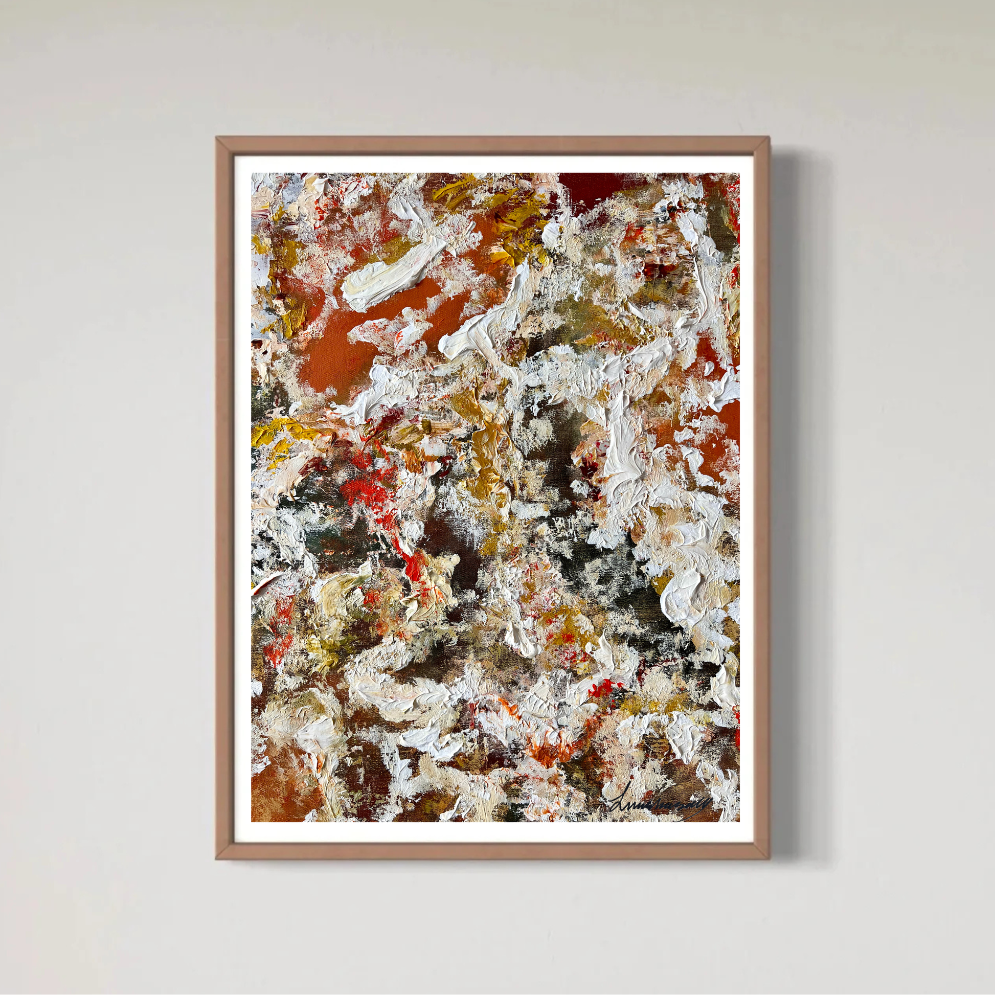 Horizons of October fångar höstens skiftande stämningar i jordiga toner av rött, guld och orange. De djärva strukturerna speglar rörelsen av fallande löv och naturens ständiga förändring — en hyllning till årstidens intensiva och flyktiga skönhet.