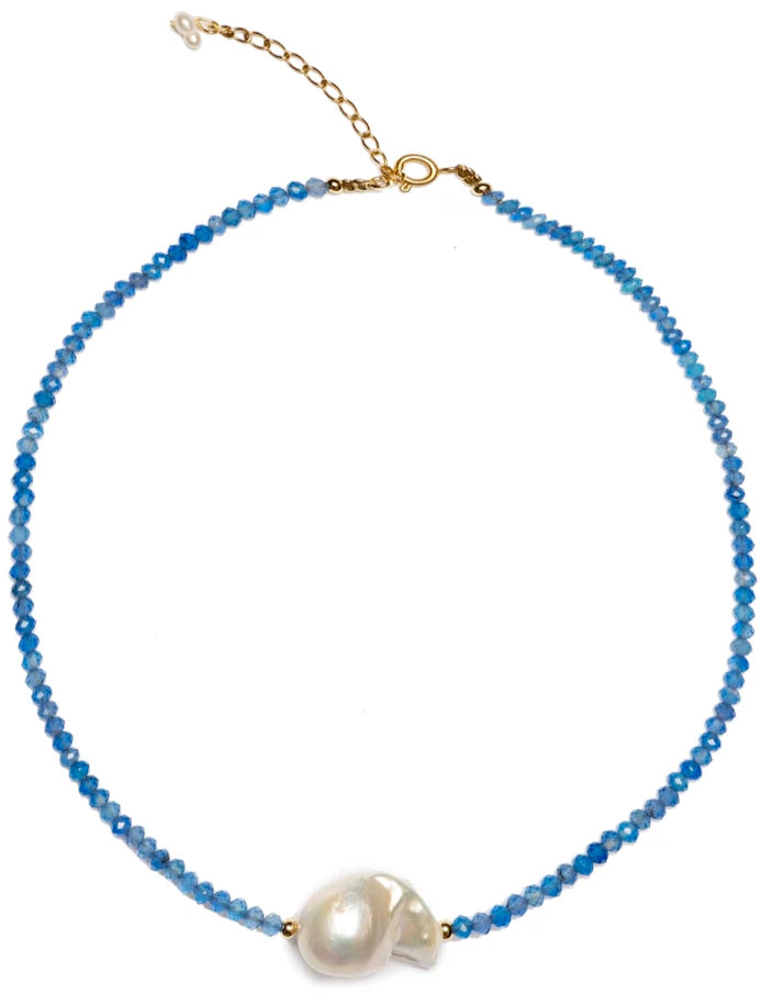 Tillverkad av: Den exklusiva barockpärlan, 18k guldpläterad kedja och blå agat