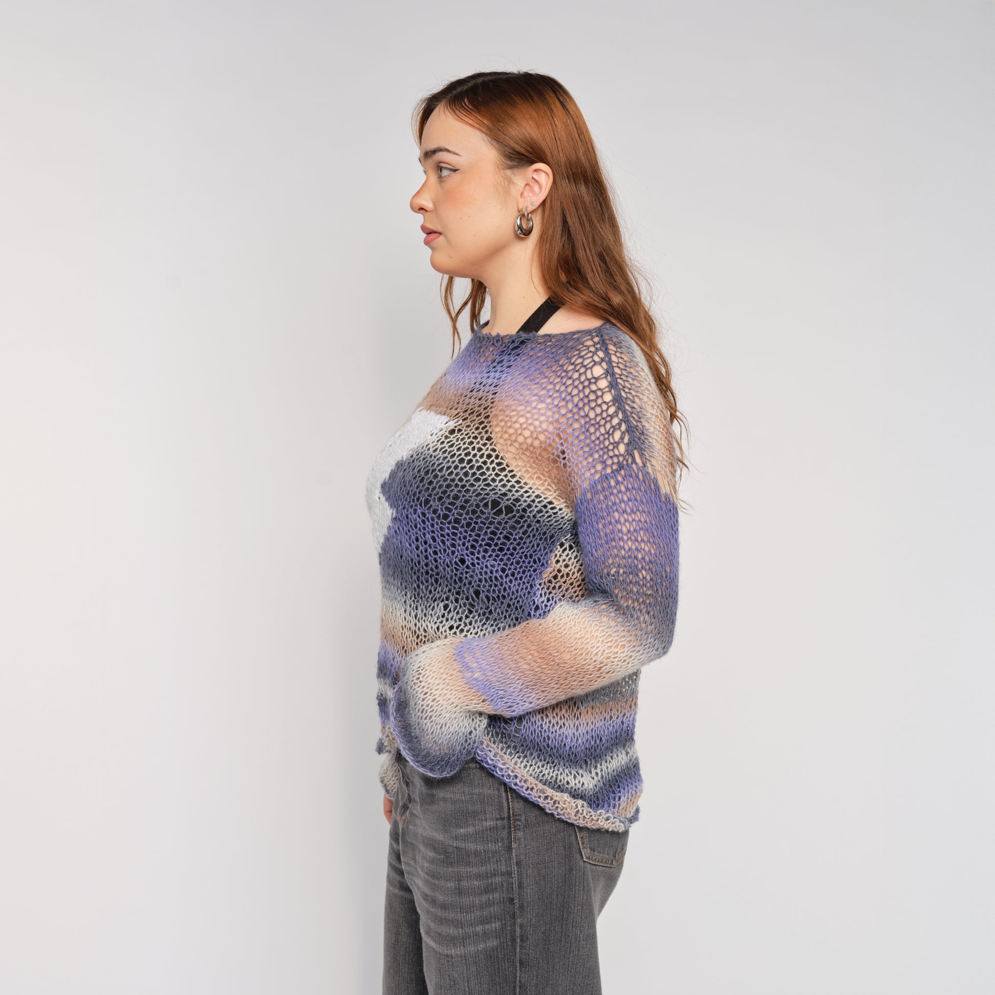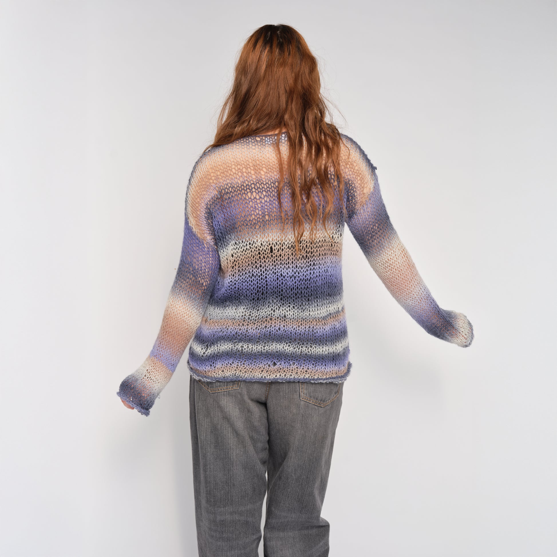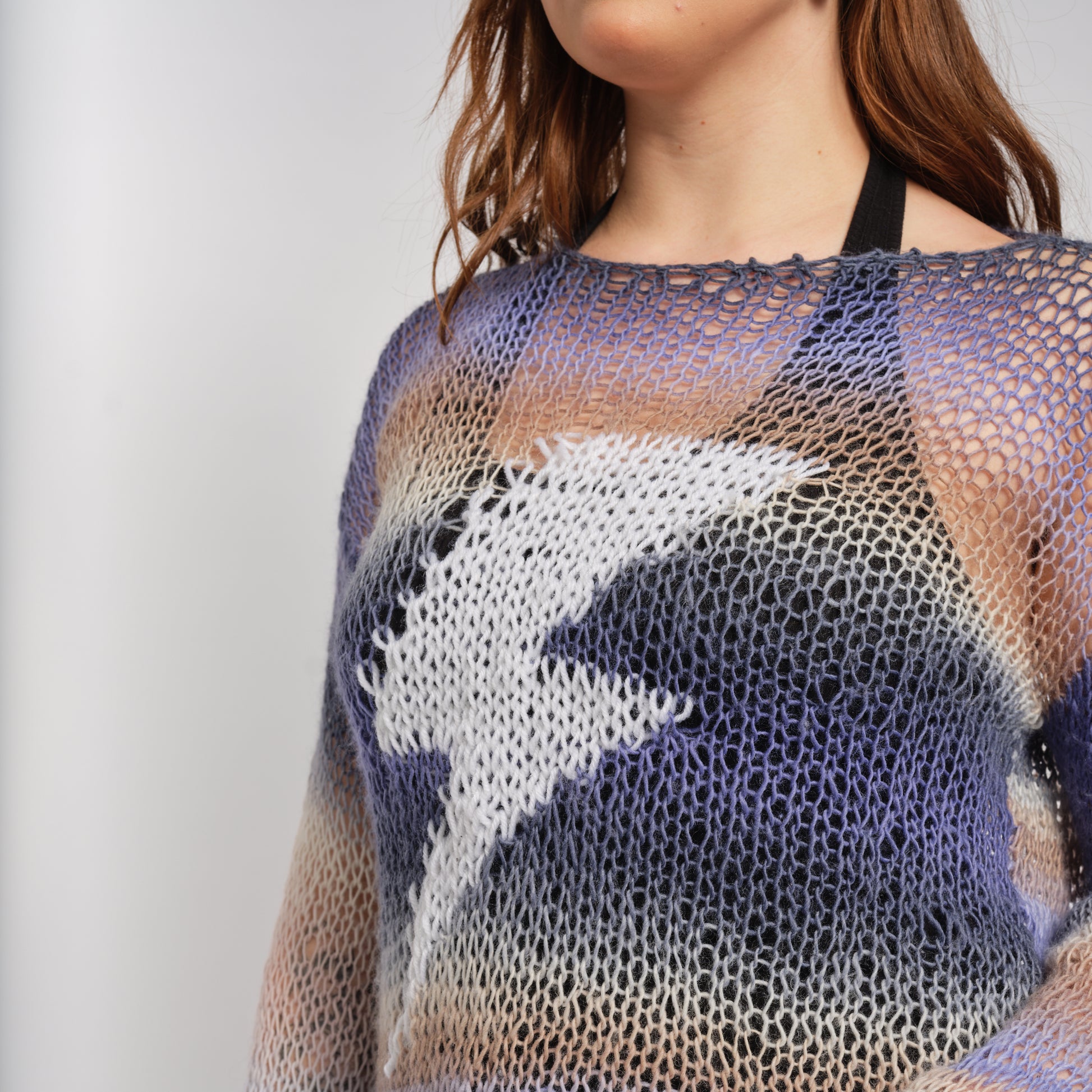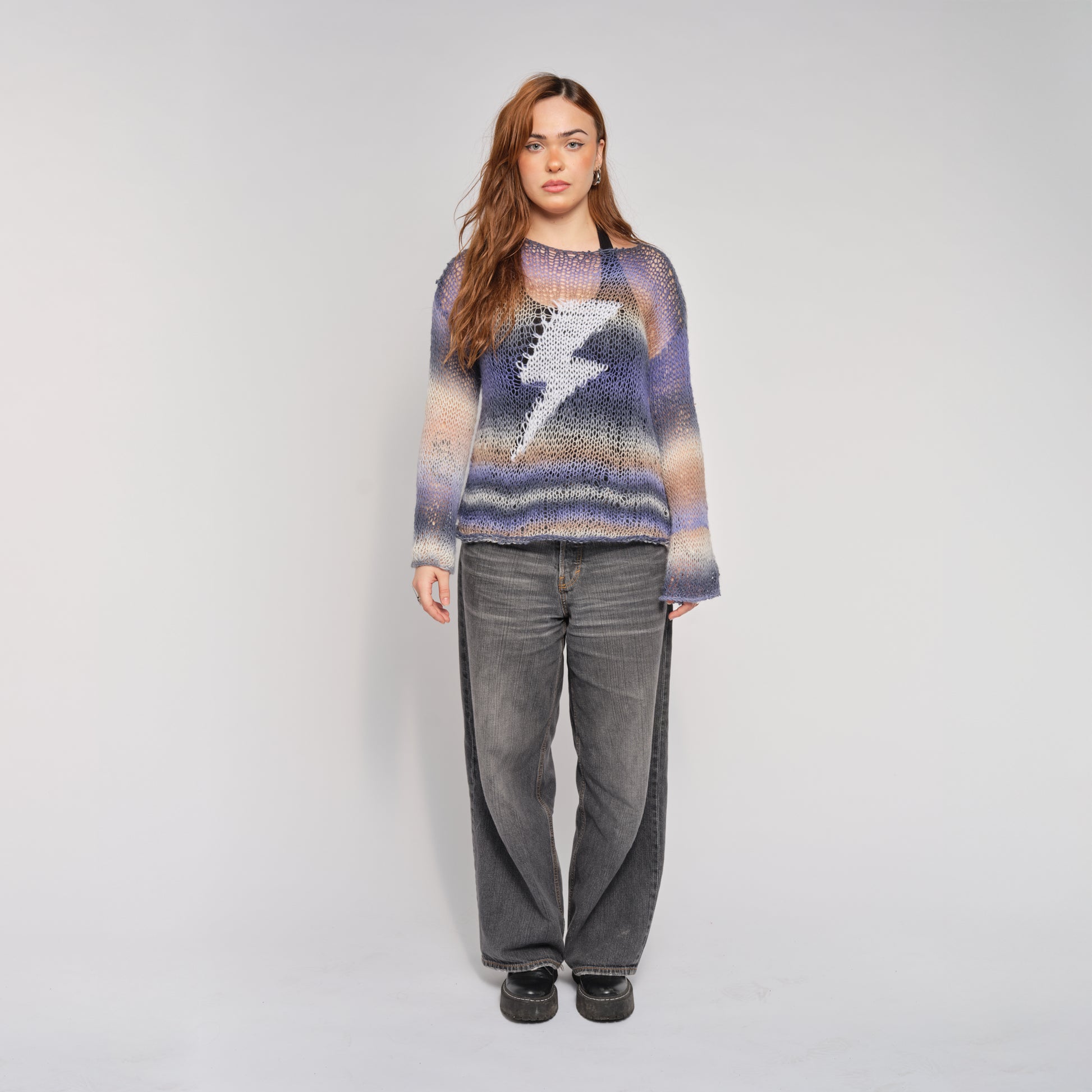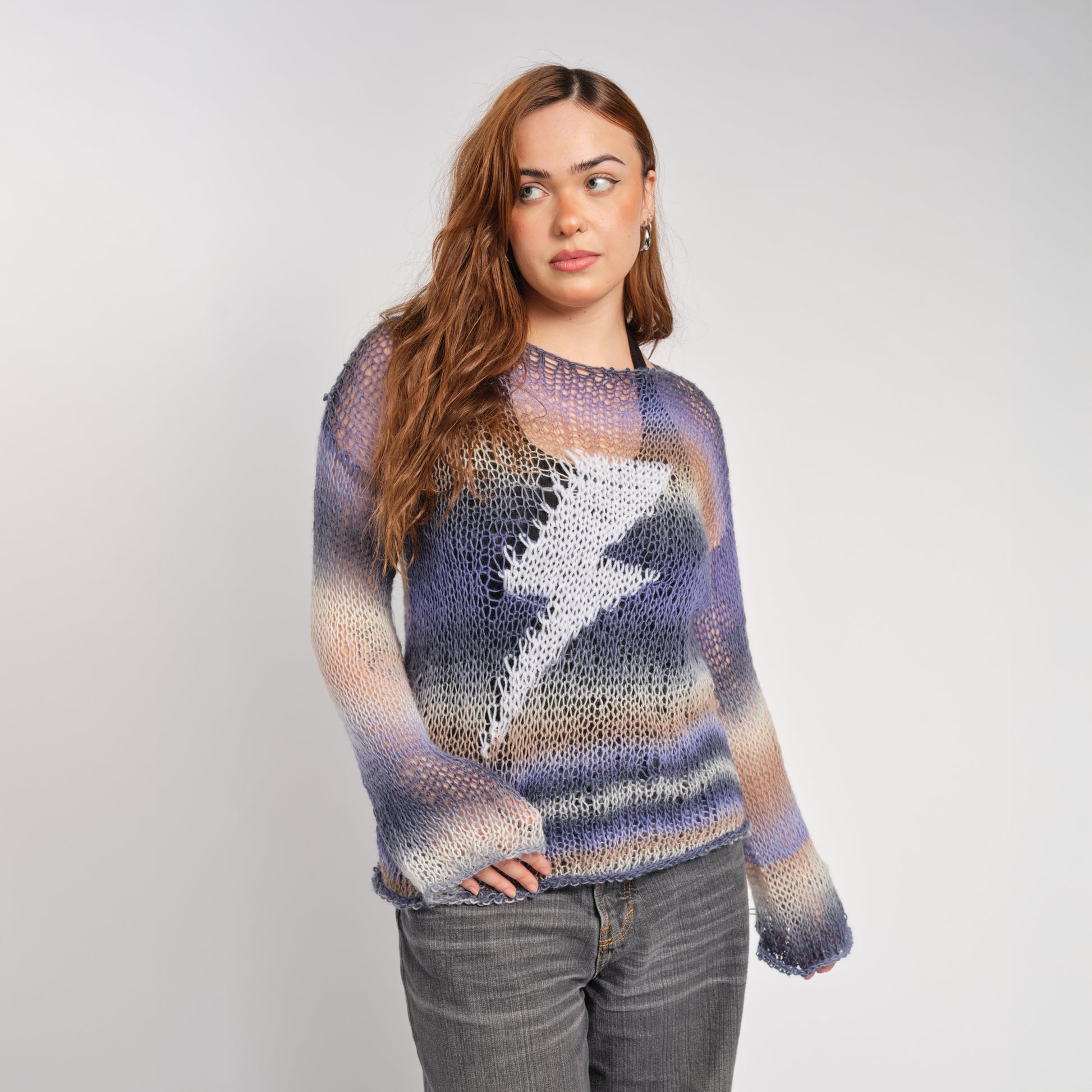 Handstickad tröja med flerfärgat garn och blixtmotiv. Lätt att både klä upp och ner.