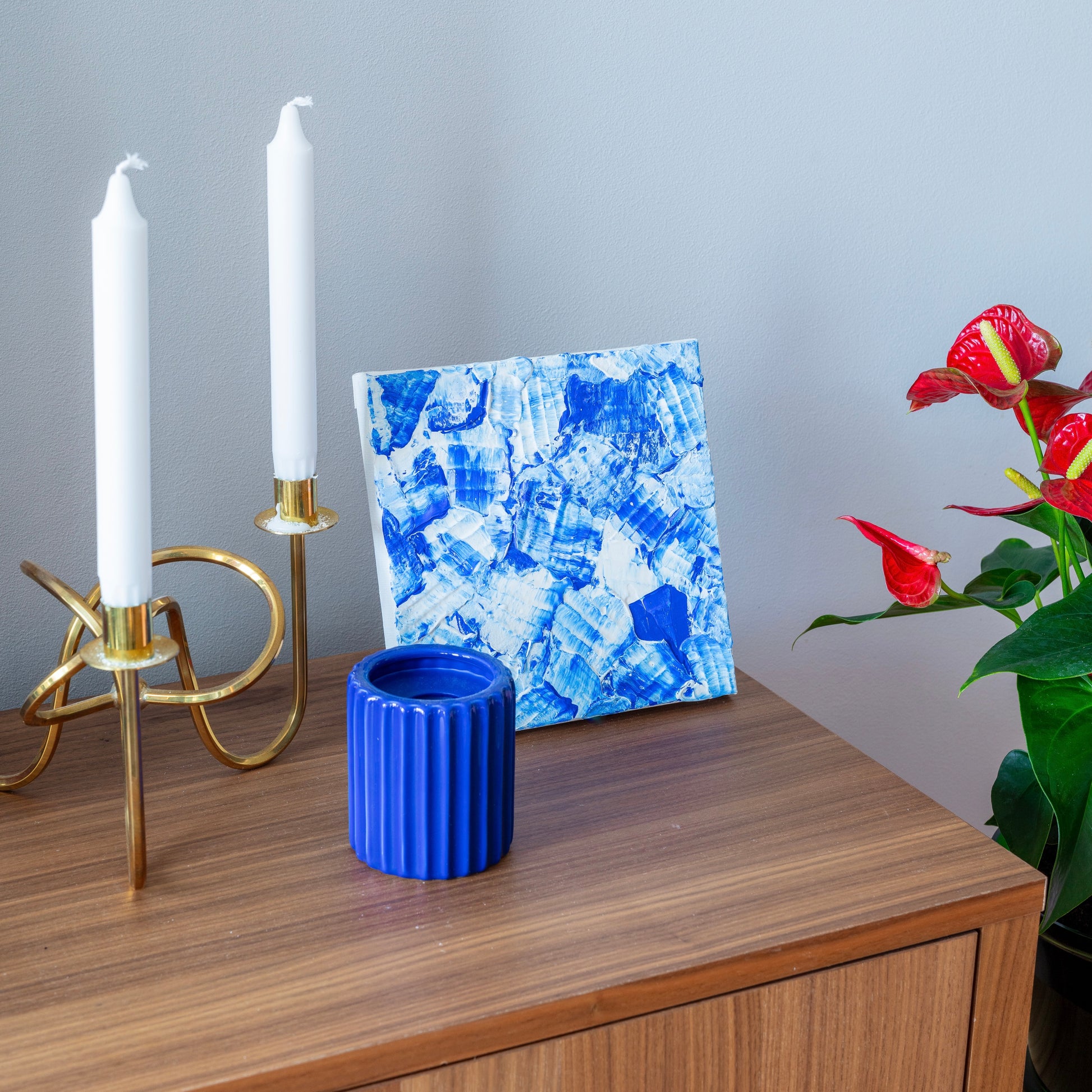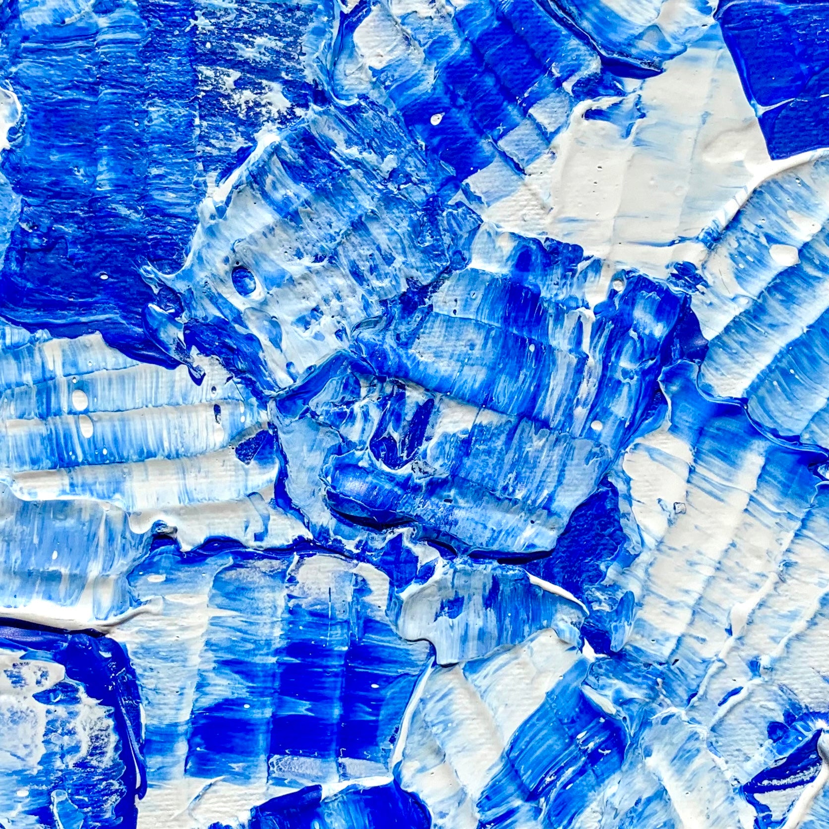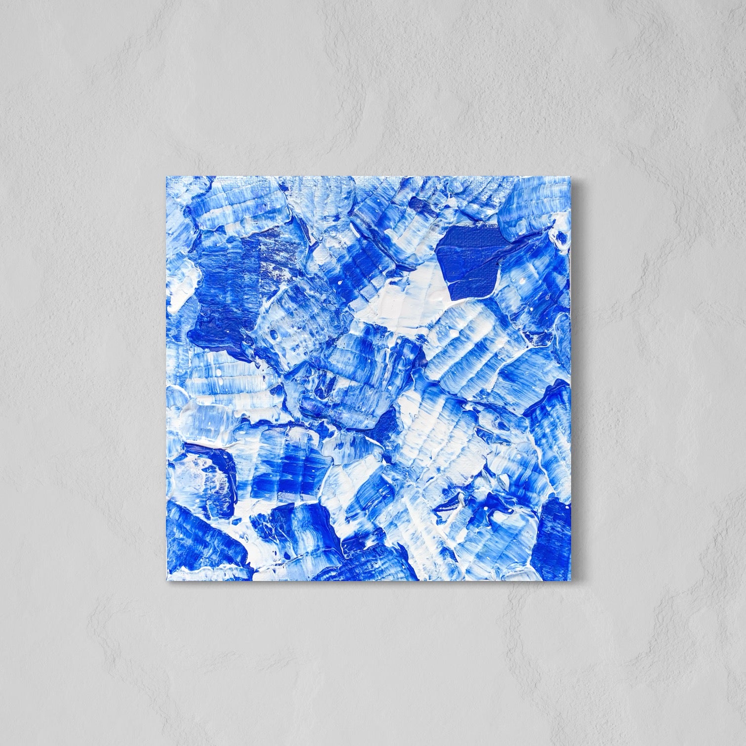 Denna mindre abstrakta målning av Klara Collin är den första i en serie av tre, inspirerad av ögonblicket när en skrivare börjar få slut på bläck. Här skapar vita inslag en fin kontrast till det livfulla blå, och fångar ögonblicket precis innan färgerna börjar blekna.
