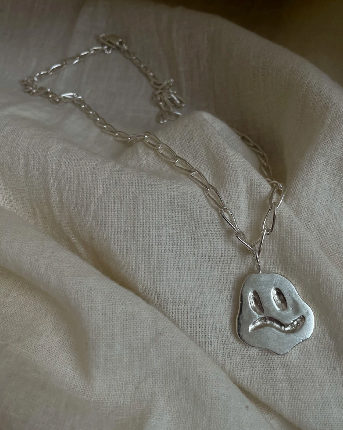 Labil är ett tungt, unikt halsband med en smiley. Varje del skiljer sig från den andra på grund av att den är handgjuten med en unik vaxmodell.
