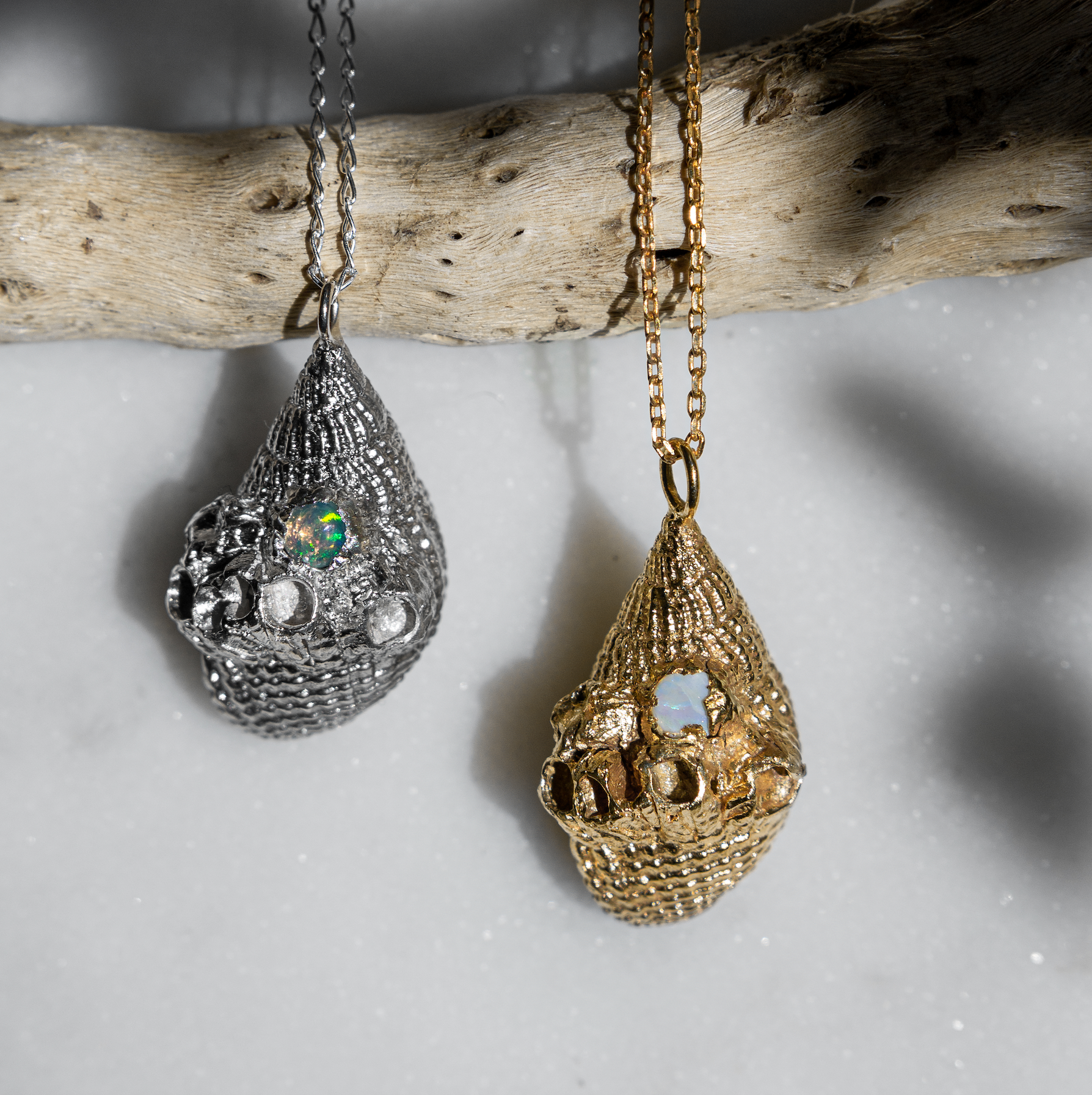 Vårt “Treasure of the Ocean”-halsband med en australiensisk opalsten och ett snäckskal förtrollar dig in i havets värld.