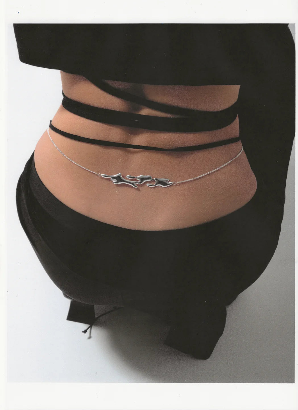 LAÔMA ATELIERs LIQUIFIED TRIBAL kroppskedja kan användas som rygg- eller magkedja för att utforska tillståndet för smältande vax. Ett unikt handgjort kroppssmycke som kommer att lyfta din look.