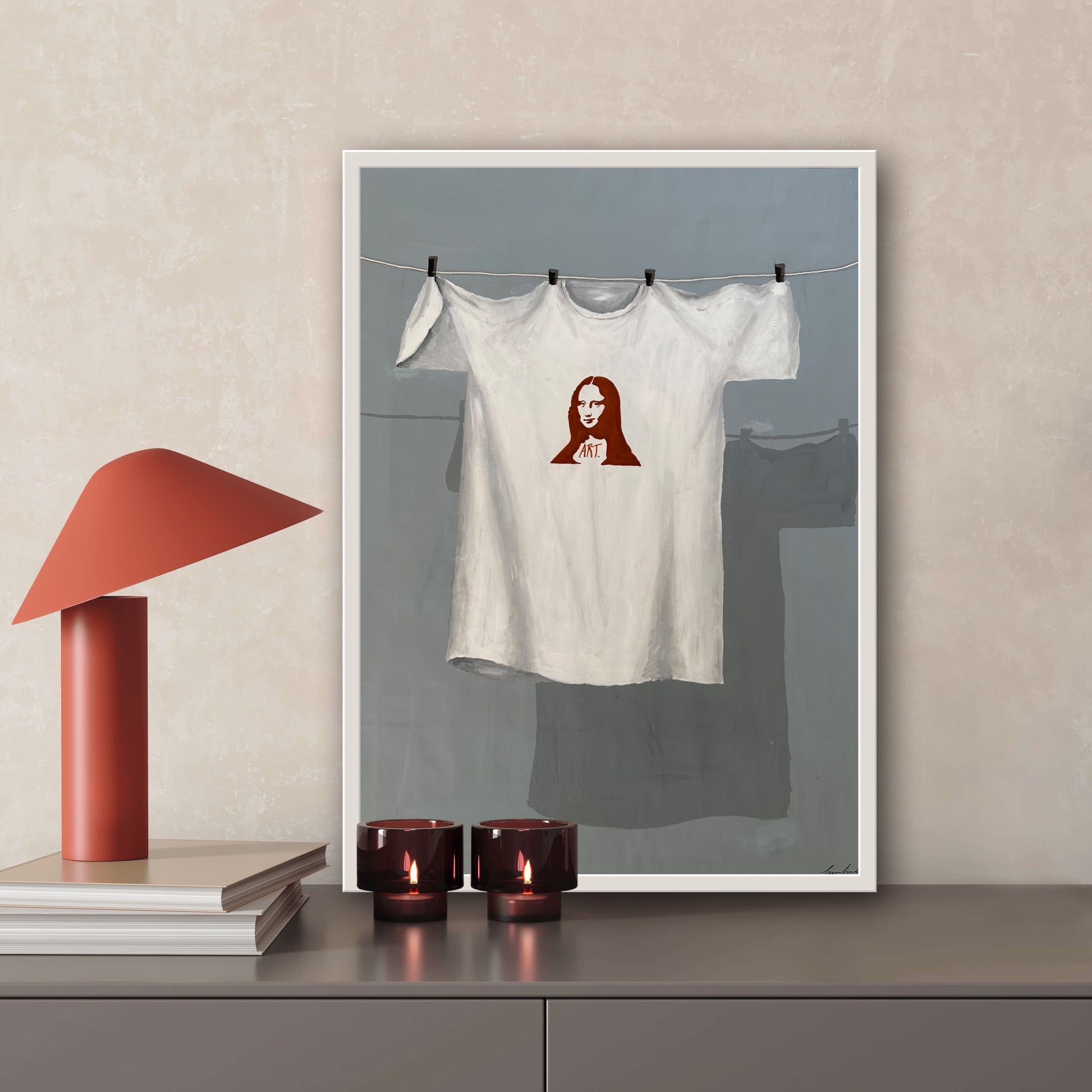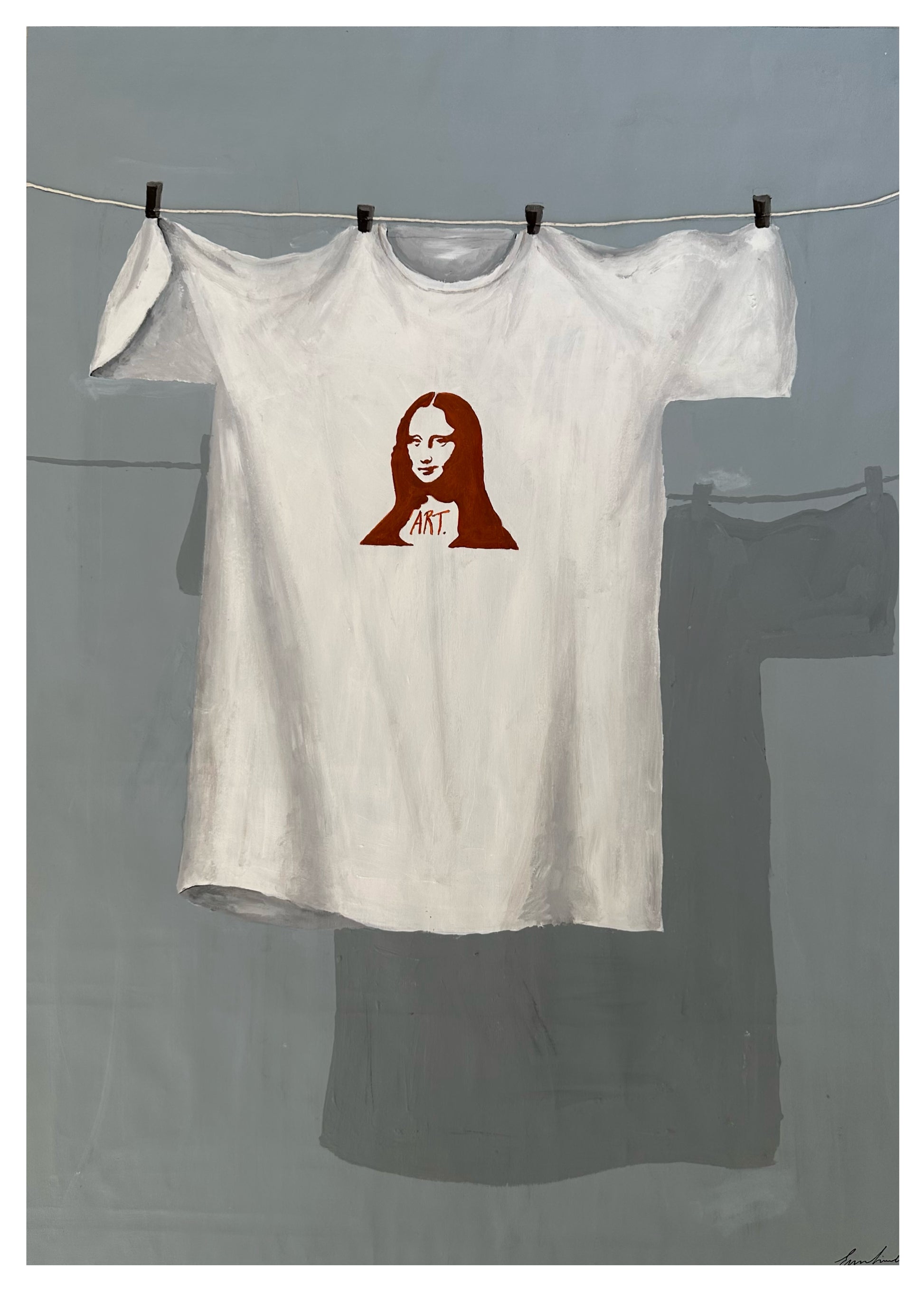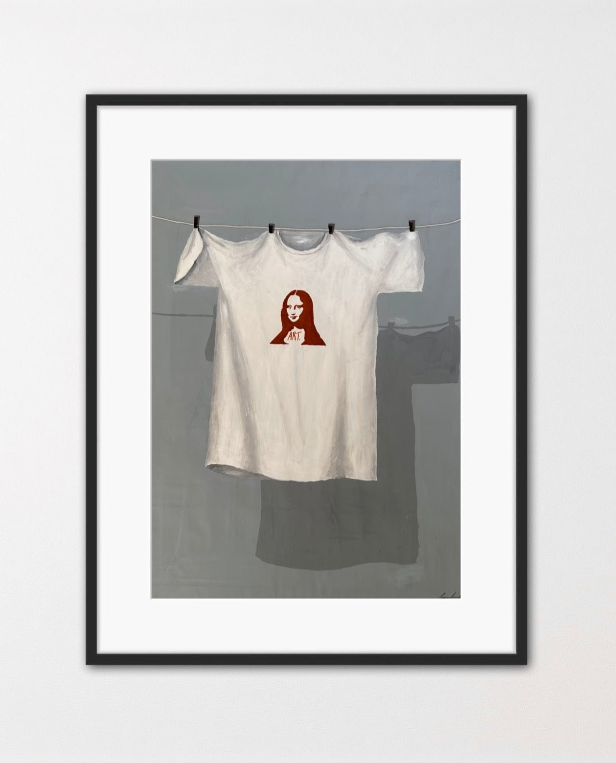 Posterversionen av det unika konstverket "Louvren" som föreställer Mona Lisa på en t-shirt, gjord av den skandinaviska konstnären Emma Lisnell. Har en handgjord och autentisk look och gör din heminredning mer stilfull och roligare.