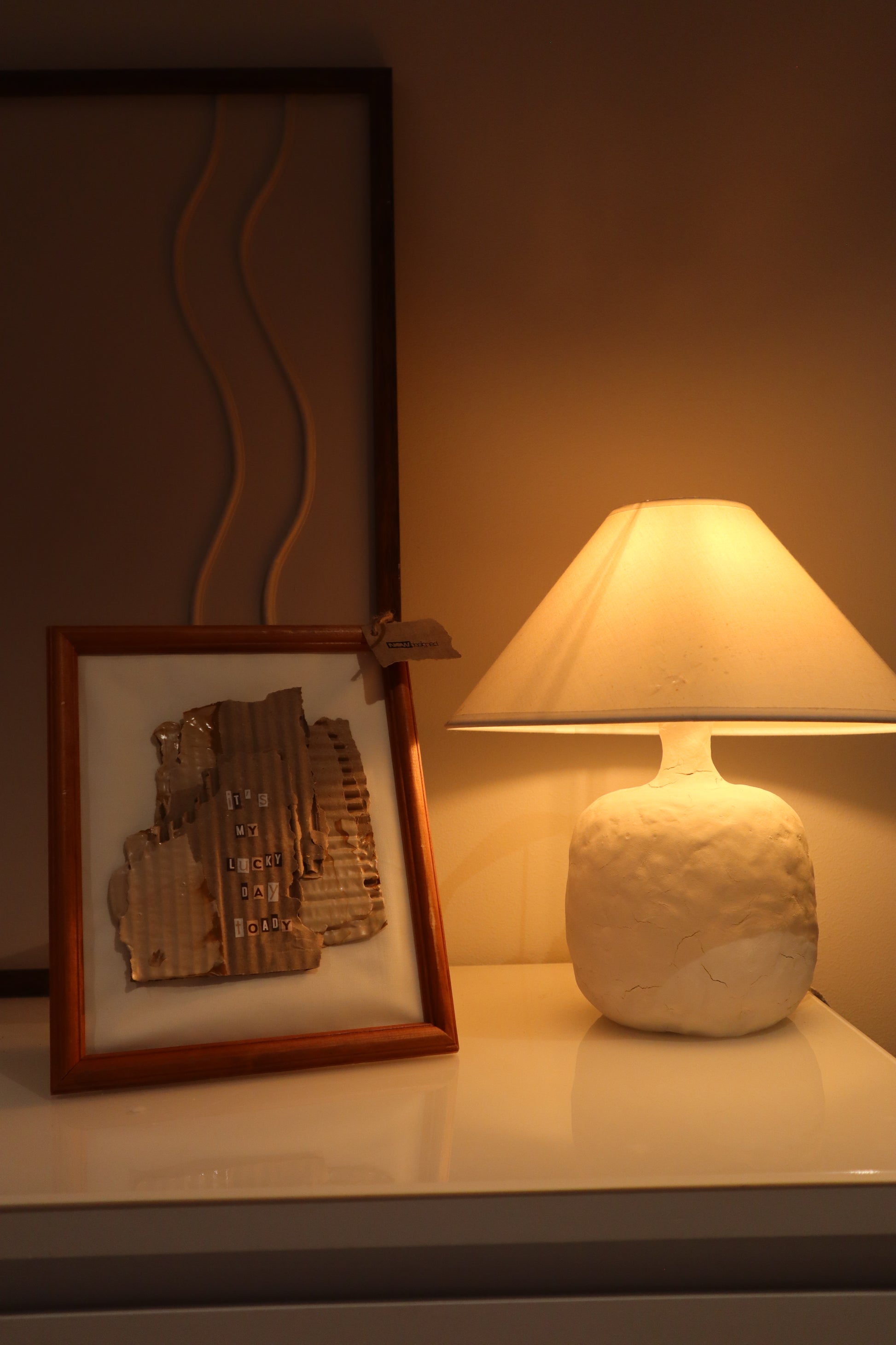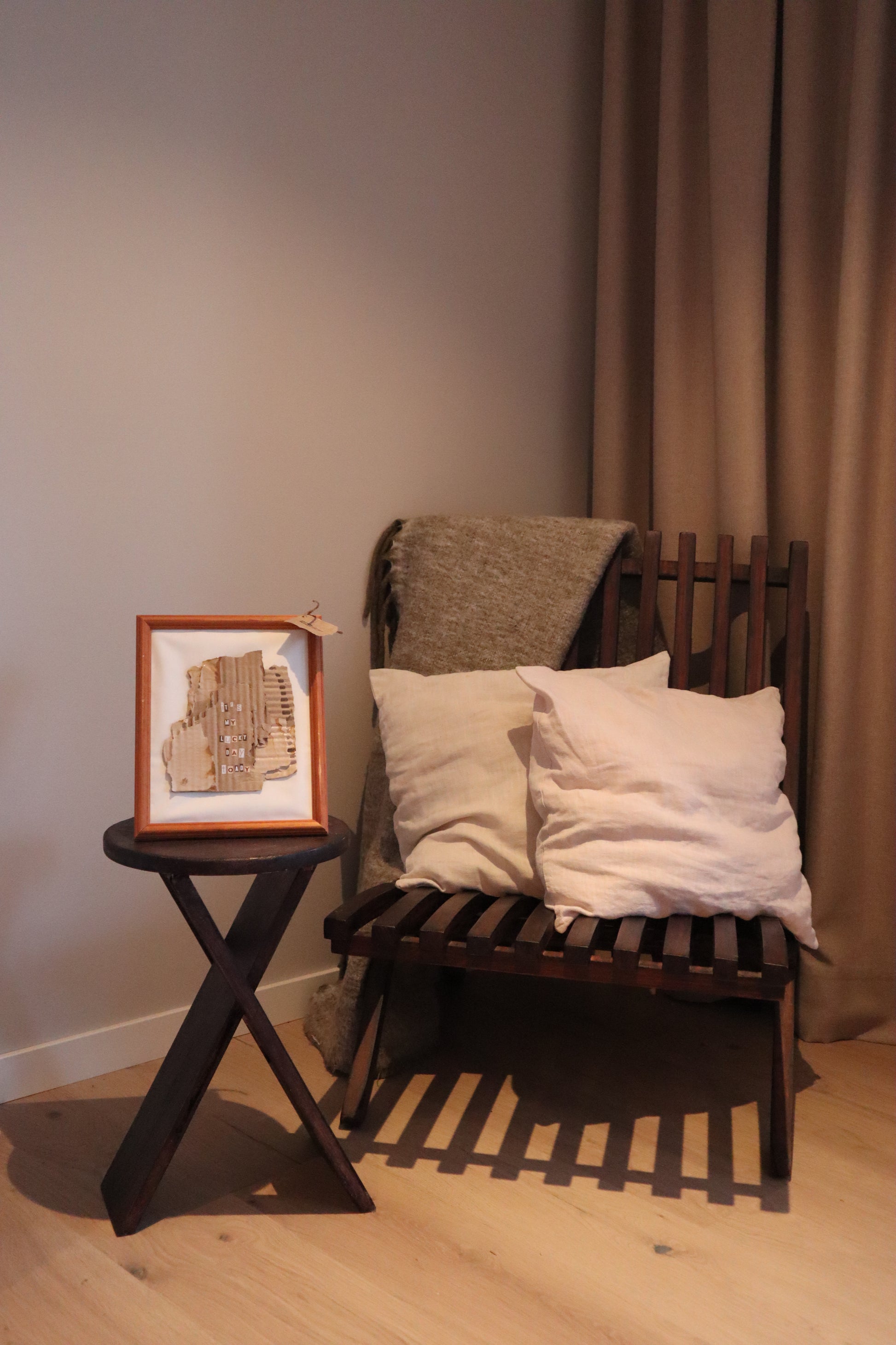 Material: Återvunna material, wellpapp och tidningspapper. Handgjort lim (socker, potatisstärkelse, vatten). Träramar och bomullstyg till bakgrunden är inköpta från secondhandbutiker i Stockholm.