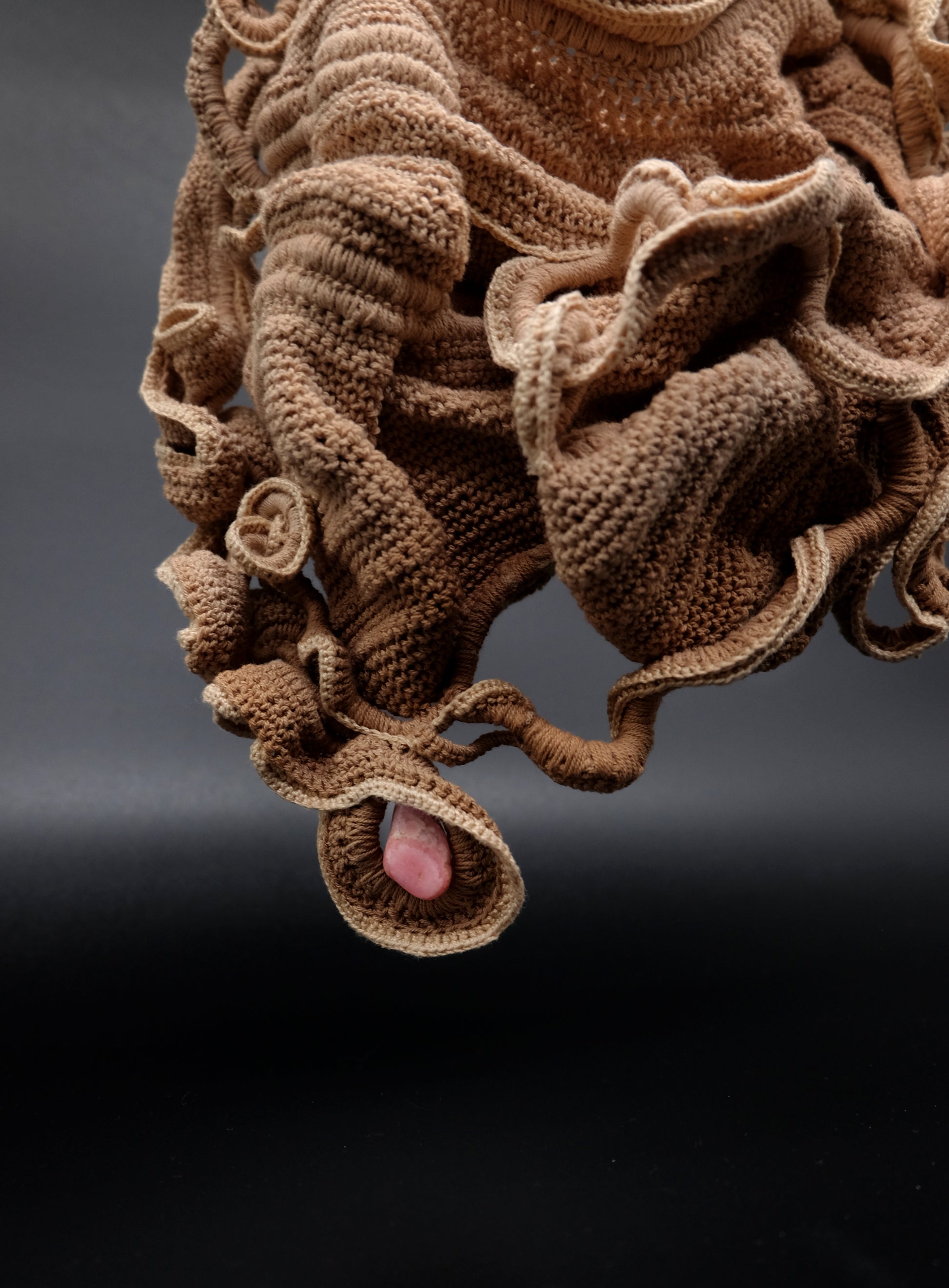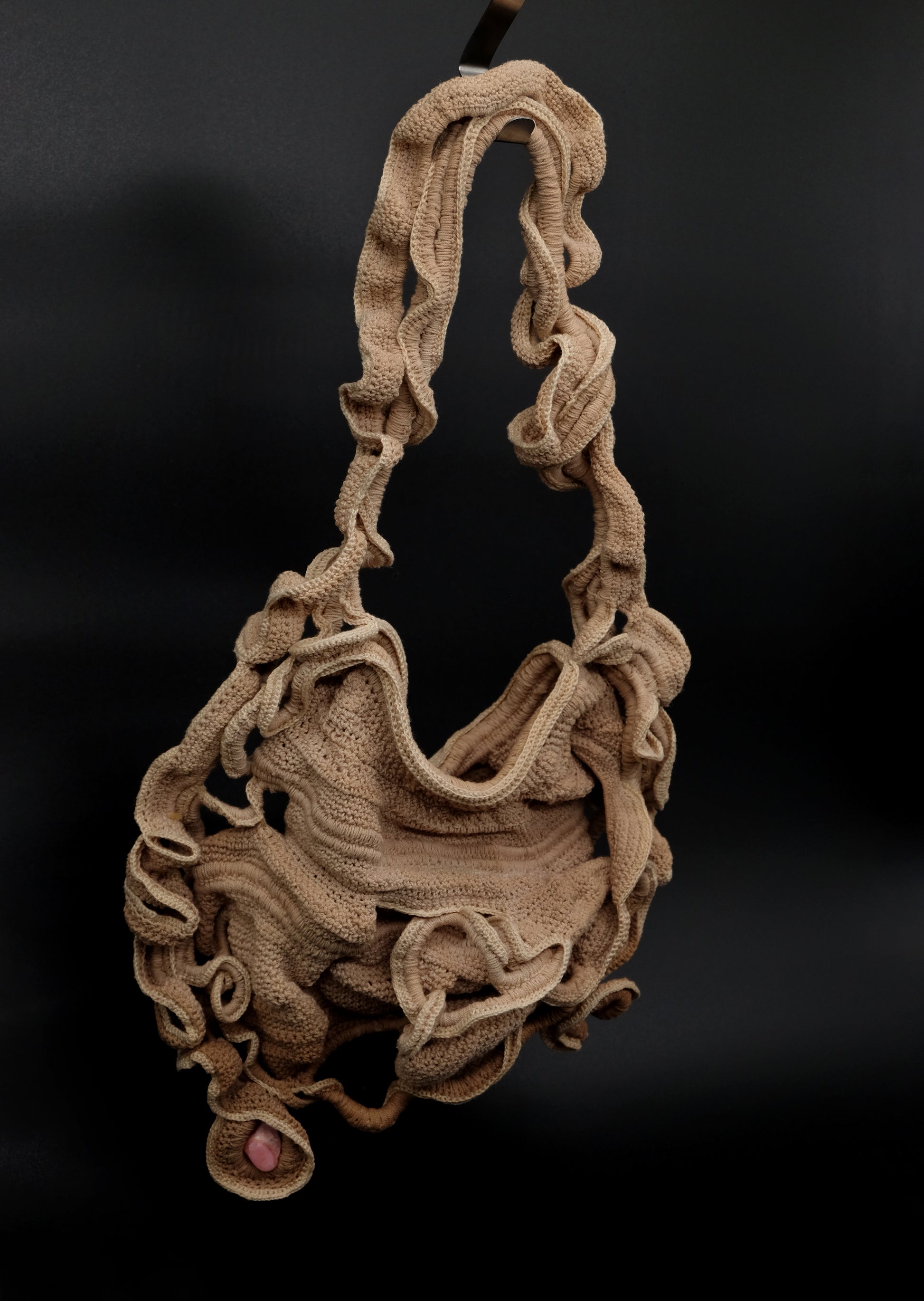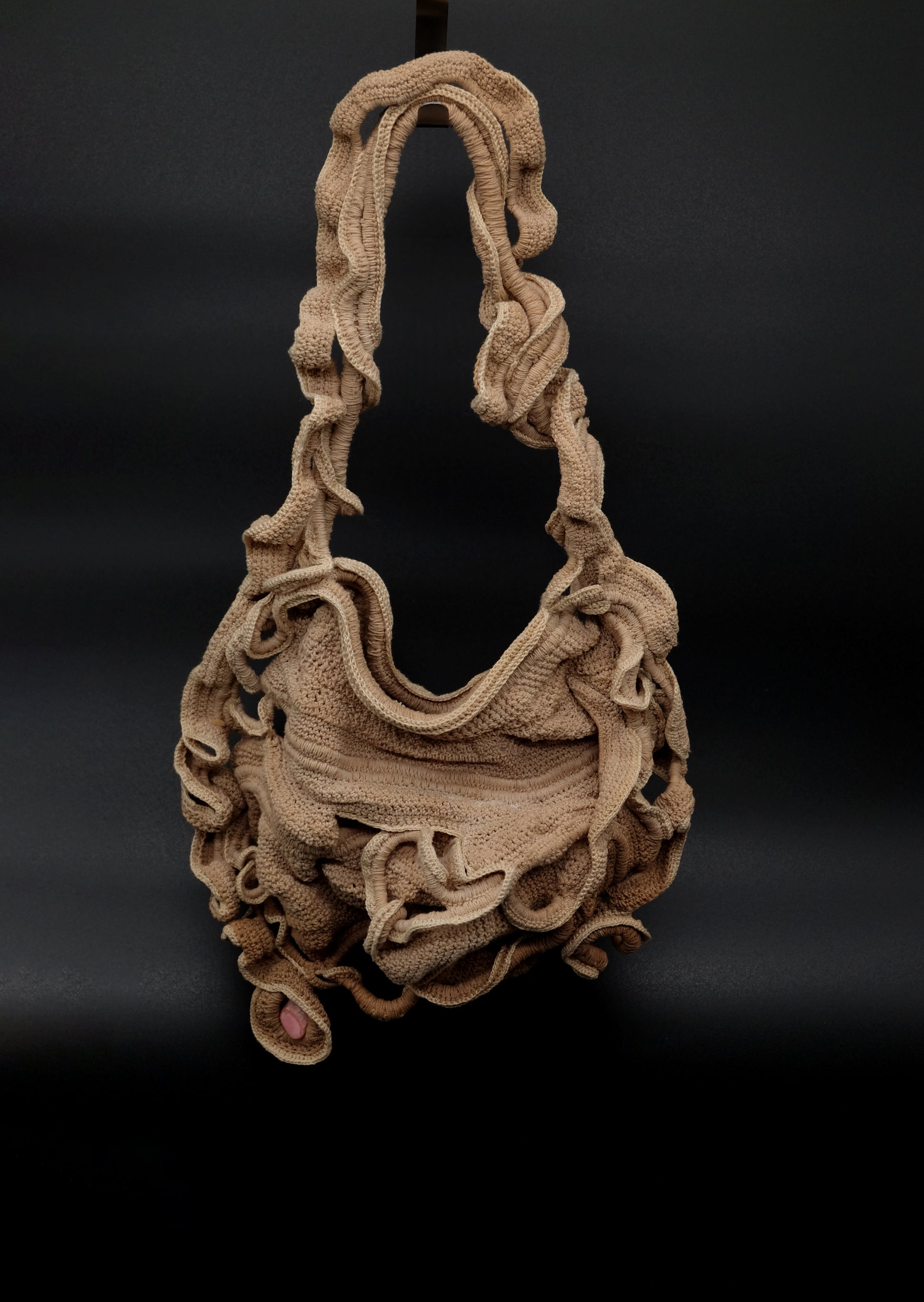 Handgjord i virkad couture med second hand mattvarp, handfärgad med svart te och dekorerad med bomullstråd och en rosa ädelsten.