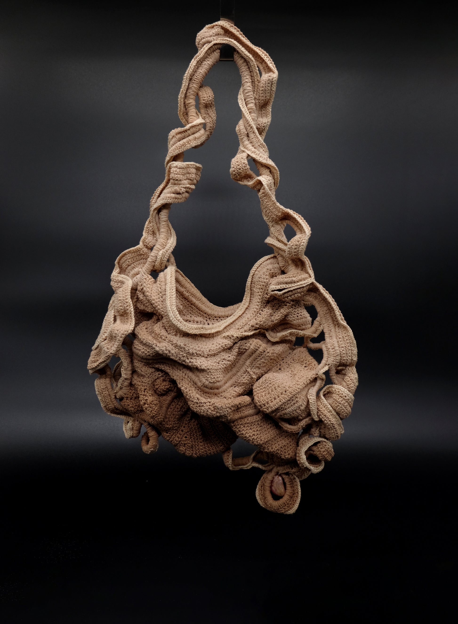 En biomorfisk väska inspirerad av nostalgiska minnen av att hitta de där perfekta rosa snäckorna i sanden. Macoma Balthica [östersjömussla], som sedan den senaste istidens smältning har varit en avgörande del av våra nordiska vattens ekosystem. Macoma Balthica är en skapelse född ur den överväldigande nostalgi ett landskap kan framkalla. Doften av tall, vindens mjuka sus, de gyllene skuggorna i sanden – allt för oss tillbaka till var vi kommer ifrån. Med en öm längtan efter gårdagen, ger den en glimt av att höra hemma på jorden.