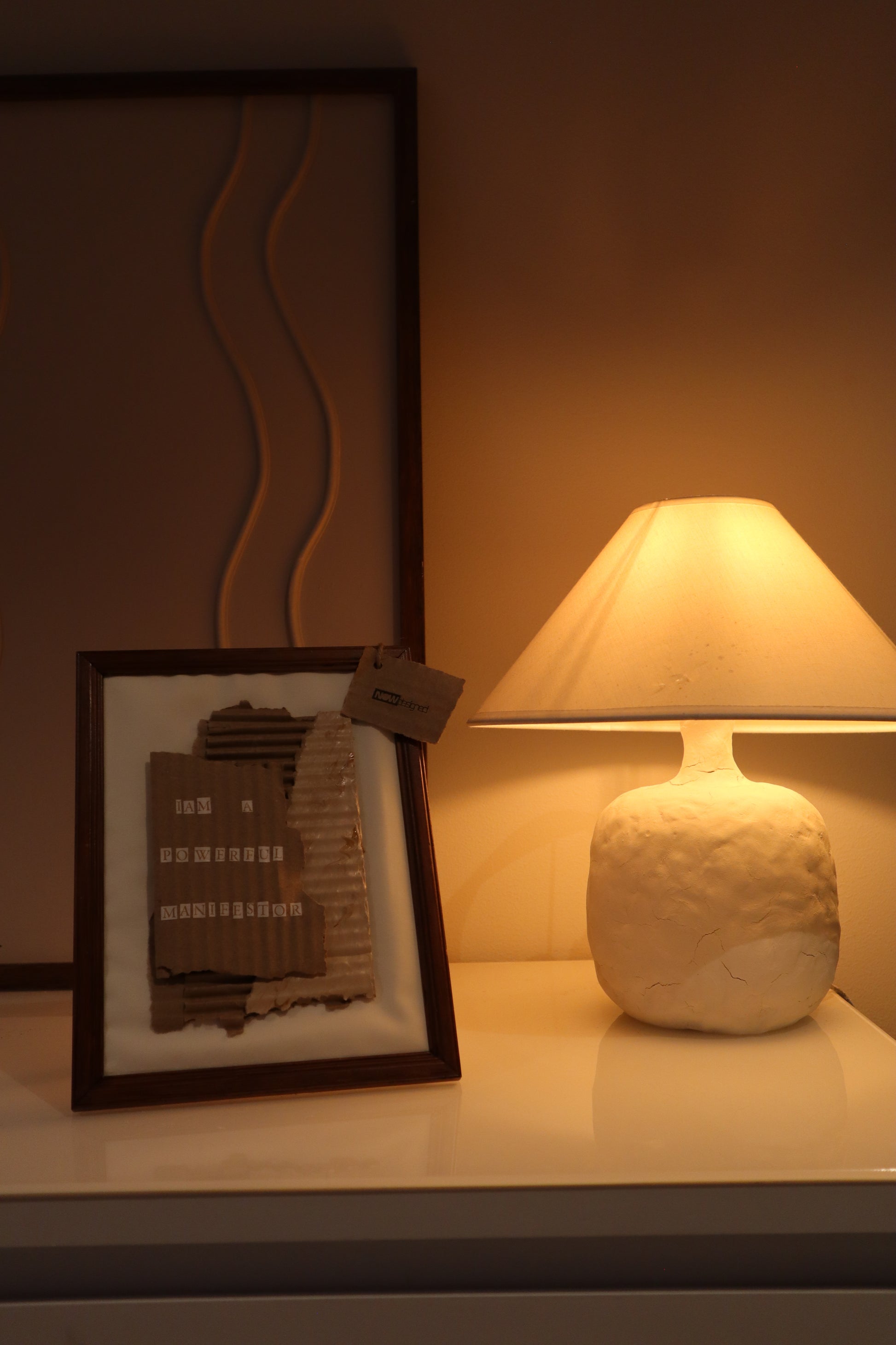 Material: Återvunna material, wellpapp och tidningspapper. Handgjort lim (socker, potatisstärkelse, vatten). Träramar och bomullstyg till bakgrunden är inköpta från secondhandbutiker i Stockholm.