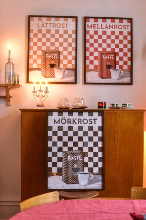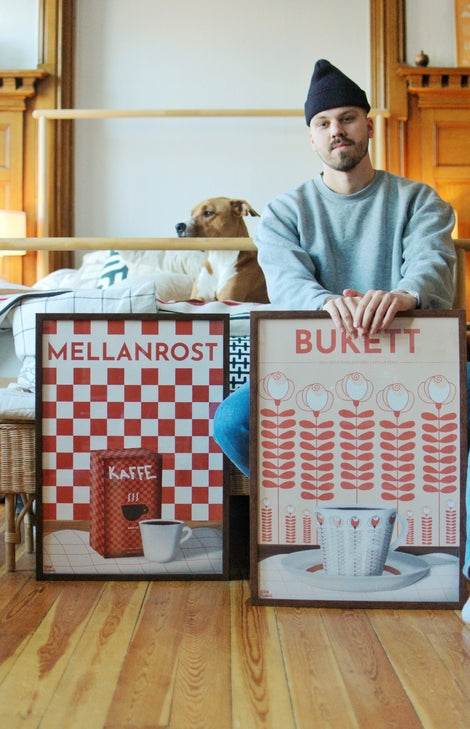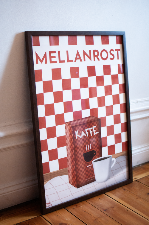 Den grafiska affischen "Mellanrost" av Erik Fläder visualiserar ett kaffepaket med retrodesign på rödrutig bakgrund. Detta är ett unikt, färgstarkt illustrerat tryck som kommer att ge stil och värme till ditt vardagsrum!