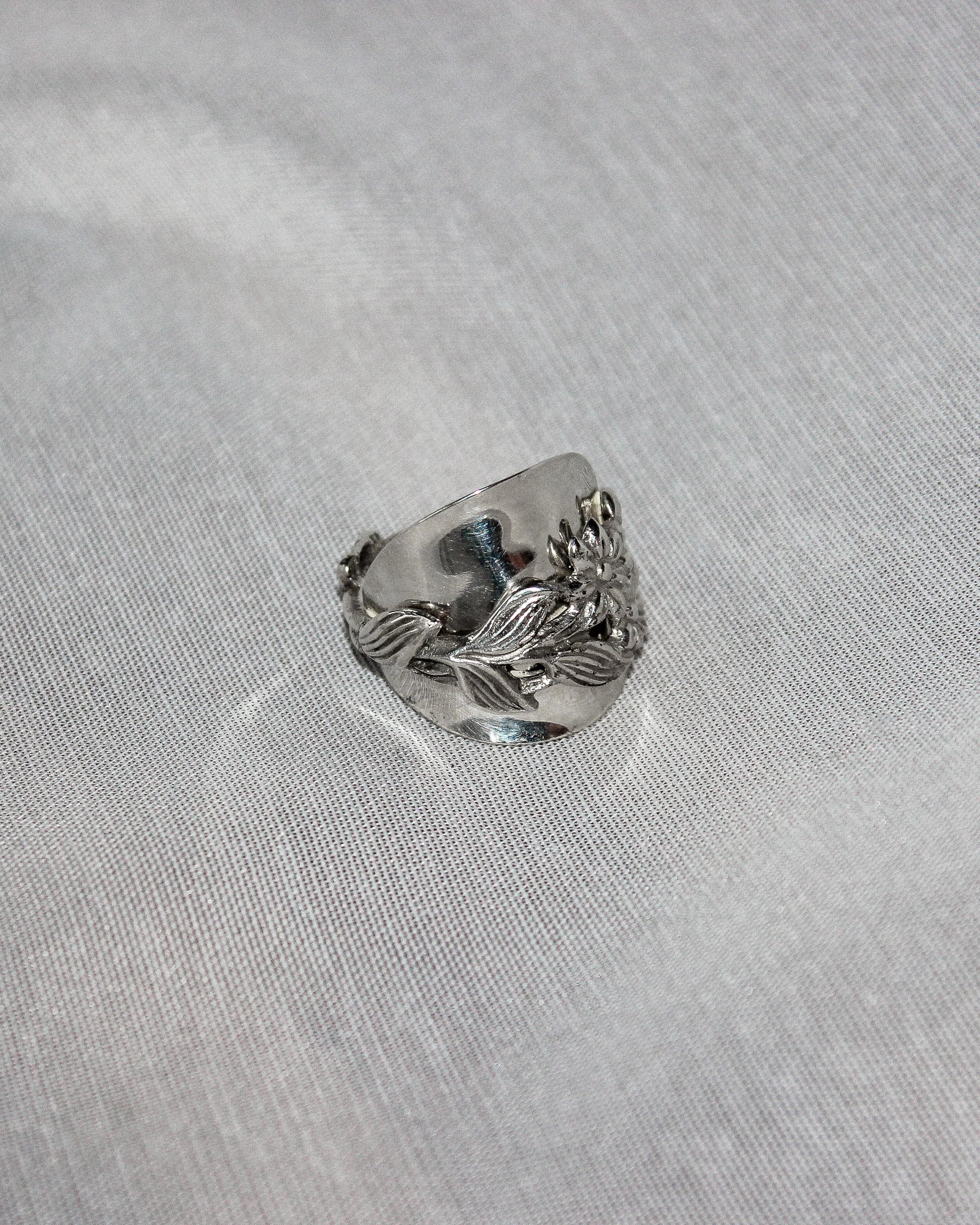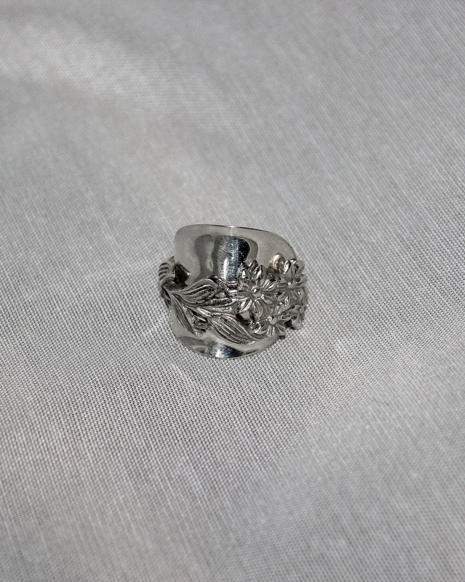 Kollektionen Floran består av smycken med diverse blommor som motiv. Alla smycken är helt tillverkade i silver, vilket gör dem både hållbara och vattentåliga. MIA RING är i storlek 17 och har fyra mindre blommor och blad som leder de upp, passar perfekt för dig som vill bära något både vackert och tidlöst.