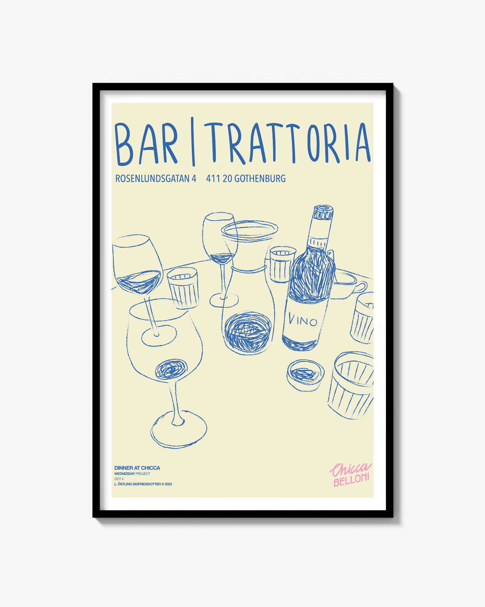 En unik, modern och minimalistisk affisch av duktiga konstnären Louise Östling Sigfridsdotter. "DINNER AT CHICCA" är ett perfekt konstverk för matälskaren och för att göra ditt hem mer personligt och stilrent!