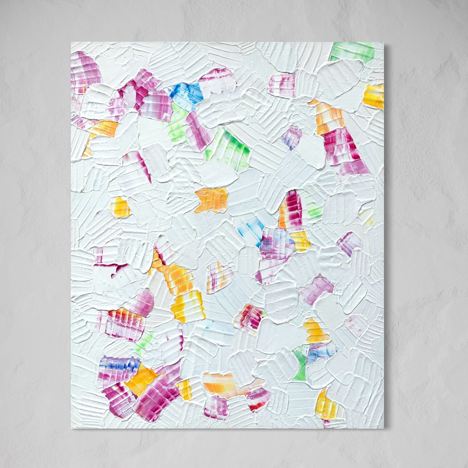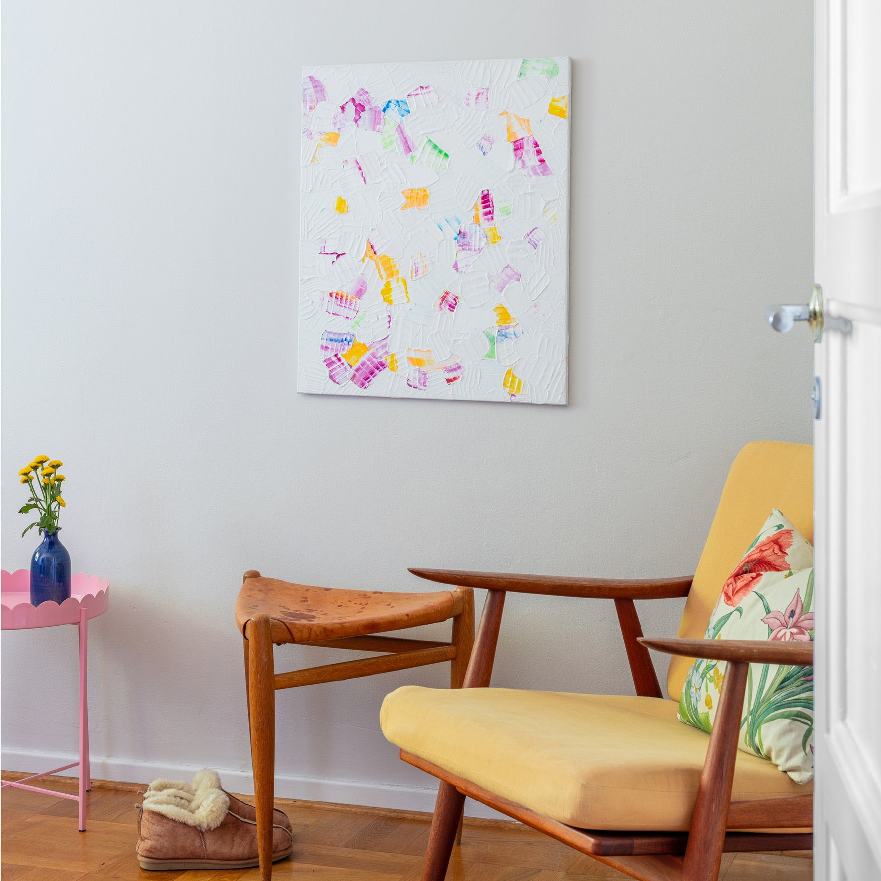 Inspirerad av mjukglass med färgglada strössel, en av konstnärens favoritgodisar under den svenska sommaren. Låt den ljusa målningen ge en lekfull touch av nostalgi. Med sin glada palett är detta verk perfekt för att tillföra livlig energi till dina väggar och hålla sommarkänslan vid liv året runt.