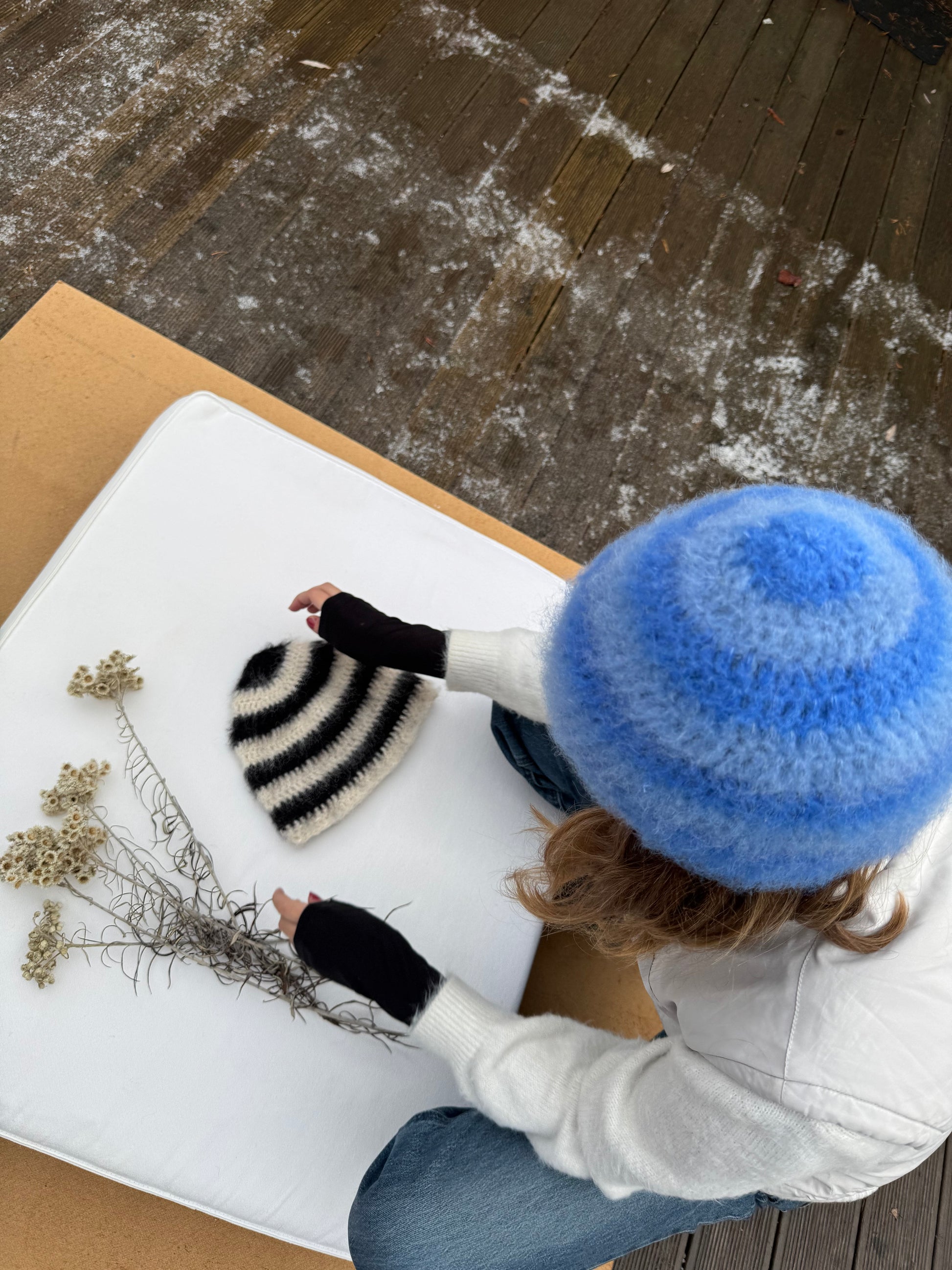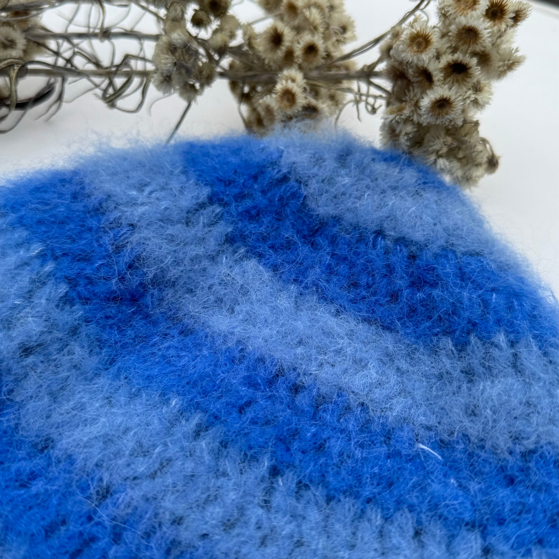 Randig mössa i borstad alpacka som gör den supersoft och håller dig varm! I ljusblått och klarblått.