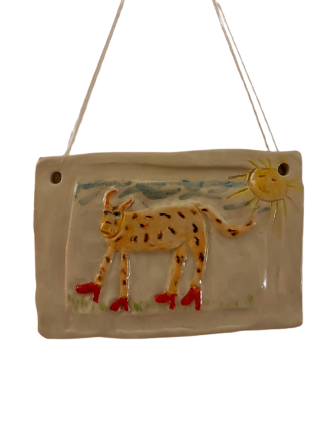 Ute på promenad i mina nya röda skor. Stengods. Väggdekoration. Två hål för snöre (ingår) att hänga upp på väggen.