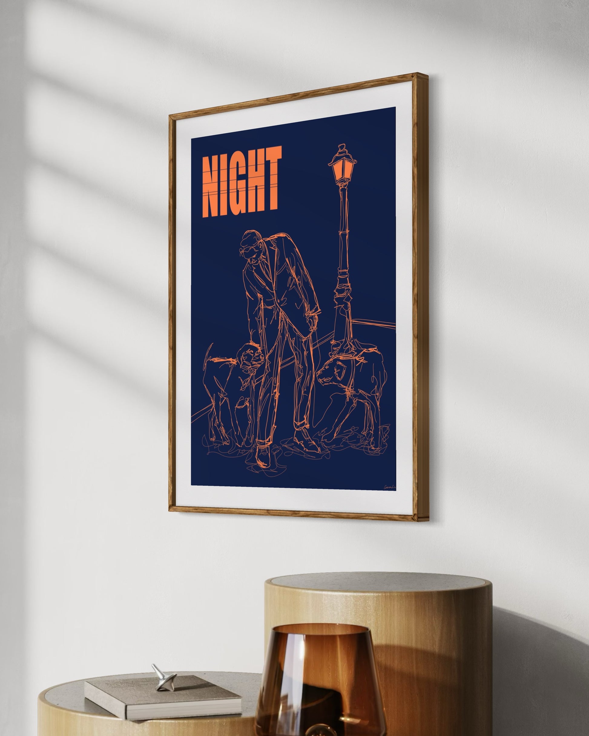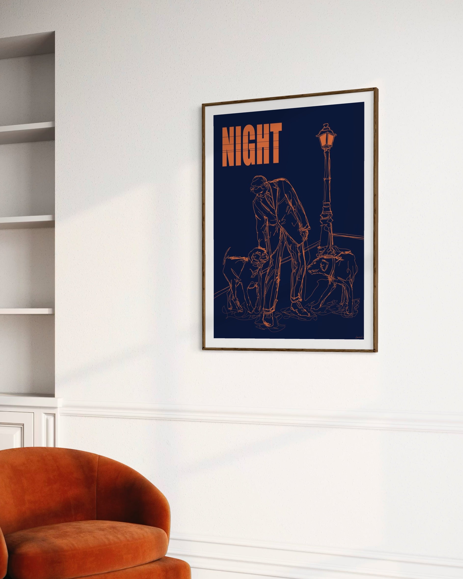 Night är en del av affischserien "A day" skapad av Emma Lisnell. Med sitt sofistikerade motiv och kontrasterande färgtoner fångar denna affisch nattens mystik och stillhet. Perfekt för att skapa en modern och stämningsfull känsla i ditt hem, blir den en elegant detalj som förhöjer vilket rum som helst.
