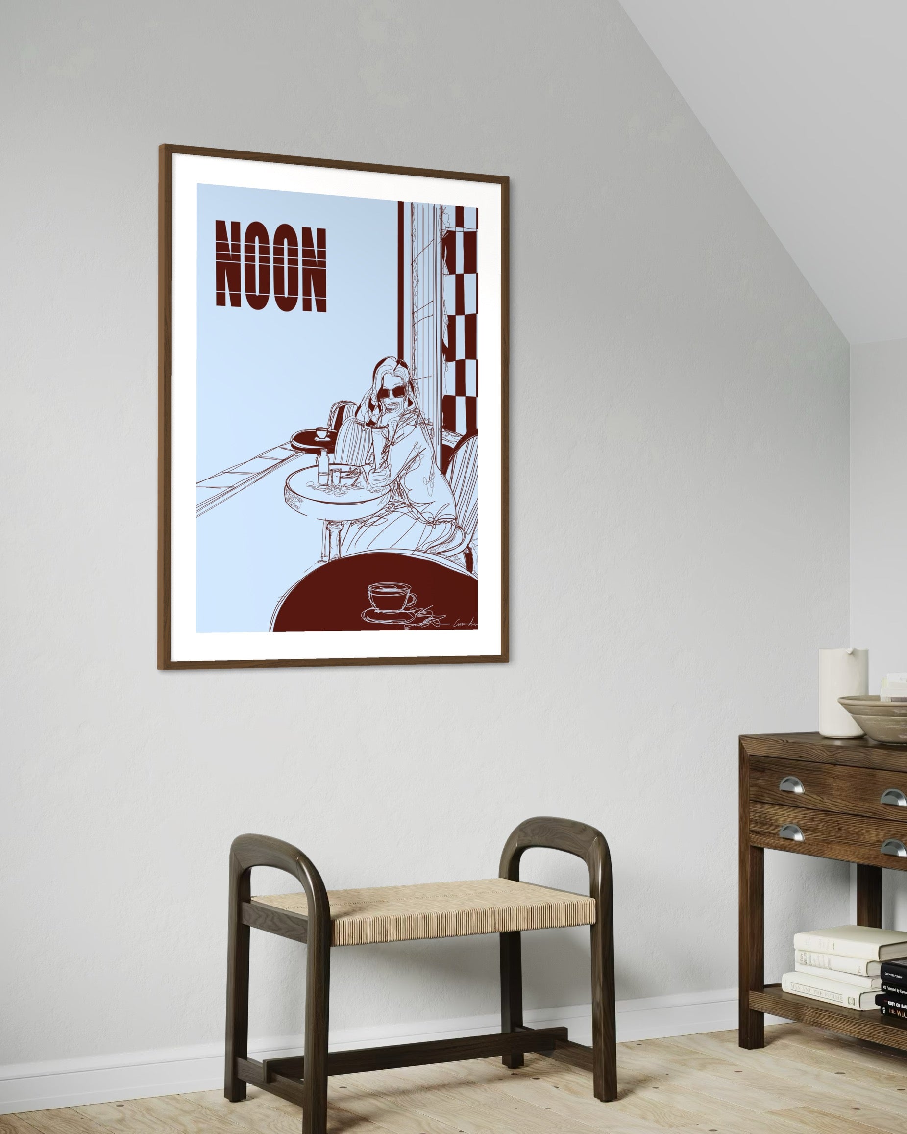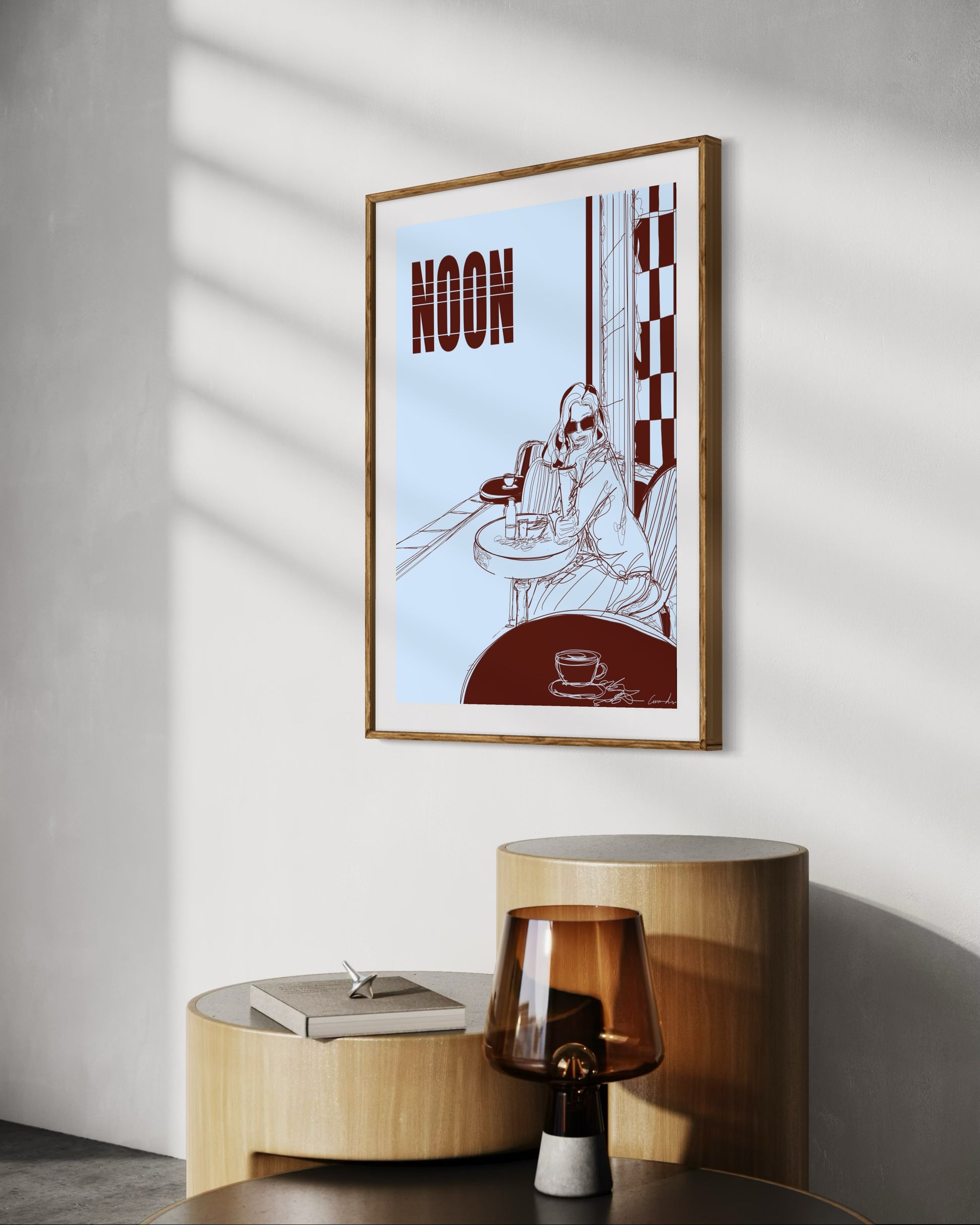 Noon är en del av affischserien "A day" skapad av Emma Lisnell. Med sina inslag av mode och elegans fångar denna affisch ögonblicket mitt på dagen. Den är perfekt för att skapa en atmosfär av lugn och stil i ditt hem, samtidigt som den erbjuder en känsla av modern nostalgi.