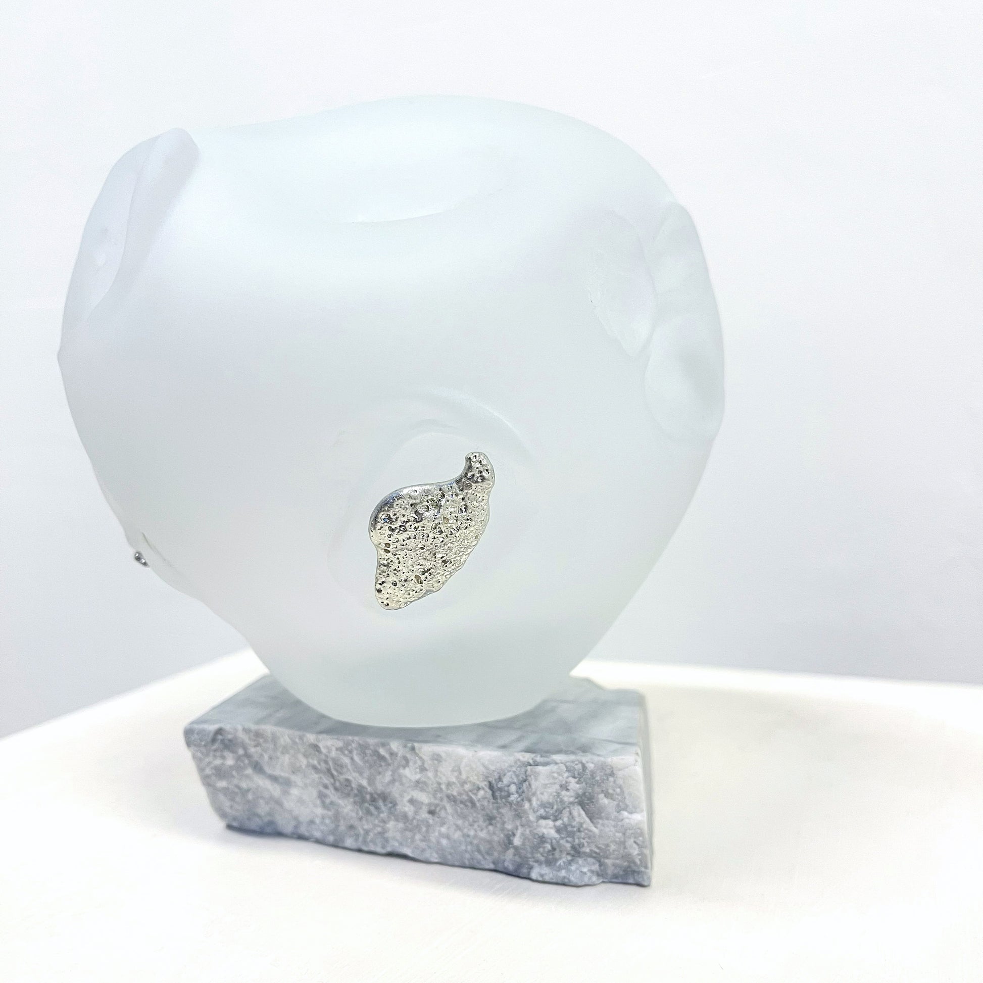 Skulptur i munblåst vitt opakt glas, sandblästrat, med detaljer i sandgjuten tenn. Monterad på en bas av 3 cm tjock Carraramarmor.