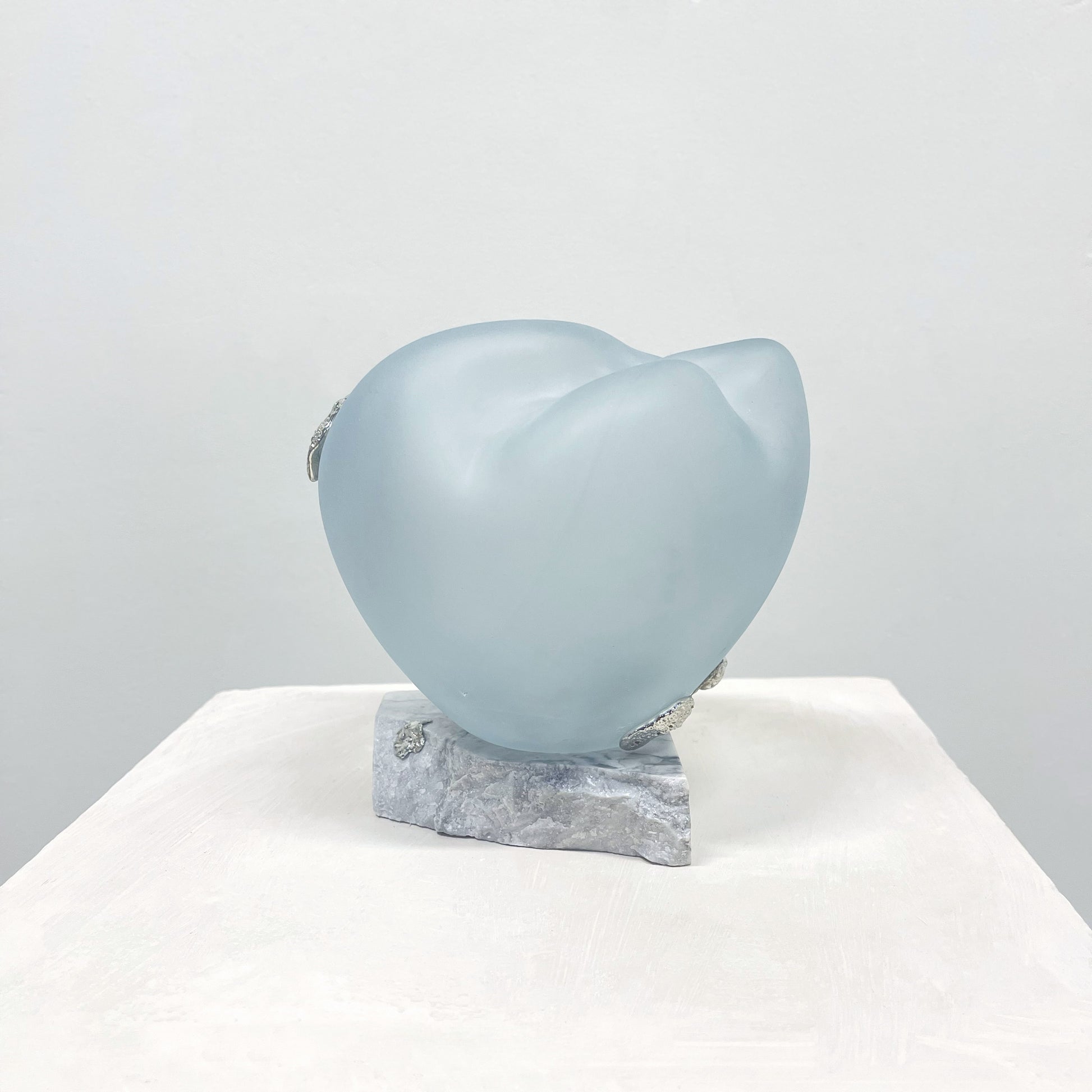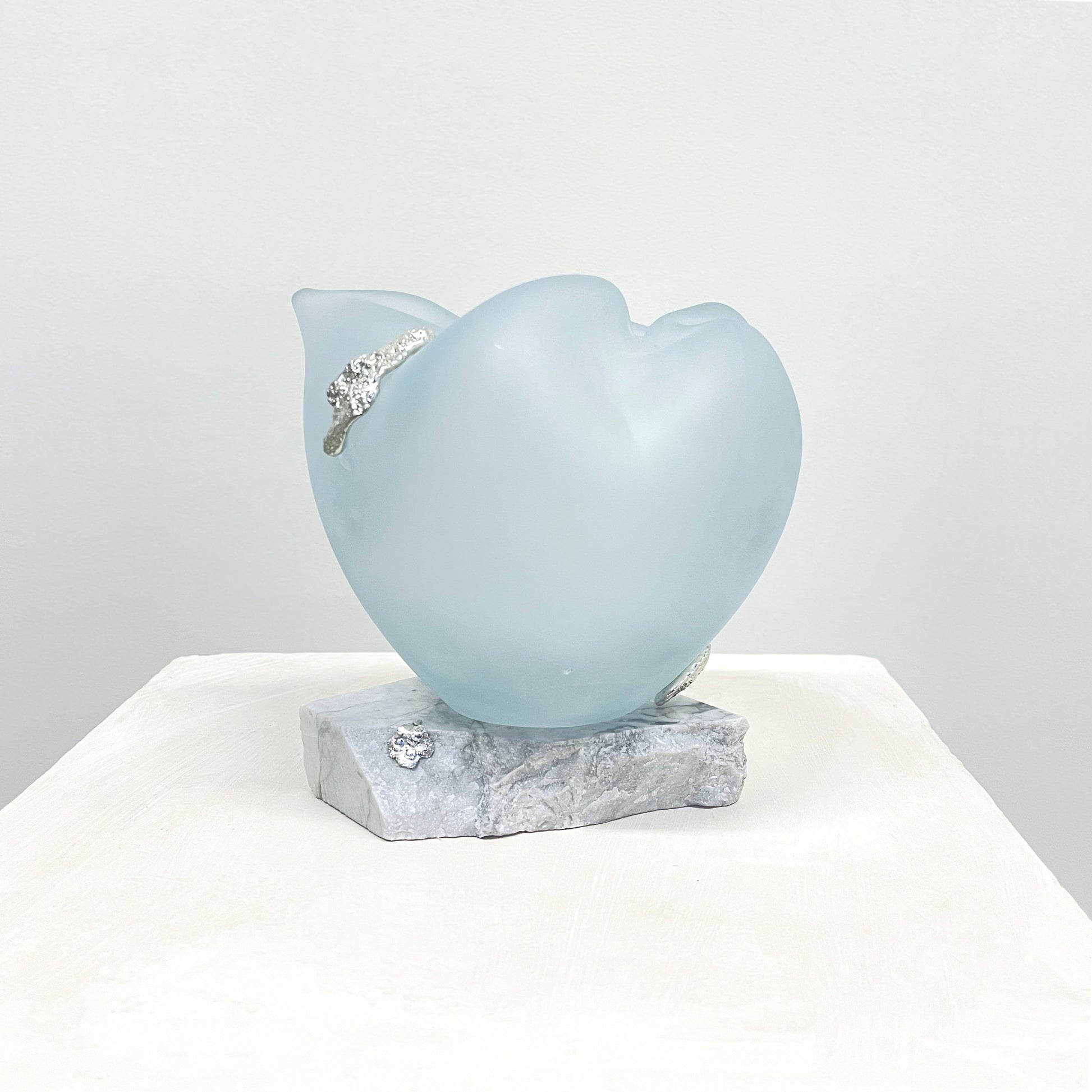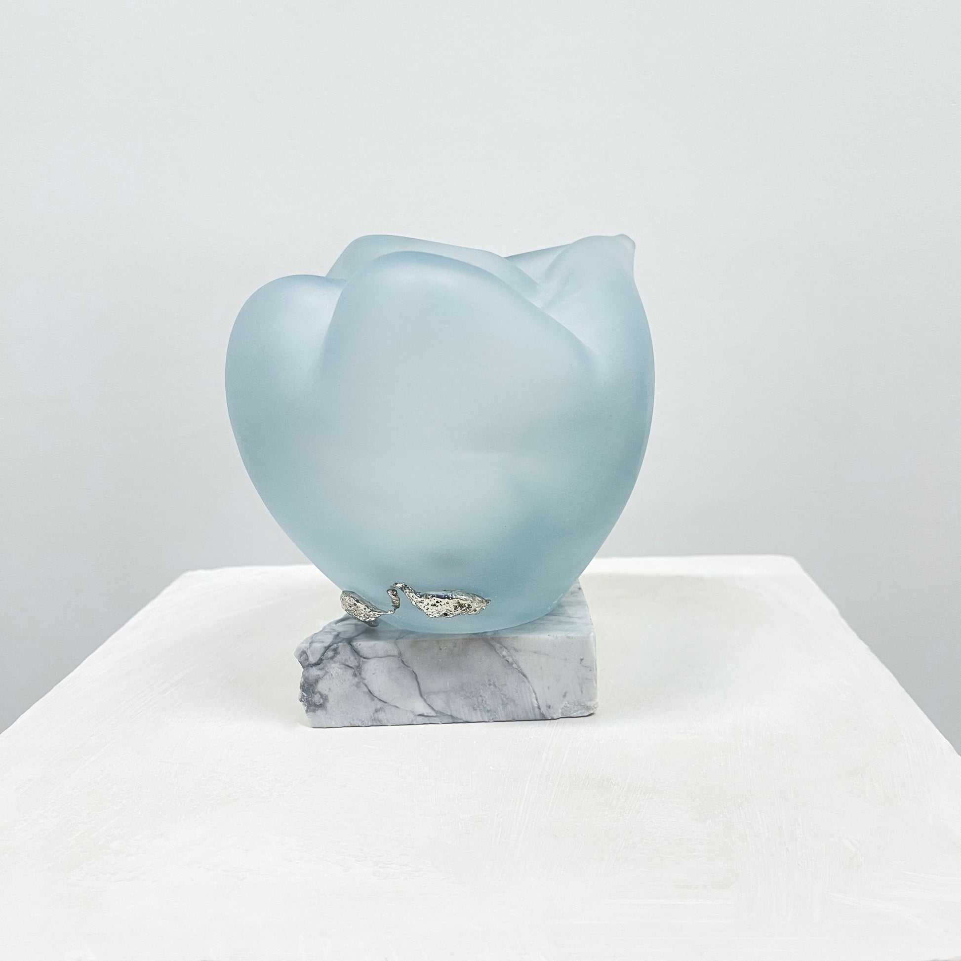 Skulptur i munblåst blått glas, sandblästrad, med detaljer i sandgjuten tenn. Monterad på en bas av 3 cm tjock Carraramarmor.