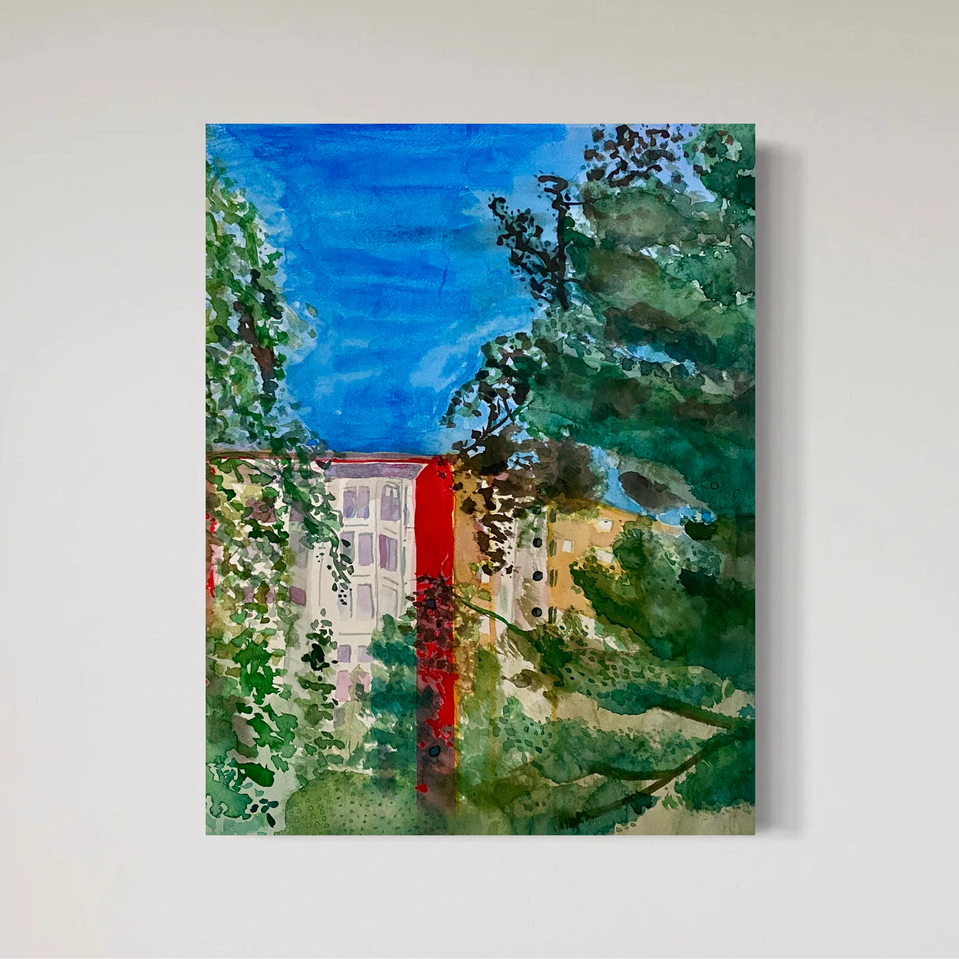 Ett rött och orange hyreshus under en blå himmel med lite lövverk i förgrunden. Föreställer hur oktober skulle se ut om det var varmt ute. Denna målning är målad med gouache och akvarell på tjockt papper 39x50 cm. Den ger en färgklick till vilket rum som helst som du placerar den i.