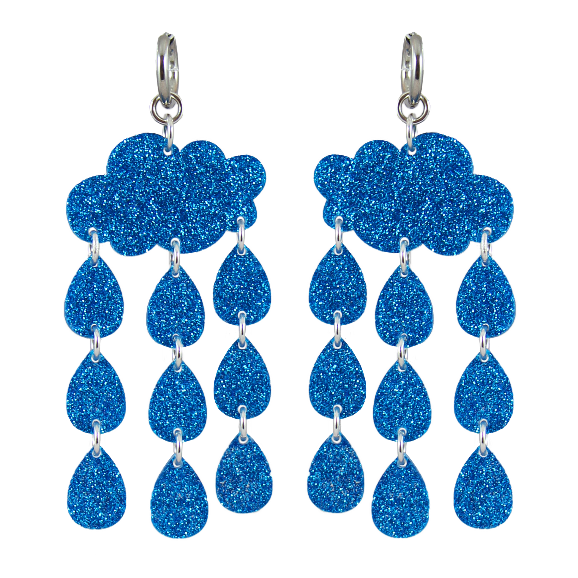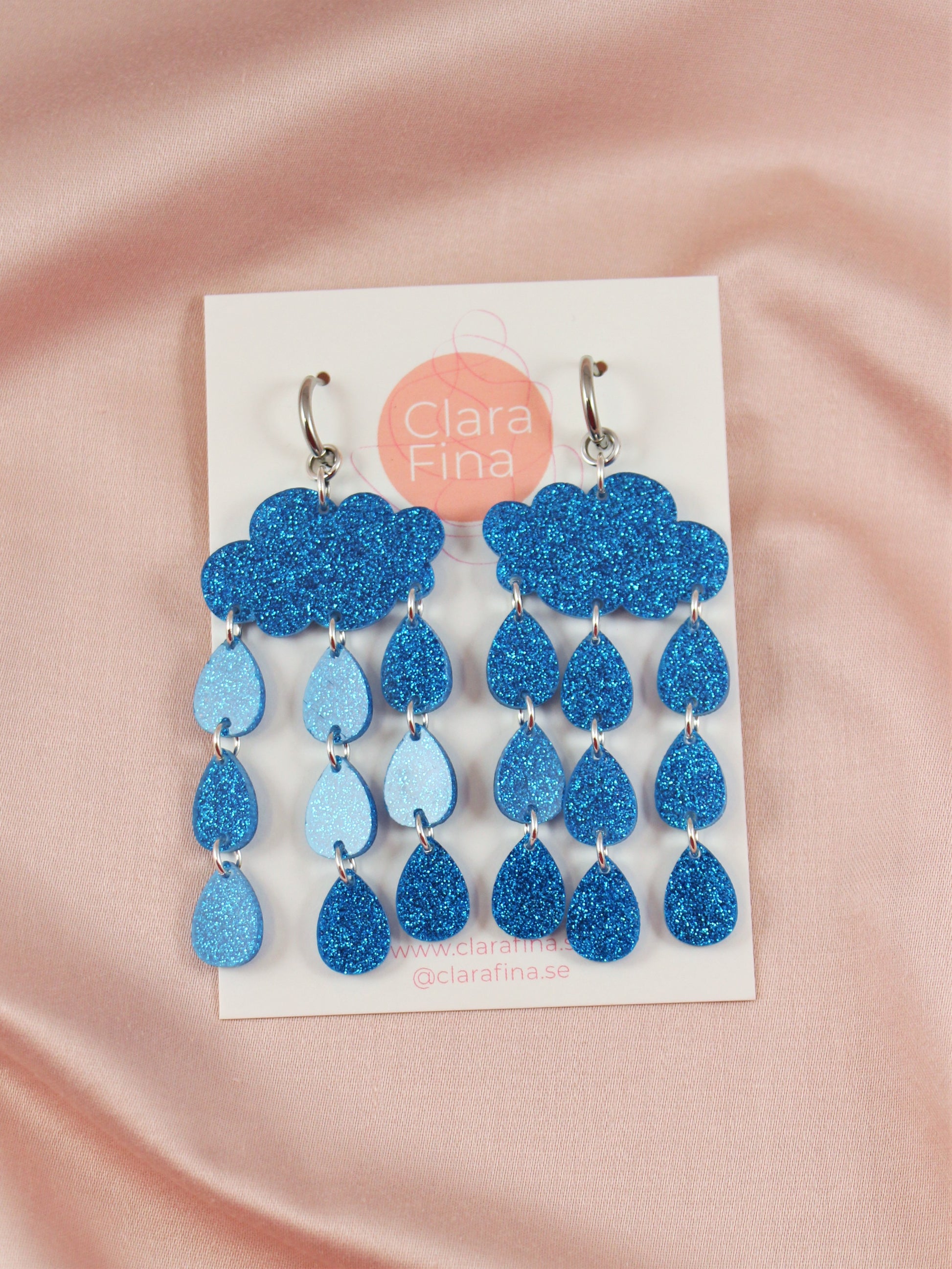 Ösregn är blåa, glittrande örhängen som är inspirerade av Göteborgs vanligaste väder och kombineras med fördel med din regnkappa för att göra den något mer glamorös...