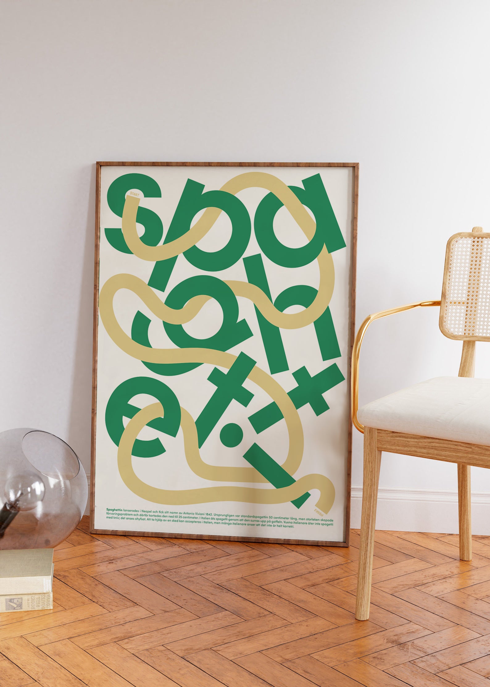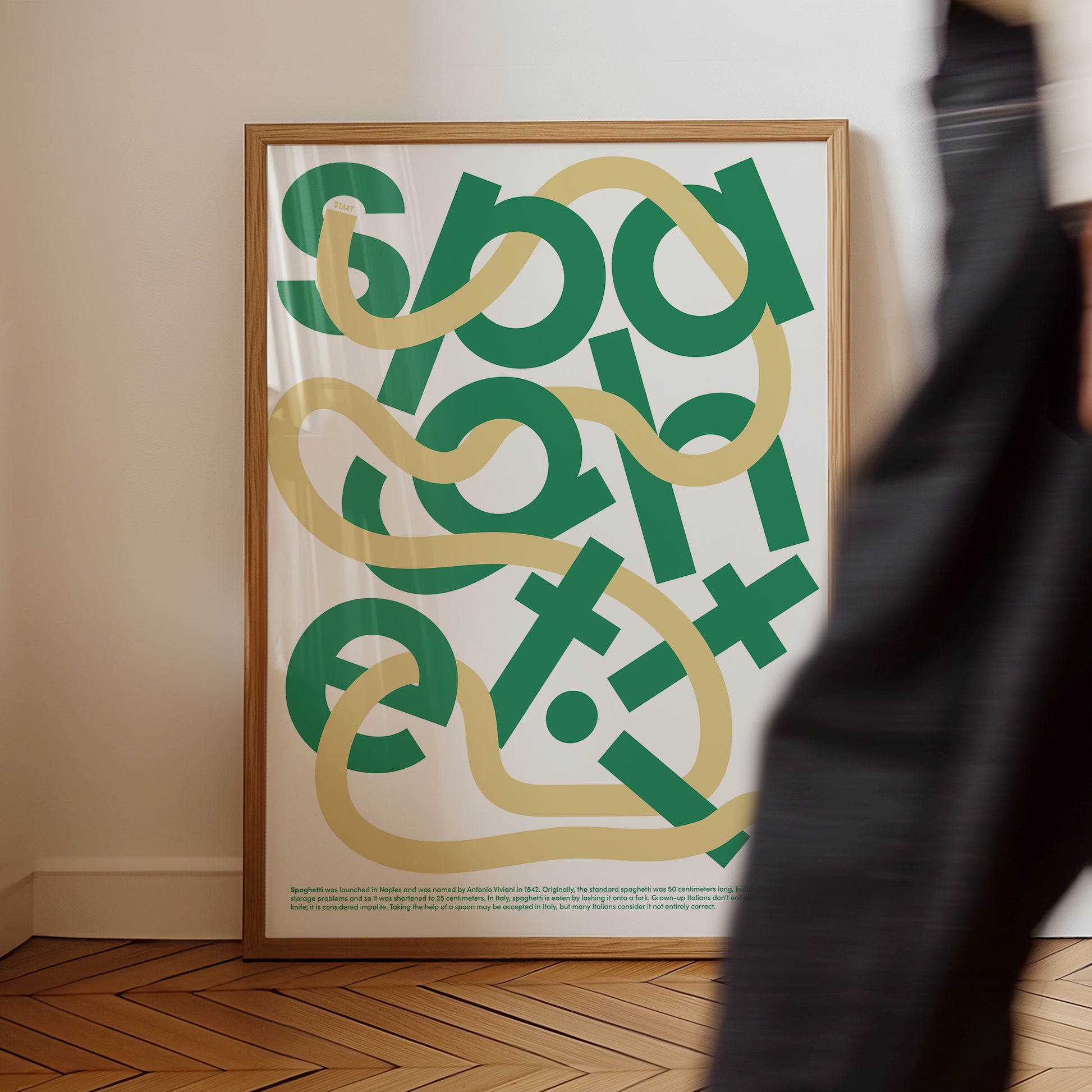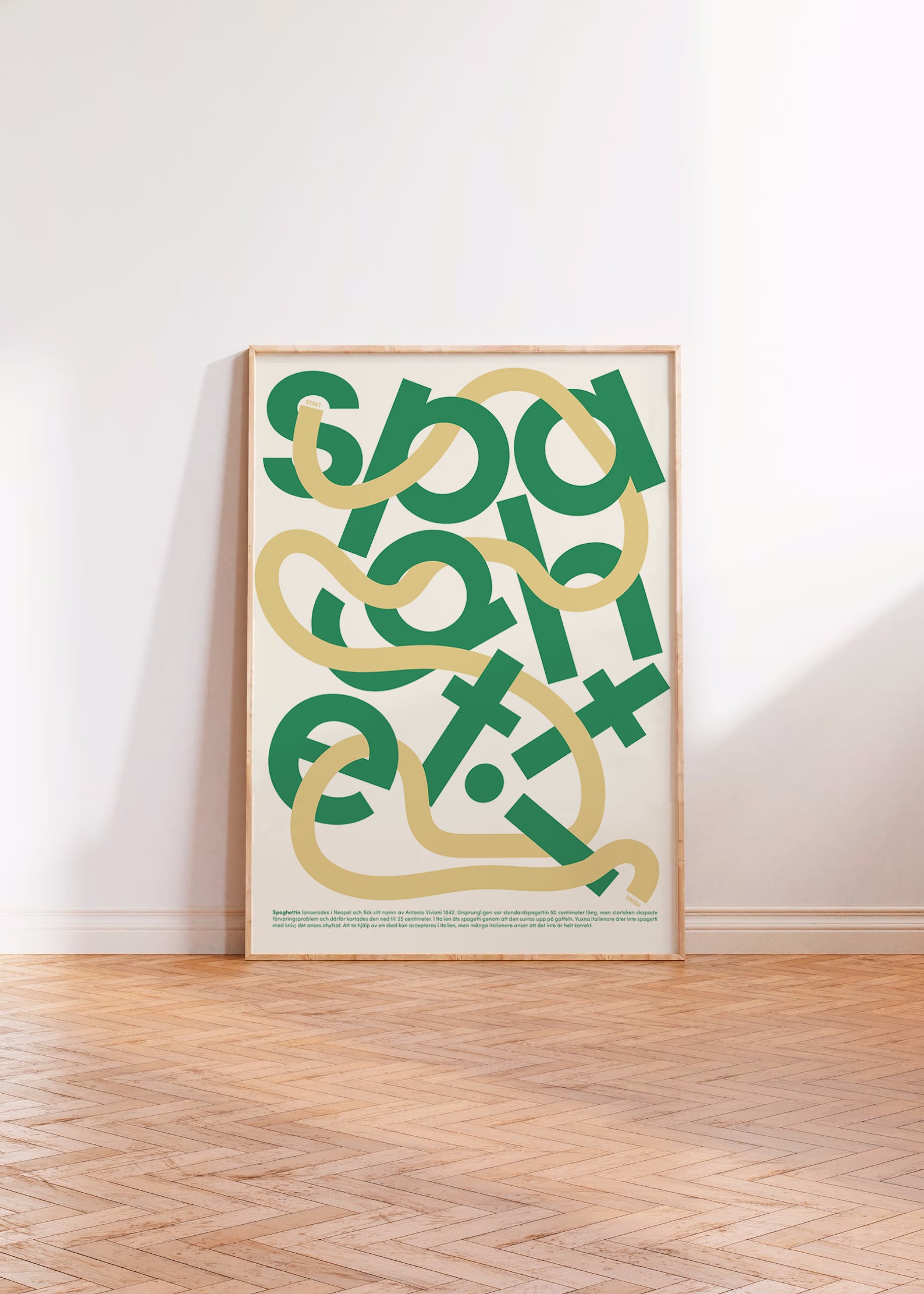 Vi hoppas att du älskar mat eftersom "more spaghetti, less upsetti!" Rolig typografisk poster som passar perfekt i ditt kök eller vardagsrum. Stora typsnitt ger en känsla av design och lämnar ett stort intryck.