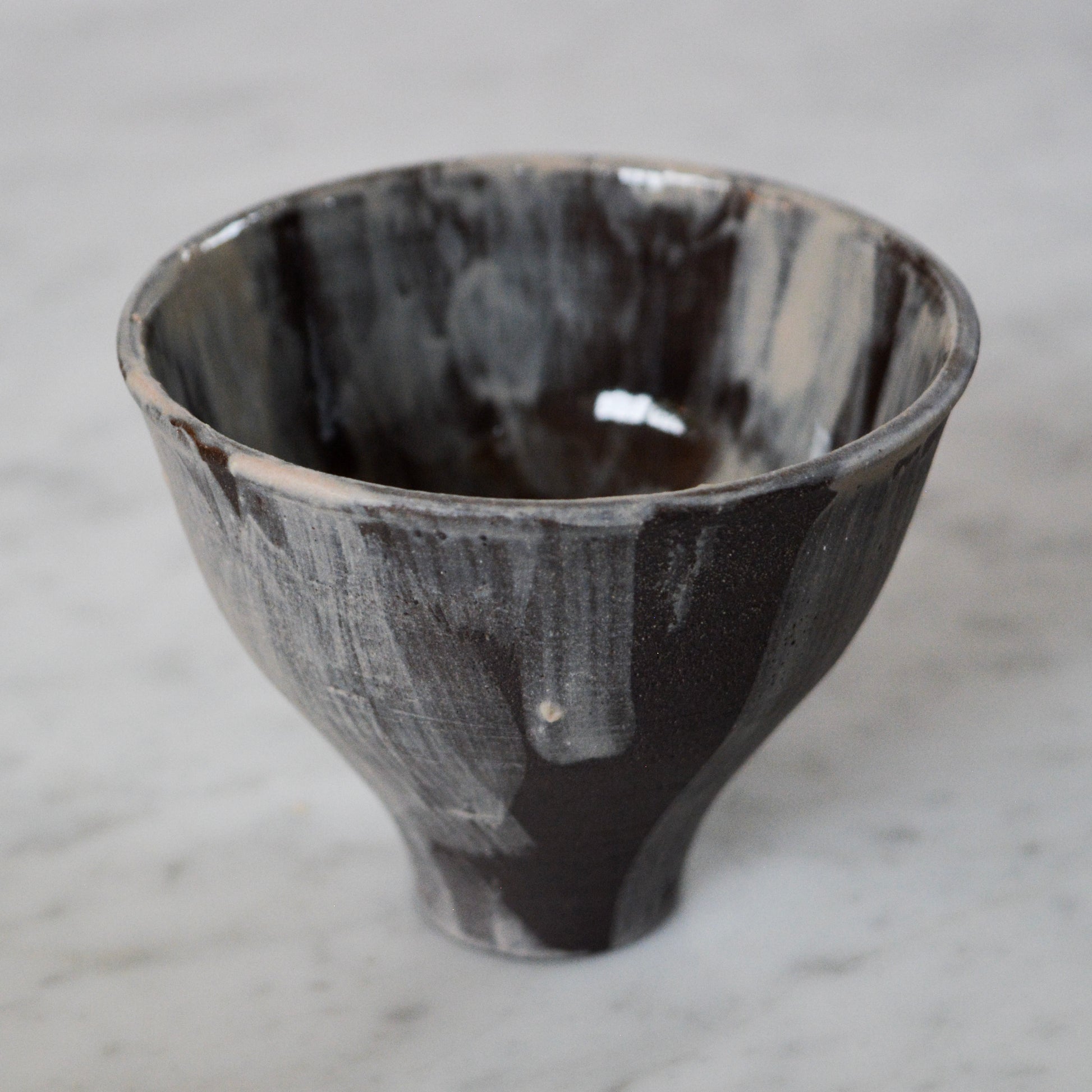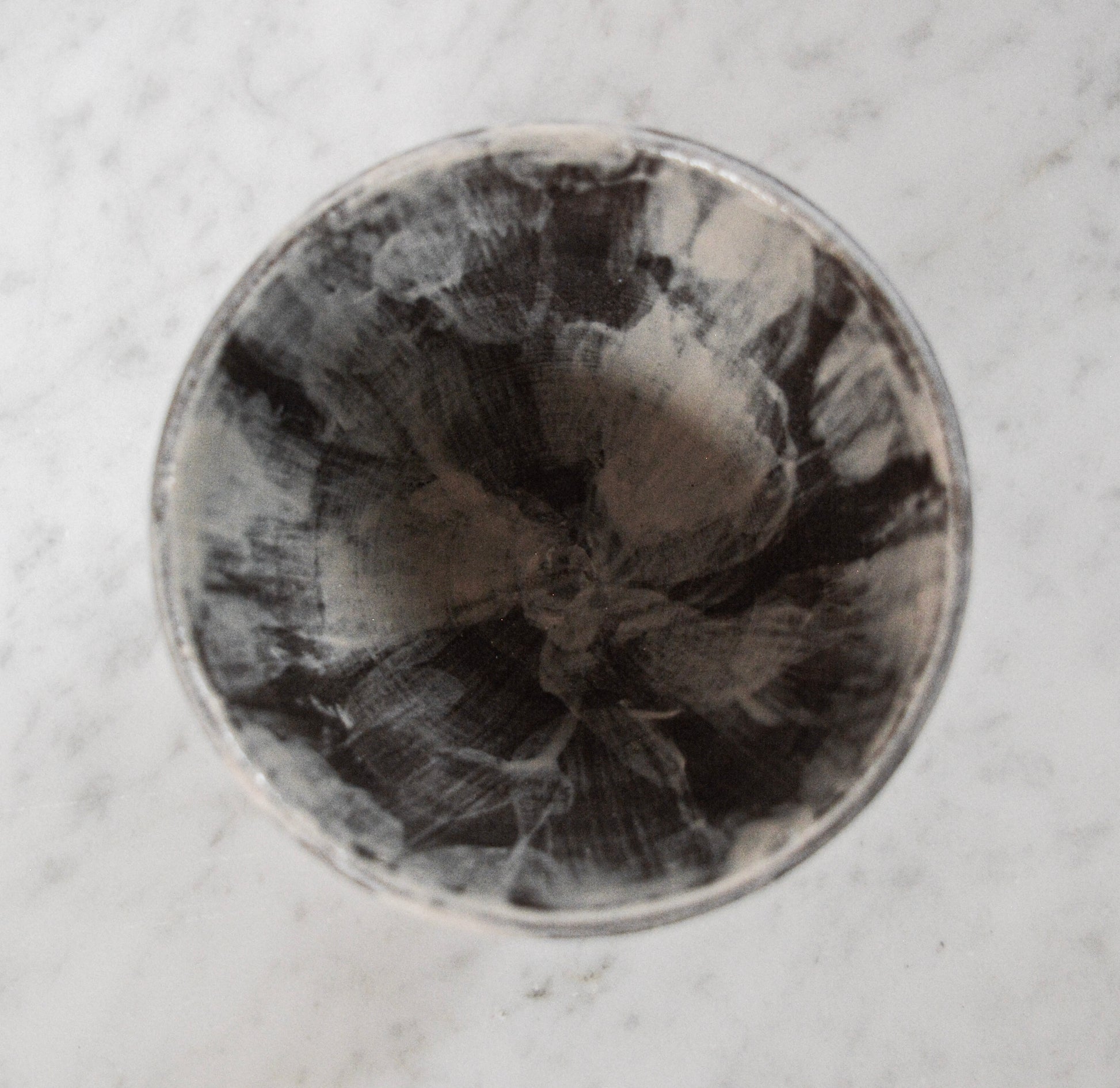 En unik handdrejad skål i svart stengodslera målad med ljus engobe. Insidan är täckt med en transparent glasyr medan utsidan är rå.