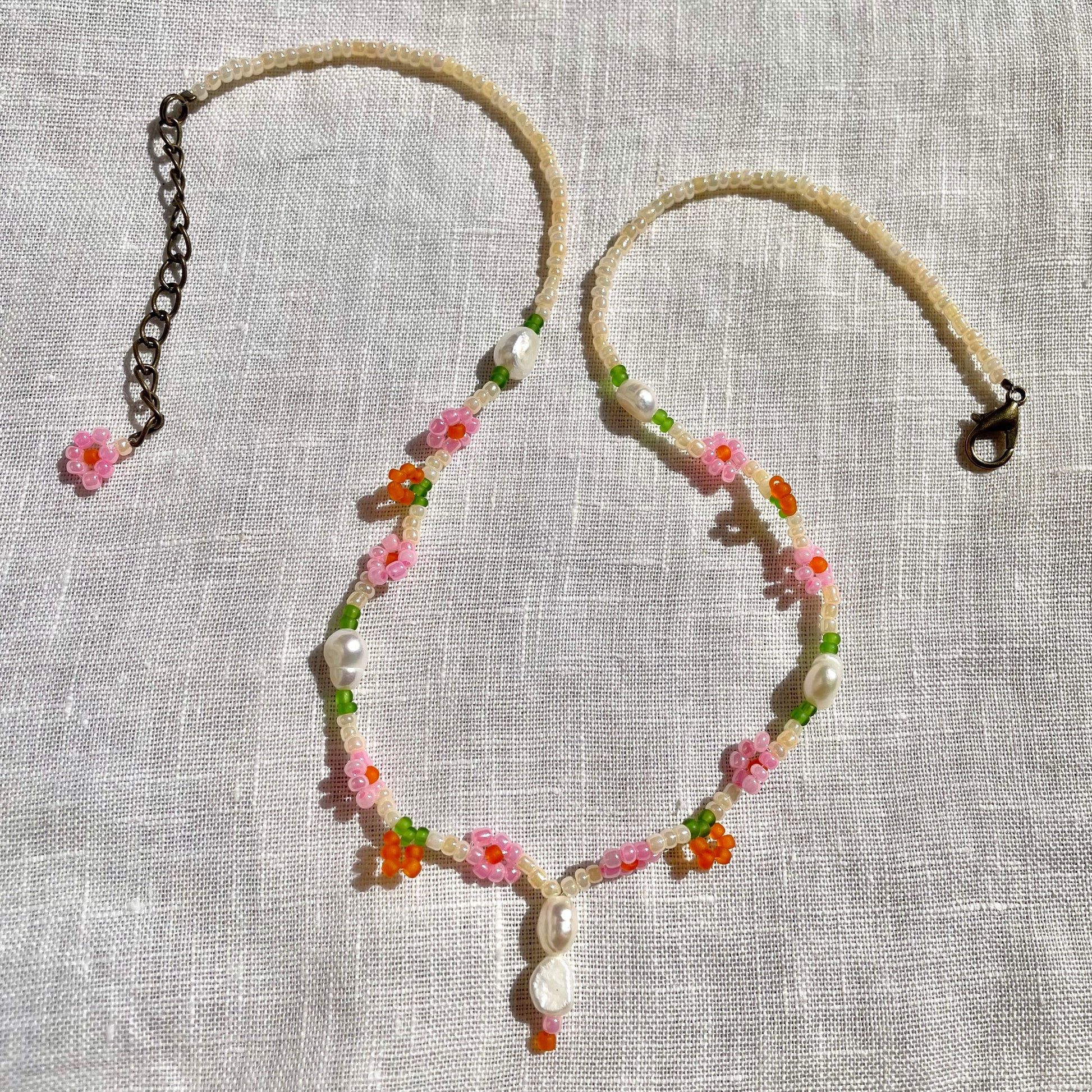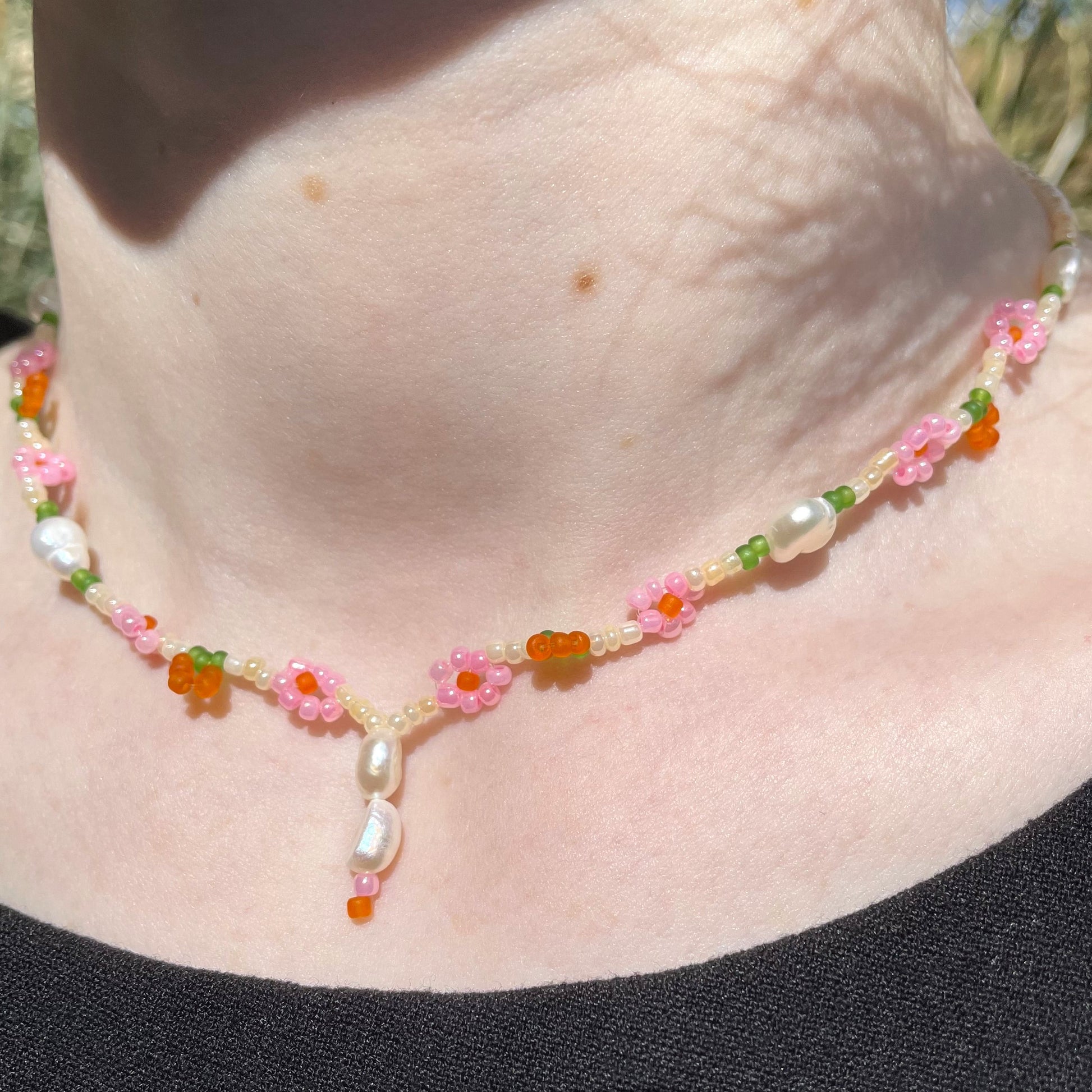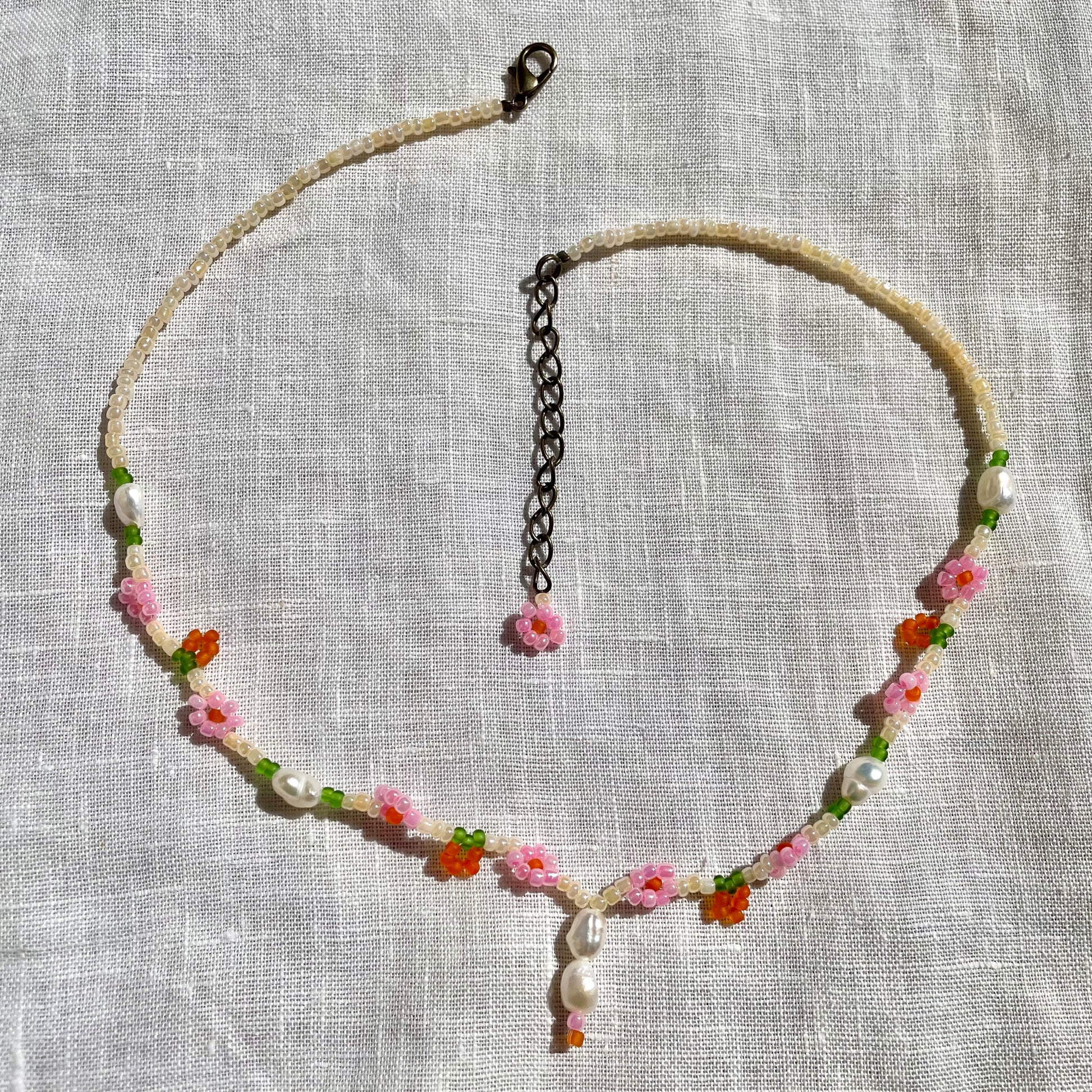 Ett pärlhalsband med persikor och sötvattenpärlor, handgjort med kärlek och omsorg. Inspirerat av 90-talets estetik och väcker fina minnen och känslor.