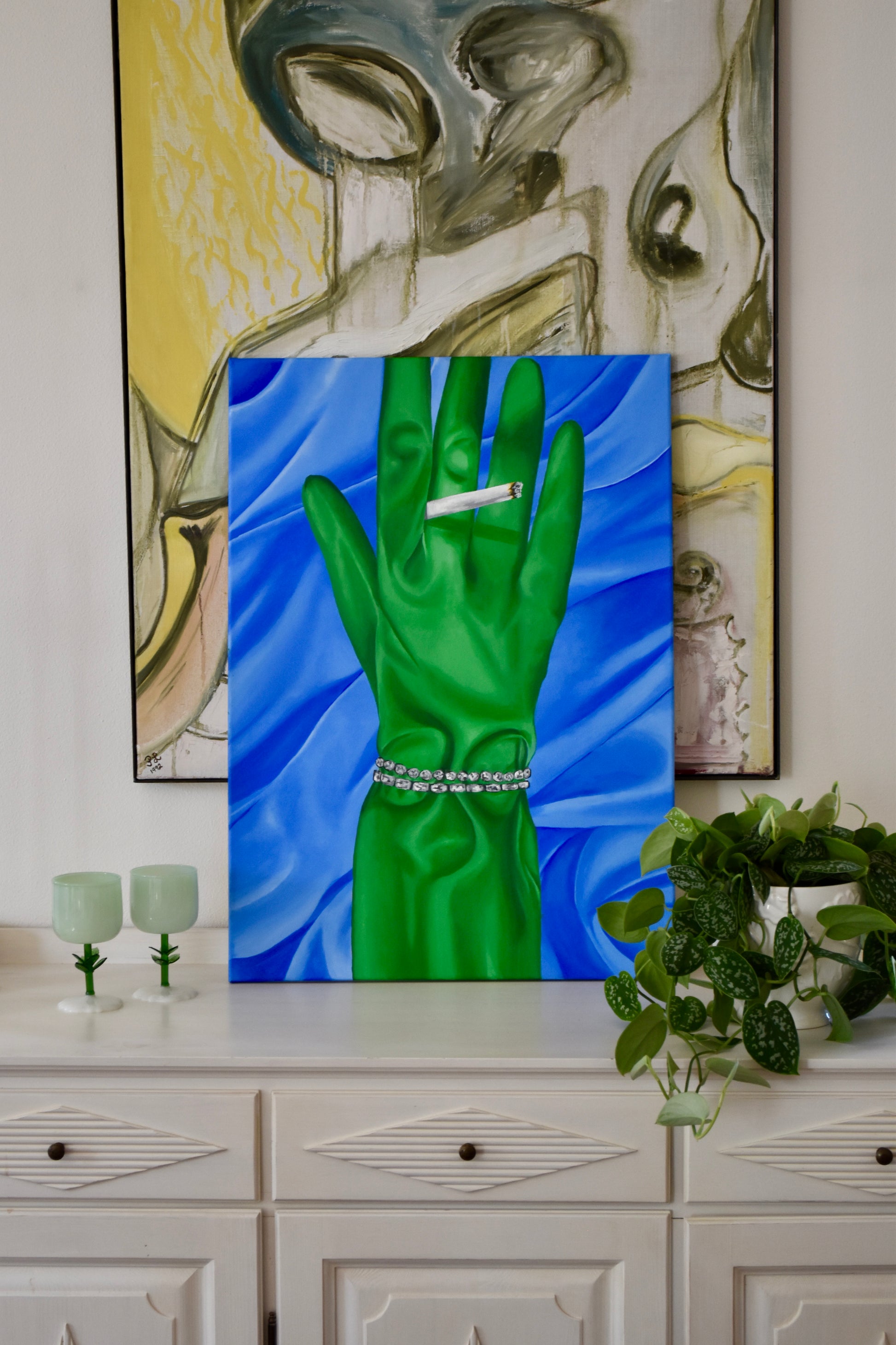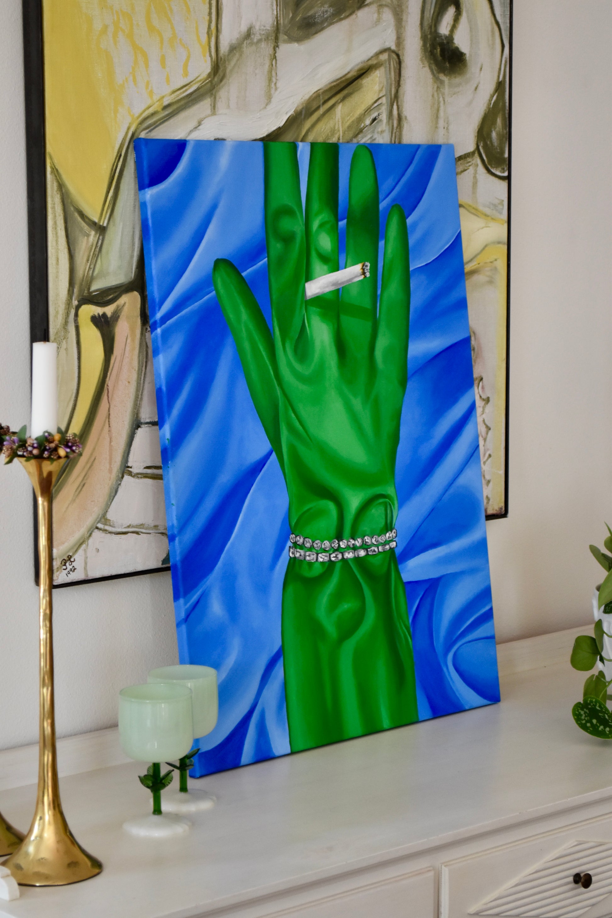 Ett färgglatt verk av Olga Lorenz som föreställer en gummihandske med en cigarett. Målad med akryl på vit duk.