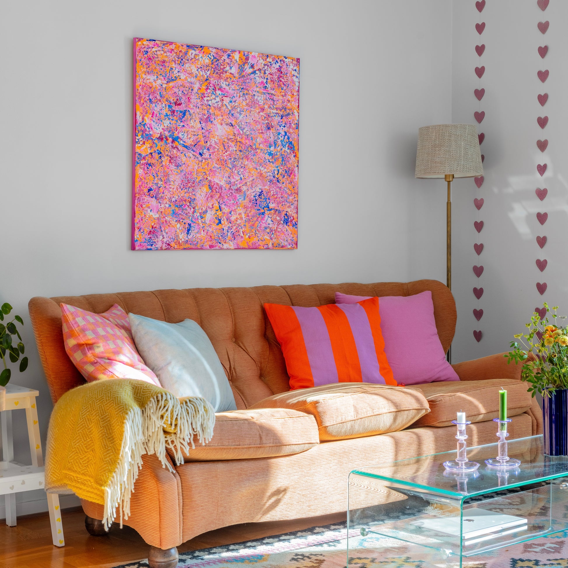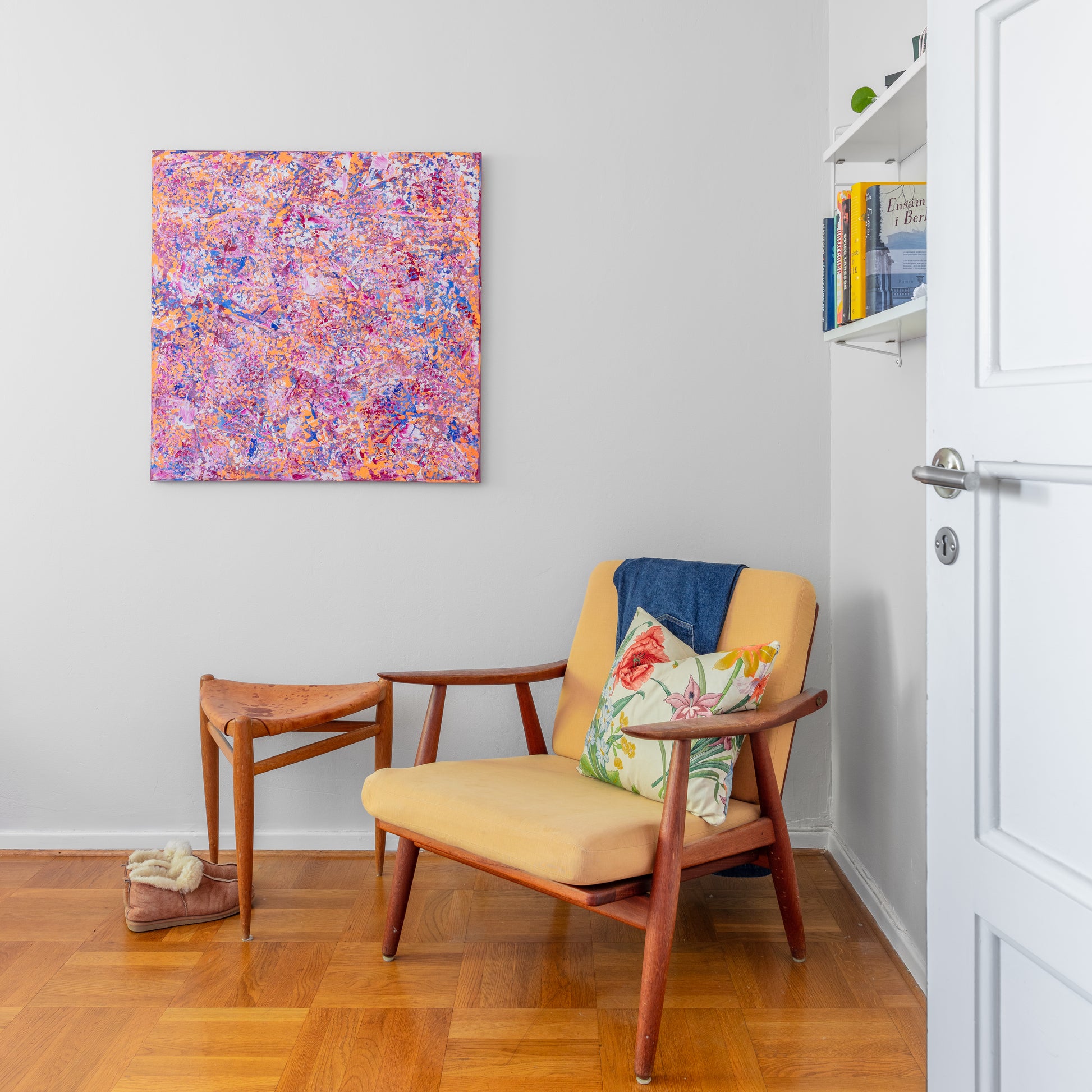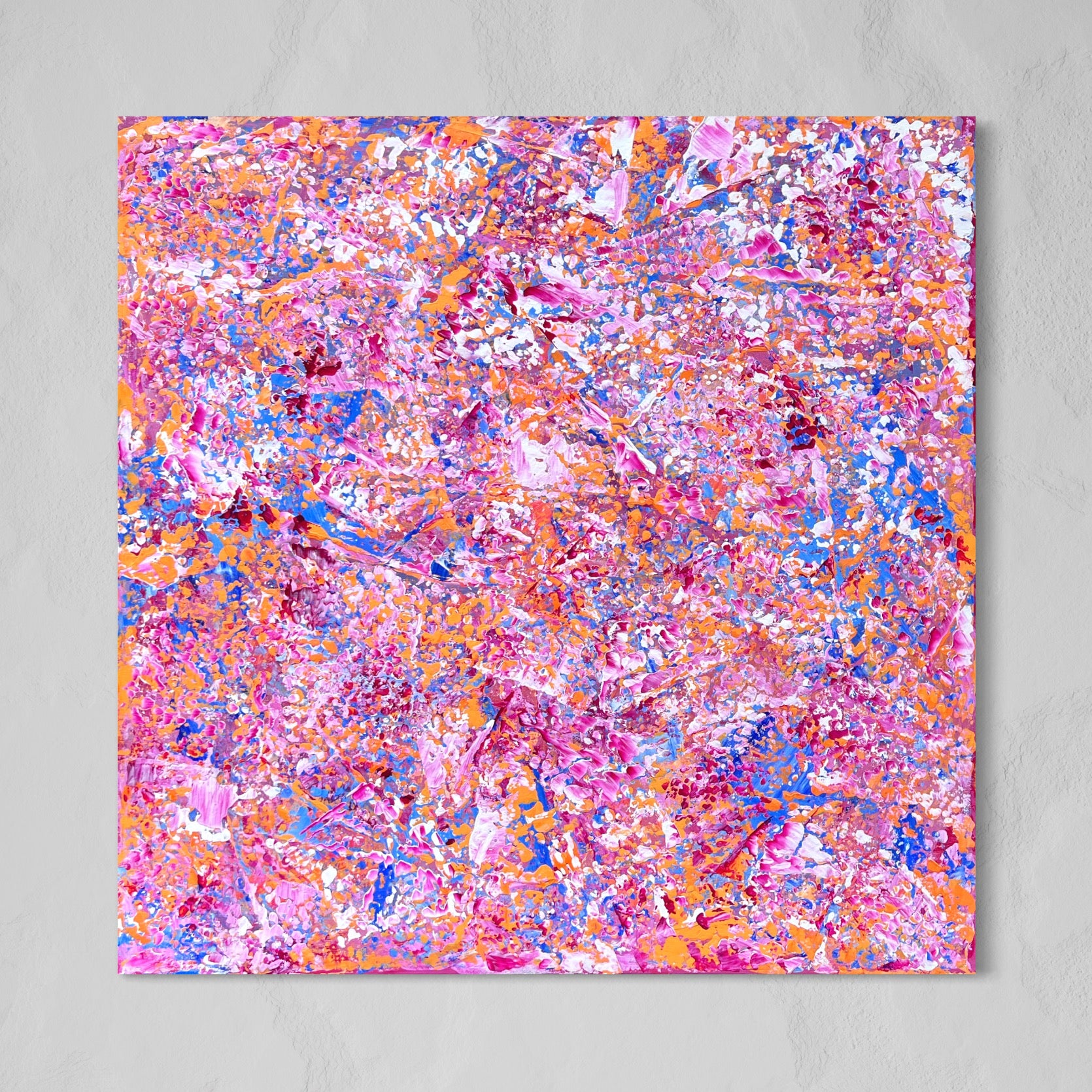 Fyll ditt hem med färg och energi med denna stora abstrakta målning av Klara Collin. Med sina många lager av abstrakta texturer skapar den en intensiv, men samtidigt lugnande känsla, vilket gör den perfekt för att lysa upp större ytor och tillföra rummet både personlighet och bra känsla.