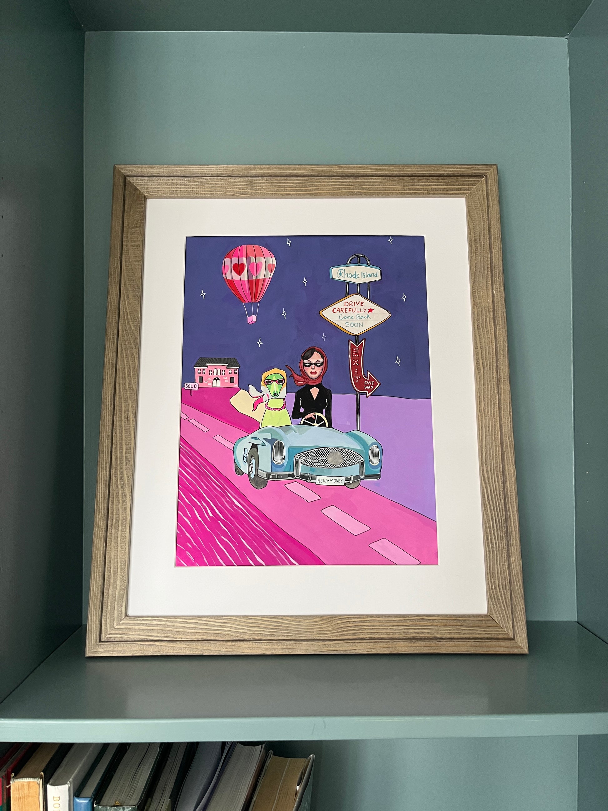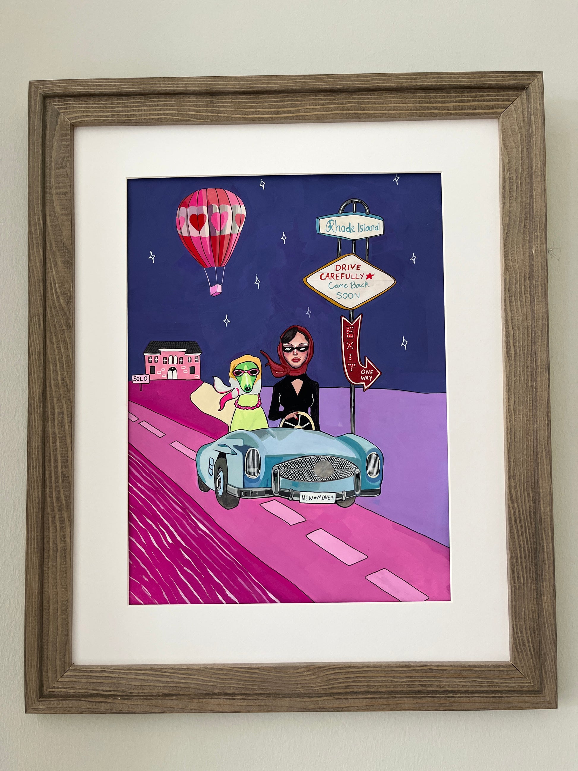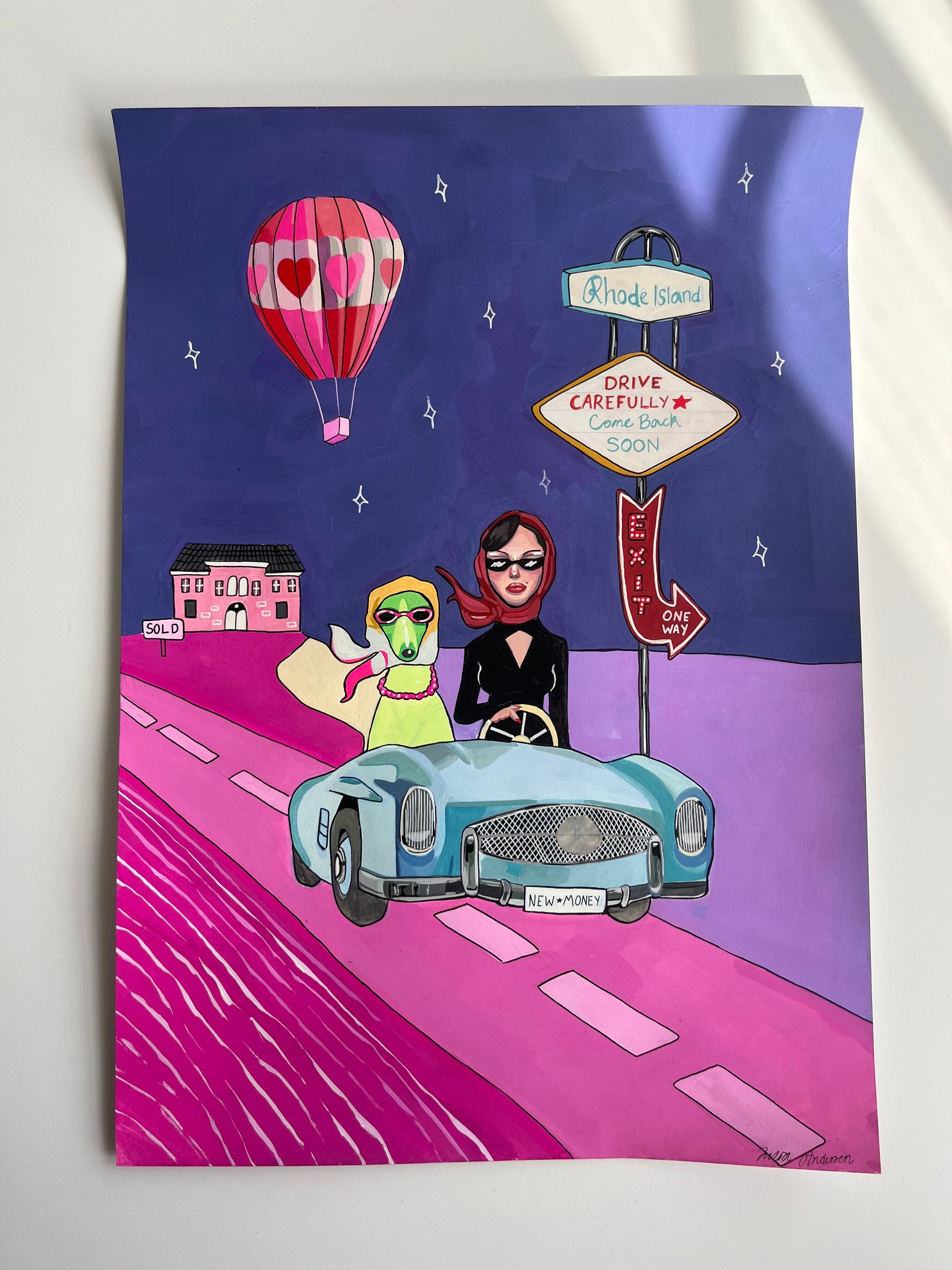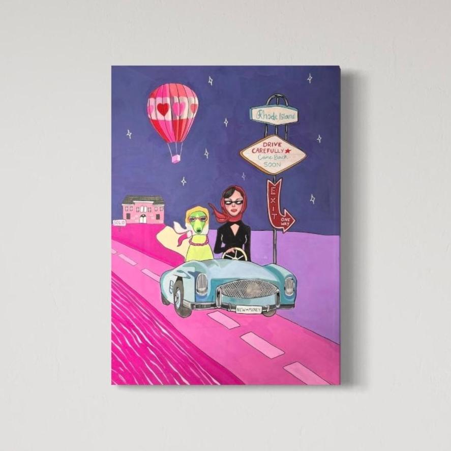 Julia Andersens handgjorda målning med ett lekfullt motiv av en hund och kvinna som åker bil. Detta är ett färgstarkt, fantasifullt och unikt konstverk som definitivt kommer att lägga stil och personlighet till din vägg!