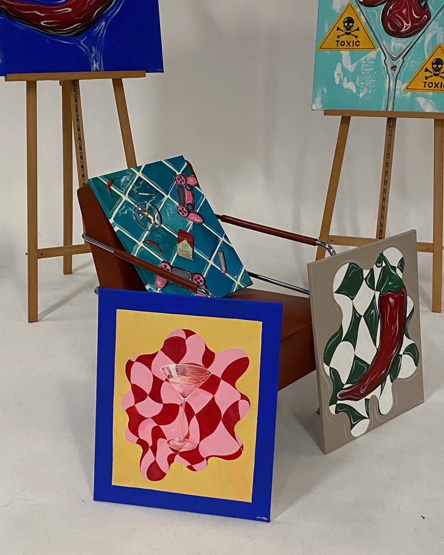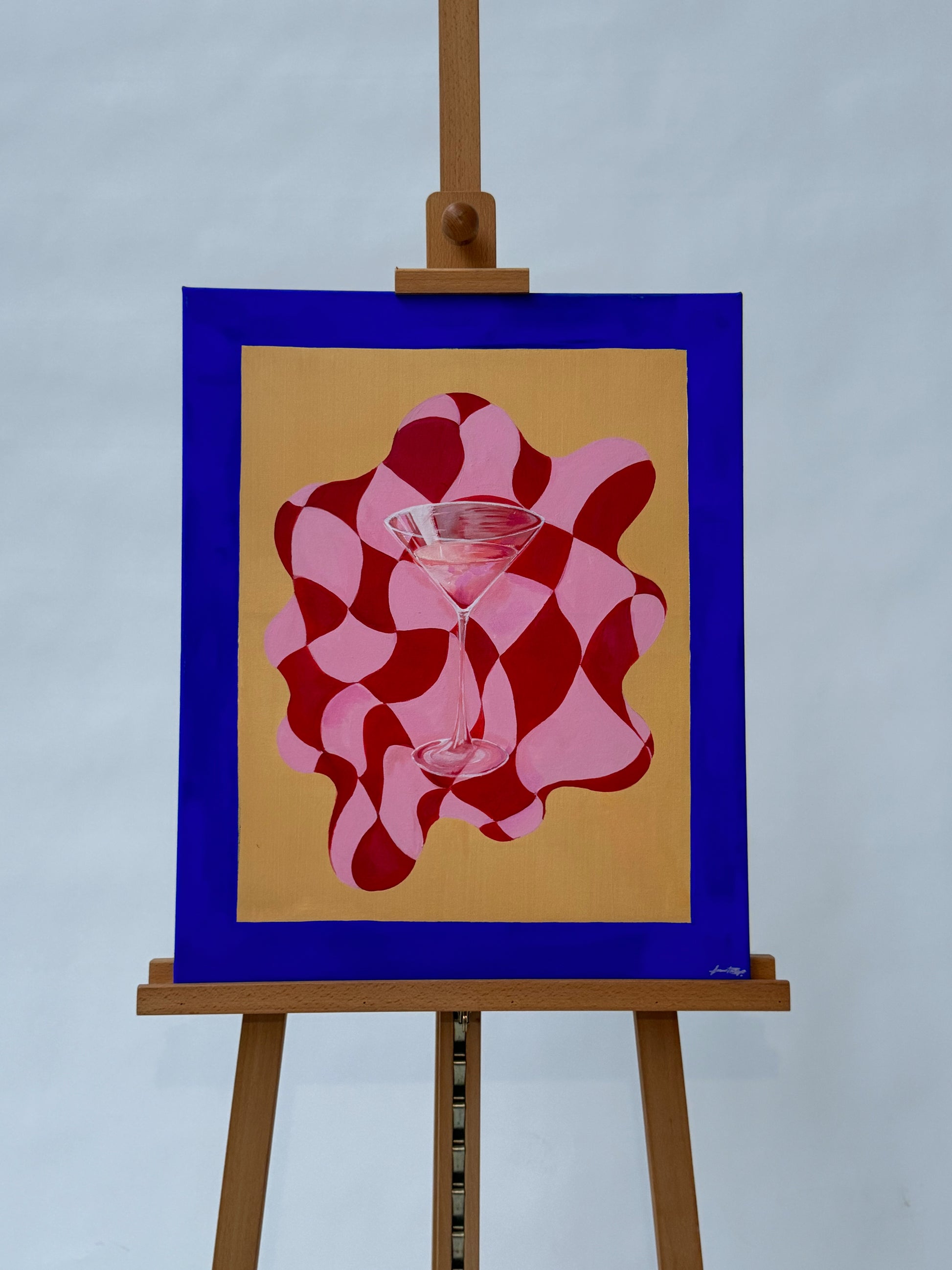 Lovisa Hellqvists handgjorda akrylmålning "Regular Martini" är en unik, färgstark visualisering av ett martiniglas på rutig botten. Den har ett lekfullt men ändå stilrent utseende och kommer att vara ett bra komplement till din heminredning!