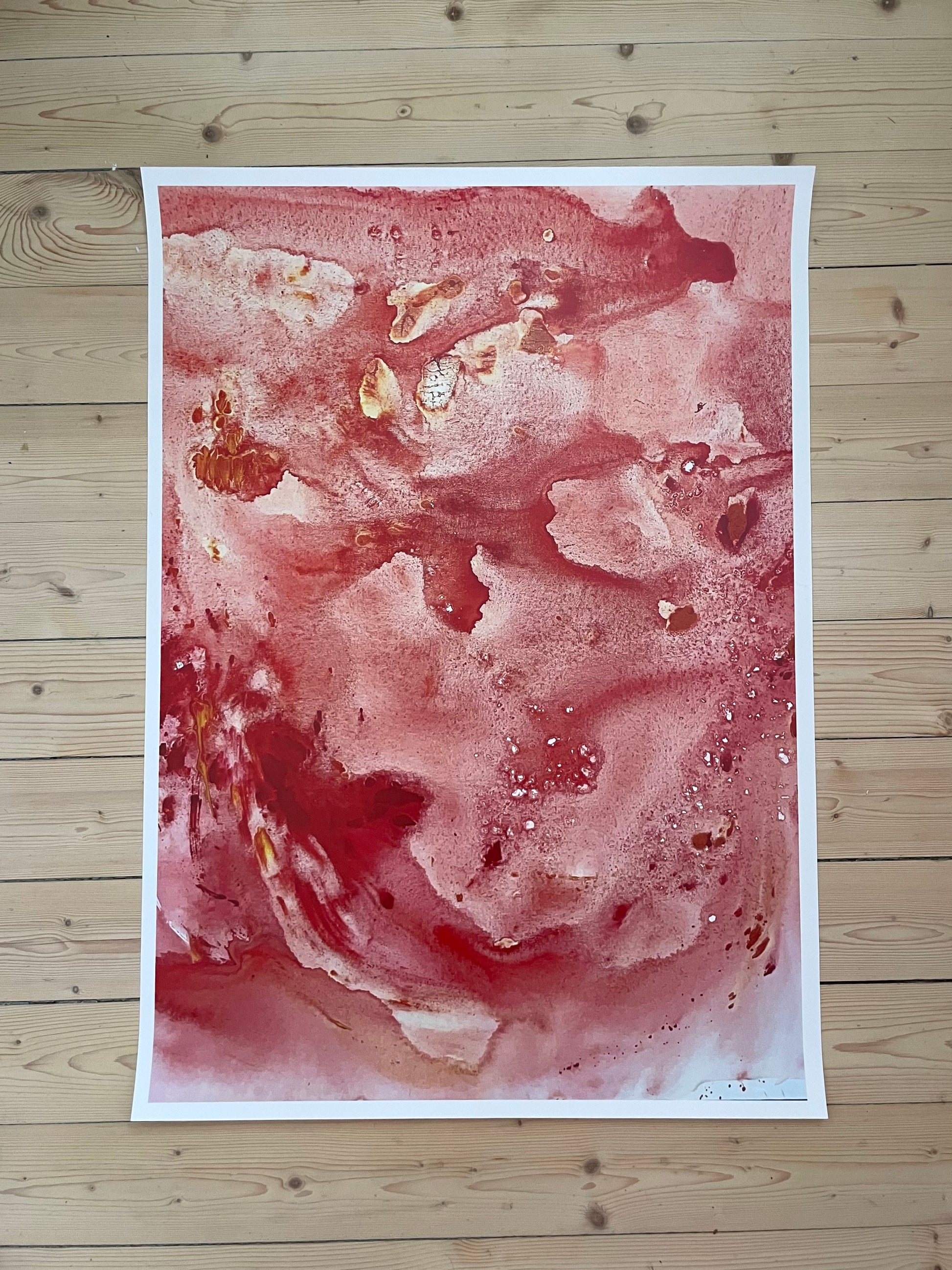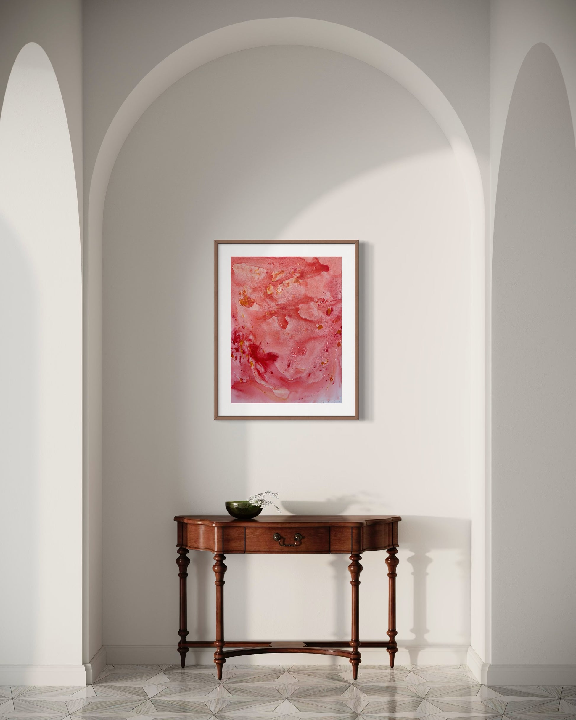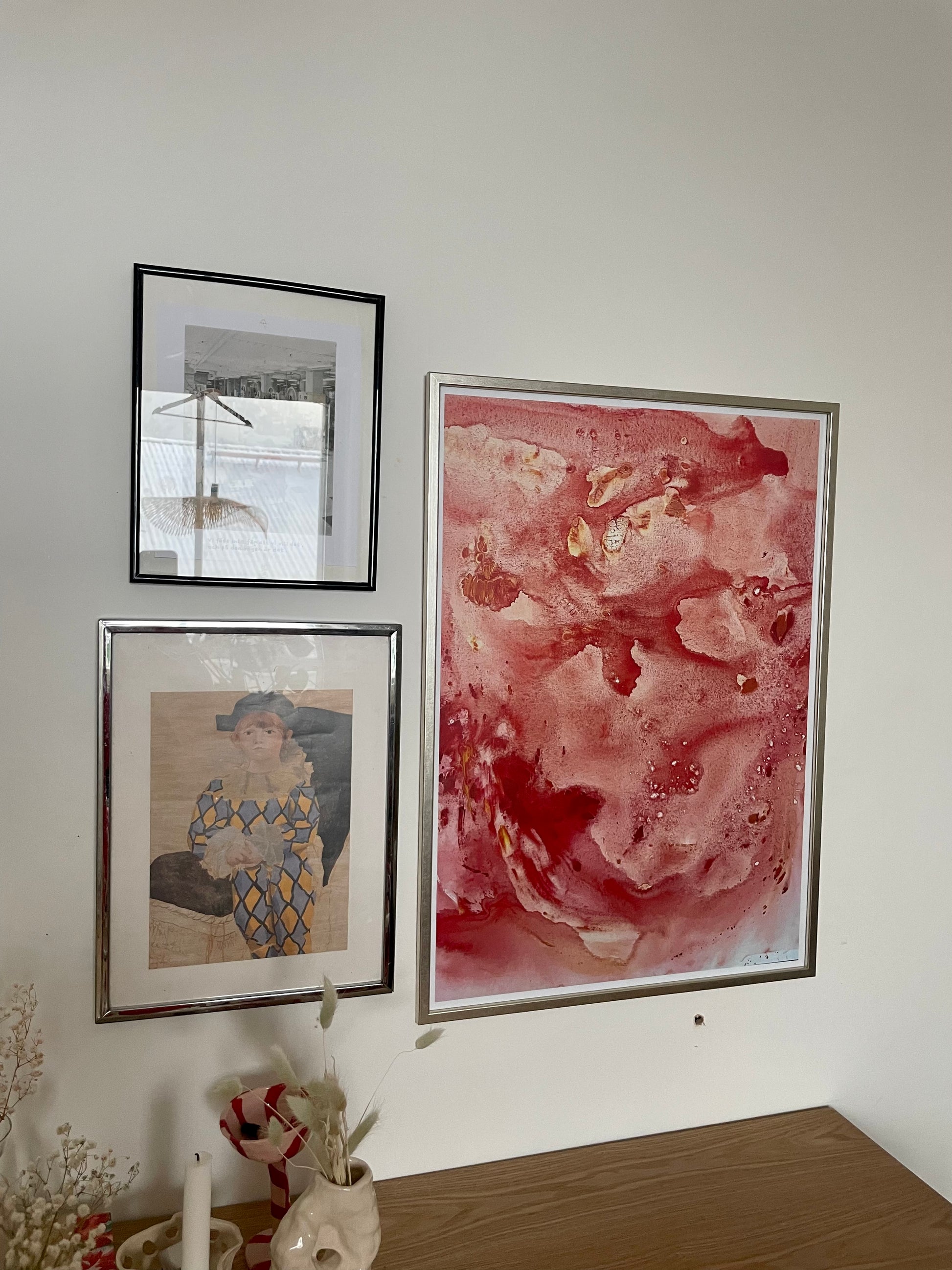 Tillför djärv energi till ditt hem med Röd rörig röra av Freja Öhman – en expressiv abstrakt konstprint som sprakar av intensiva röda och rosa toner. Detta samtida väggkonstverk fångar rörelse, känsla och intensitet genom lager av penseldrag och lekfulla detaljer.