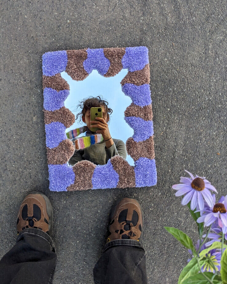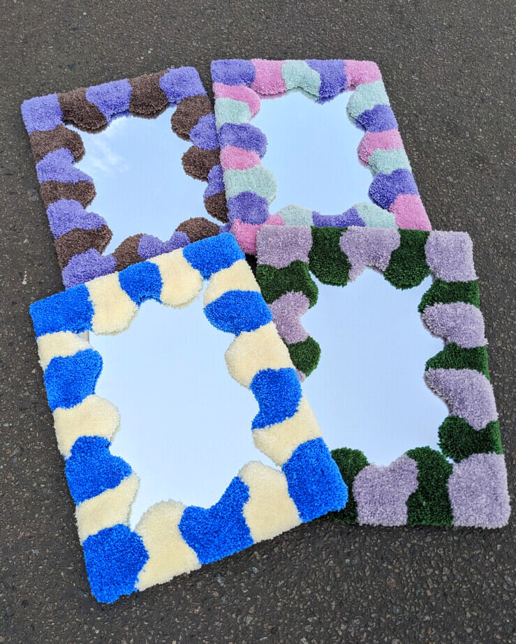 Handtuftad fluffig spegel i komönster. En hängkrok ingår i paketet.
