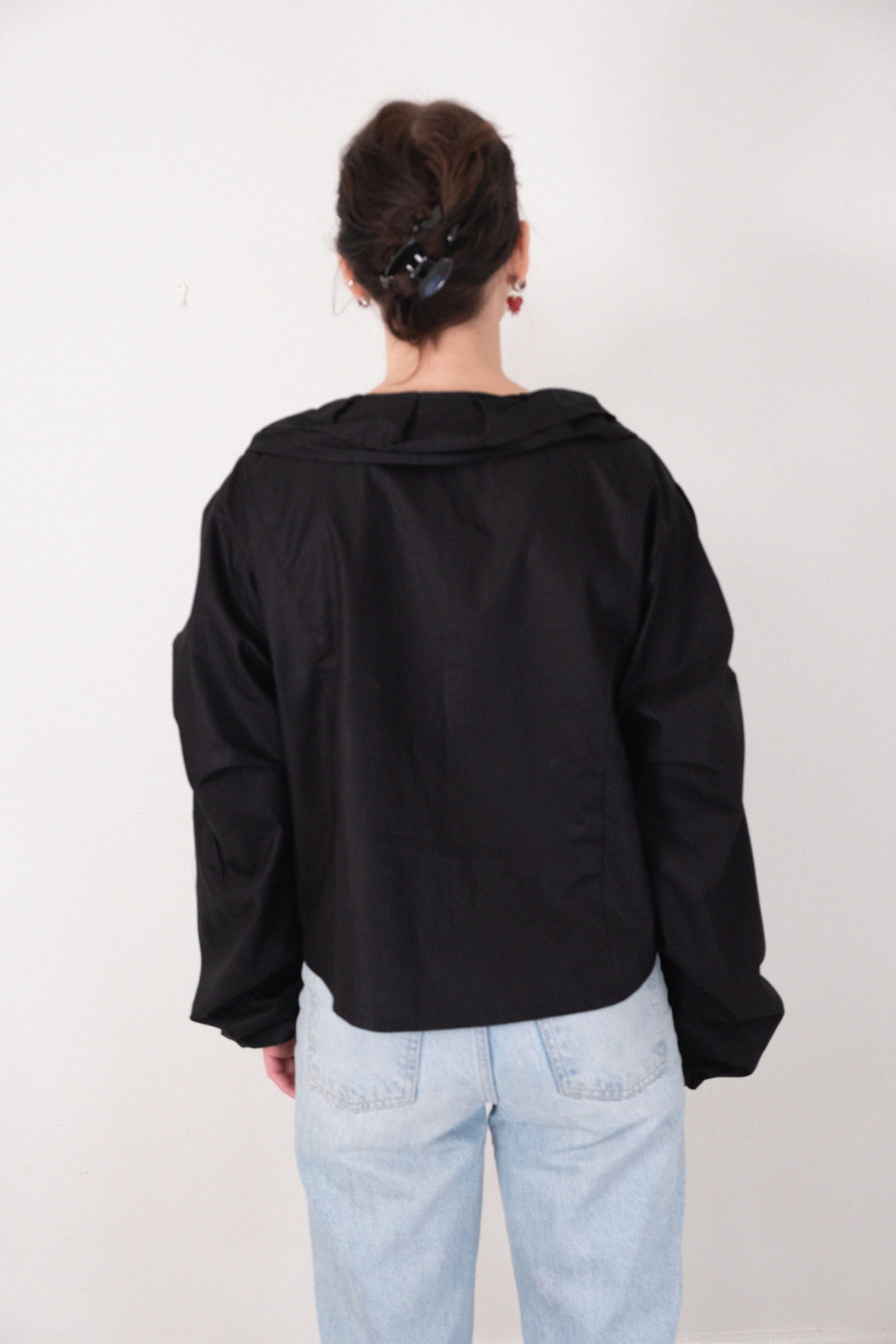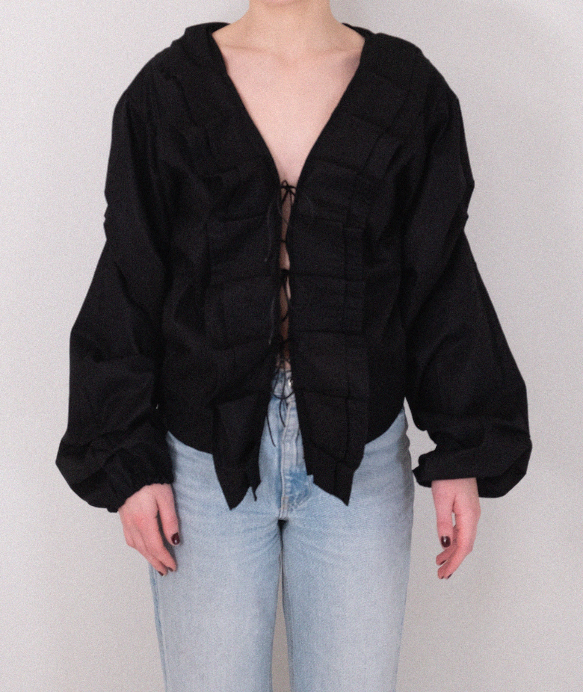 Shania by Whilde Studios är en svart, handgjord blus med långa, svullna armar och en djup urringning med volanger runt. Detta unika, feminina klädesplagg har också flera knytband framtill. Gör vilken outfit som helst mer elegant och exklusiv!