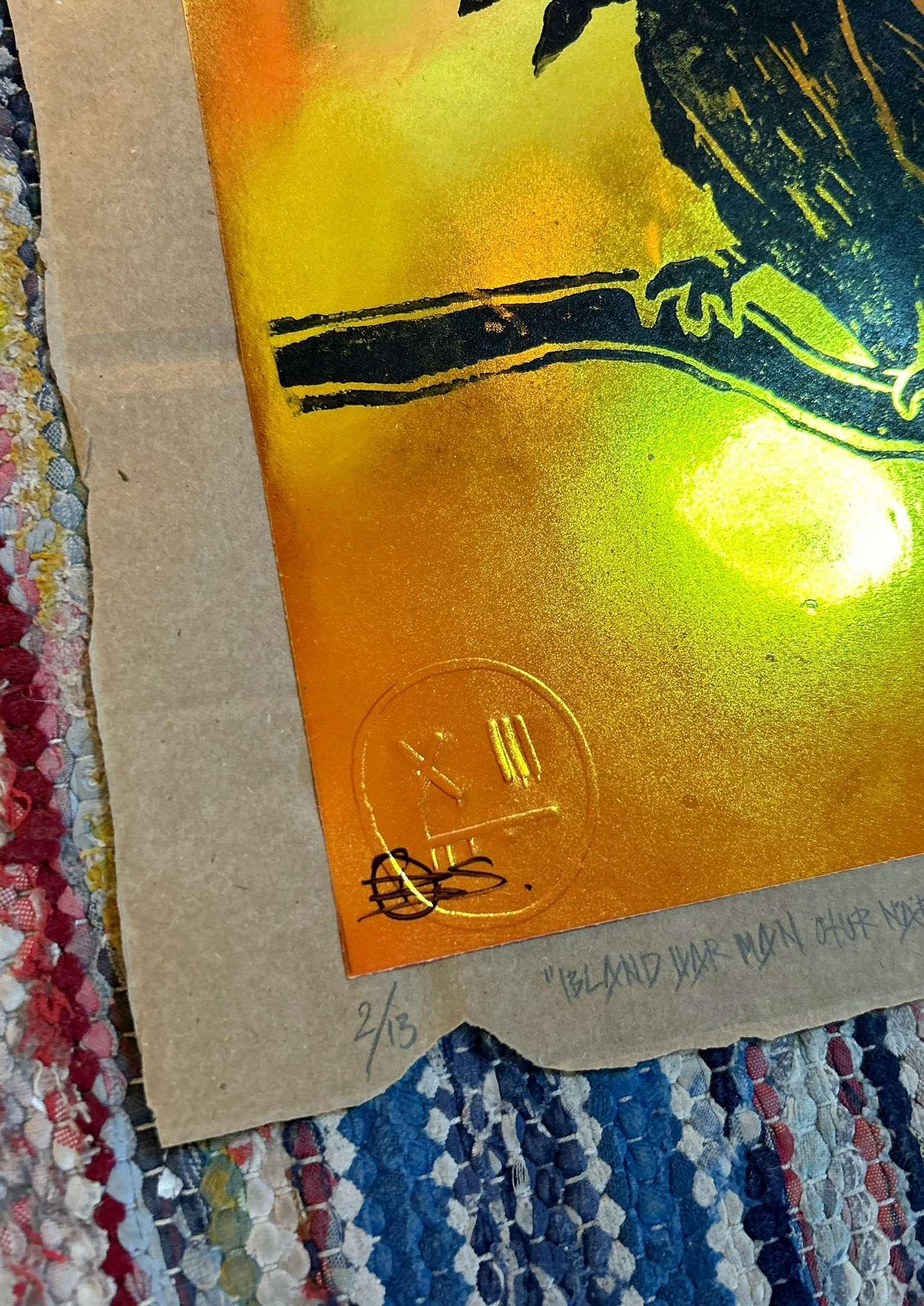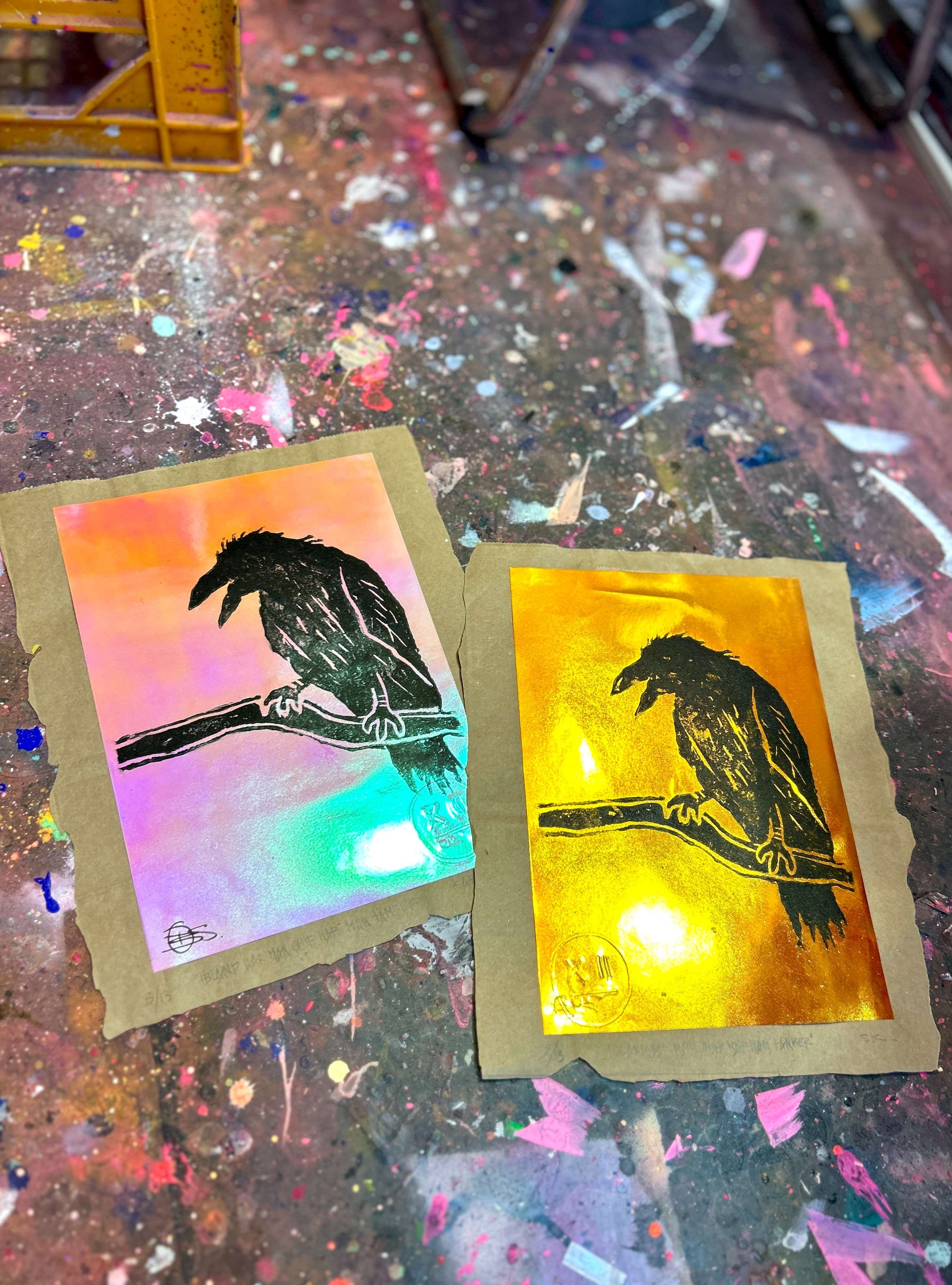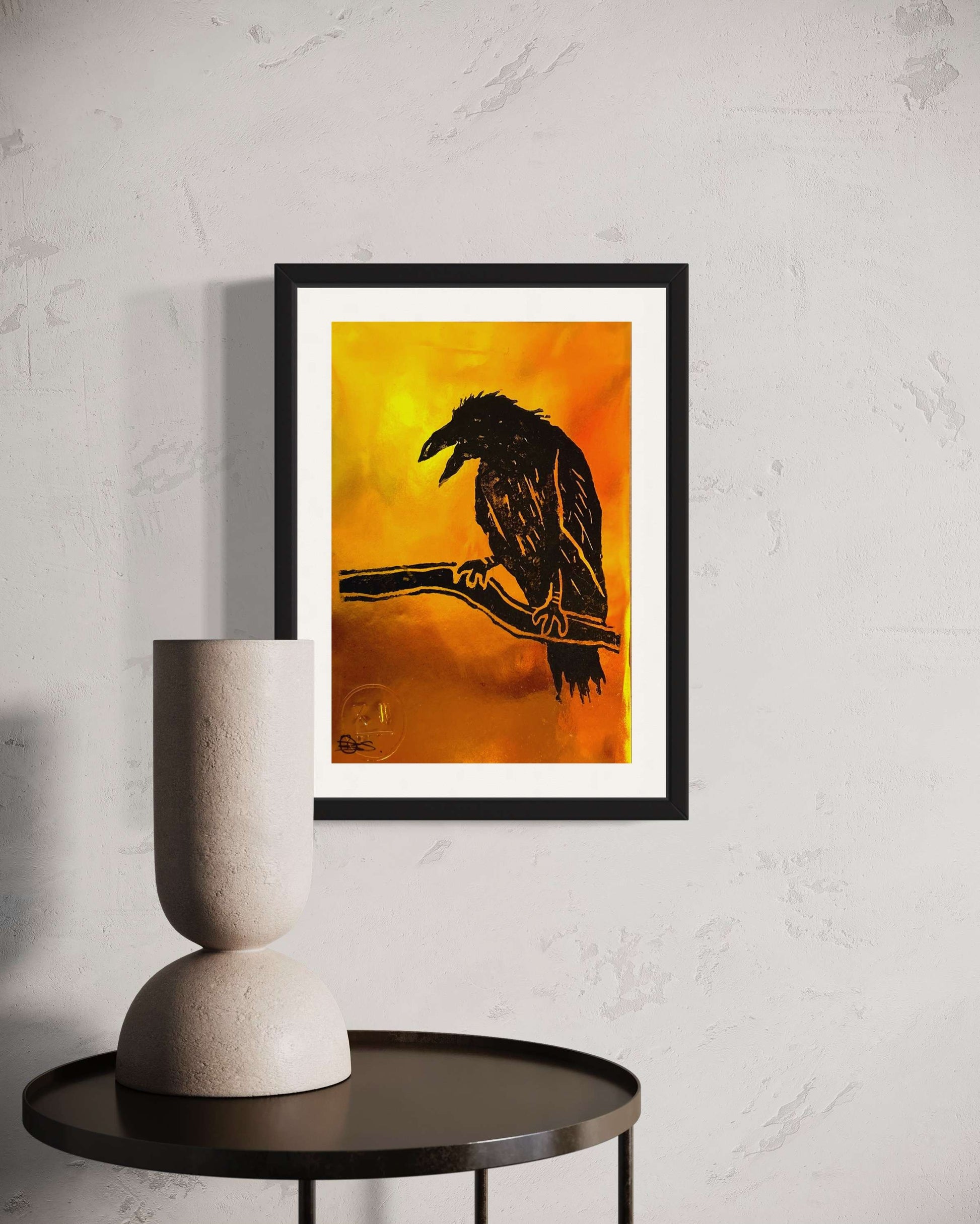 Linoliumtryck i begränsad upplaga. Har gjort några versioner av tryck - denna version (svart korp tryckt på blank bakgrund) är begränsad till 13 tryck. Signerad, numrerad och med konstnärsstämpel. Tryckt på A4-folie (placerad på brunt pappersbakgrund, som enkelt kan separeras). Finns i bärnsten och blå/lila.