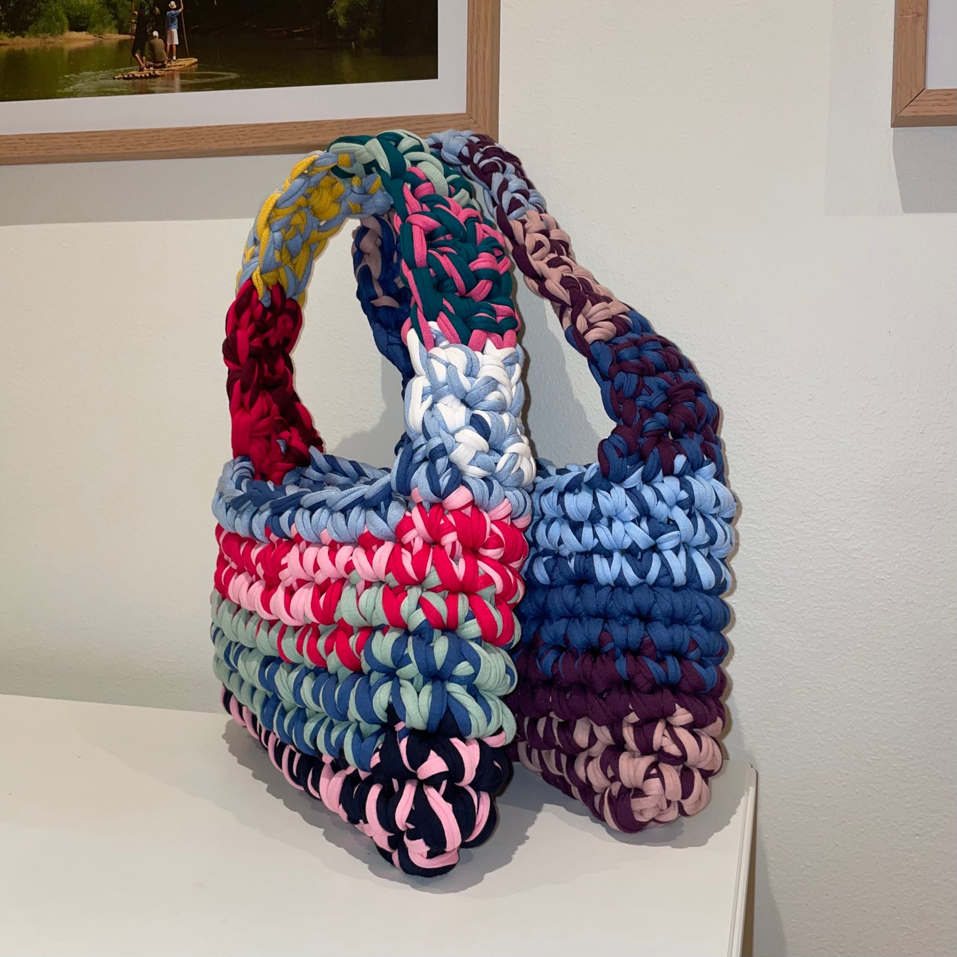 Eleonora Blå och Rosa är helt unika i sitt slag. De är färgkombinerade med omsorg, där den ena har en något mörkare ton och den andra är mer färgglad. Genomgående har vi använt återvunnet trikåbomull.