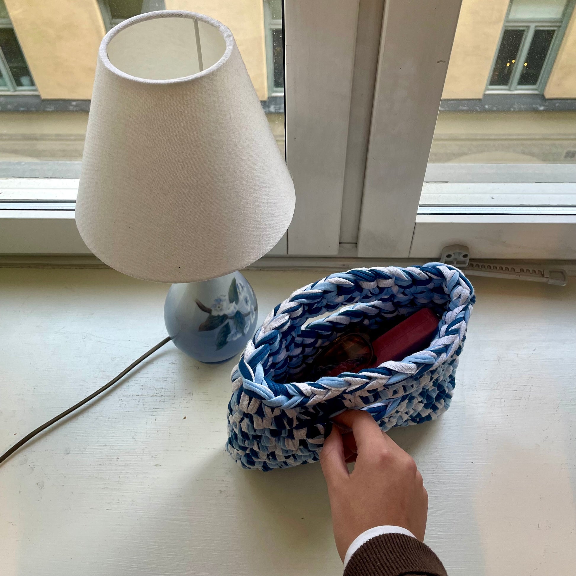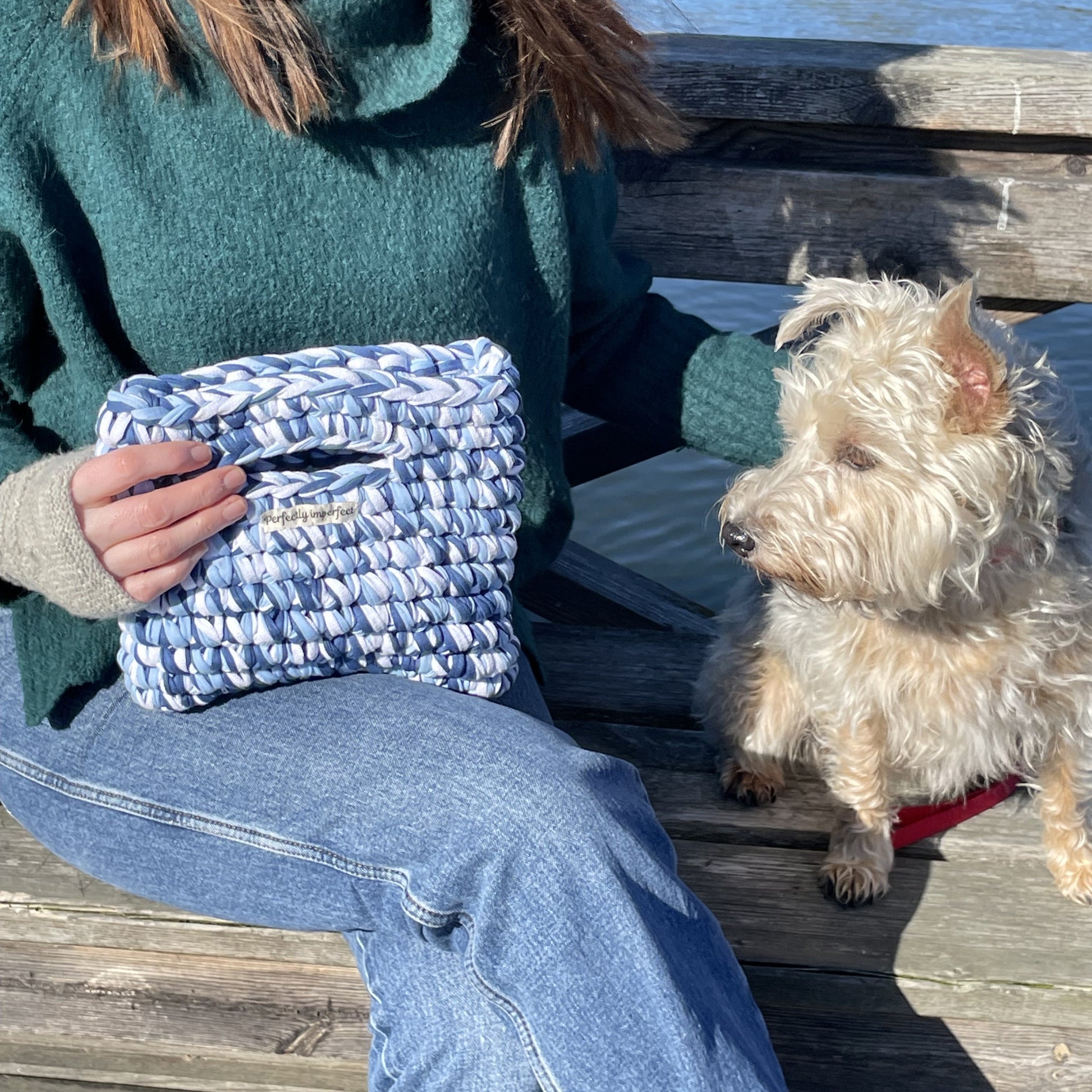 Vår Astrid är en modern, rak handväska. Enkel att bära och rymmer det viktigaste. Alla färgkombinationer innehåller tre olika färger. Två garner är återvunnet bomullsgarn och ett är stickat garn.
