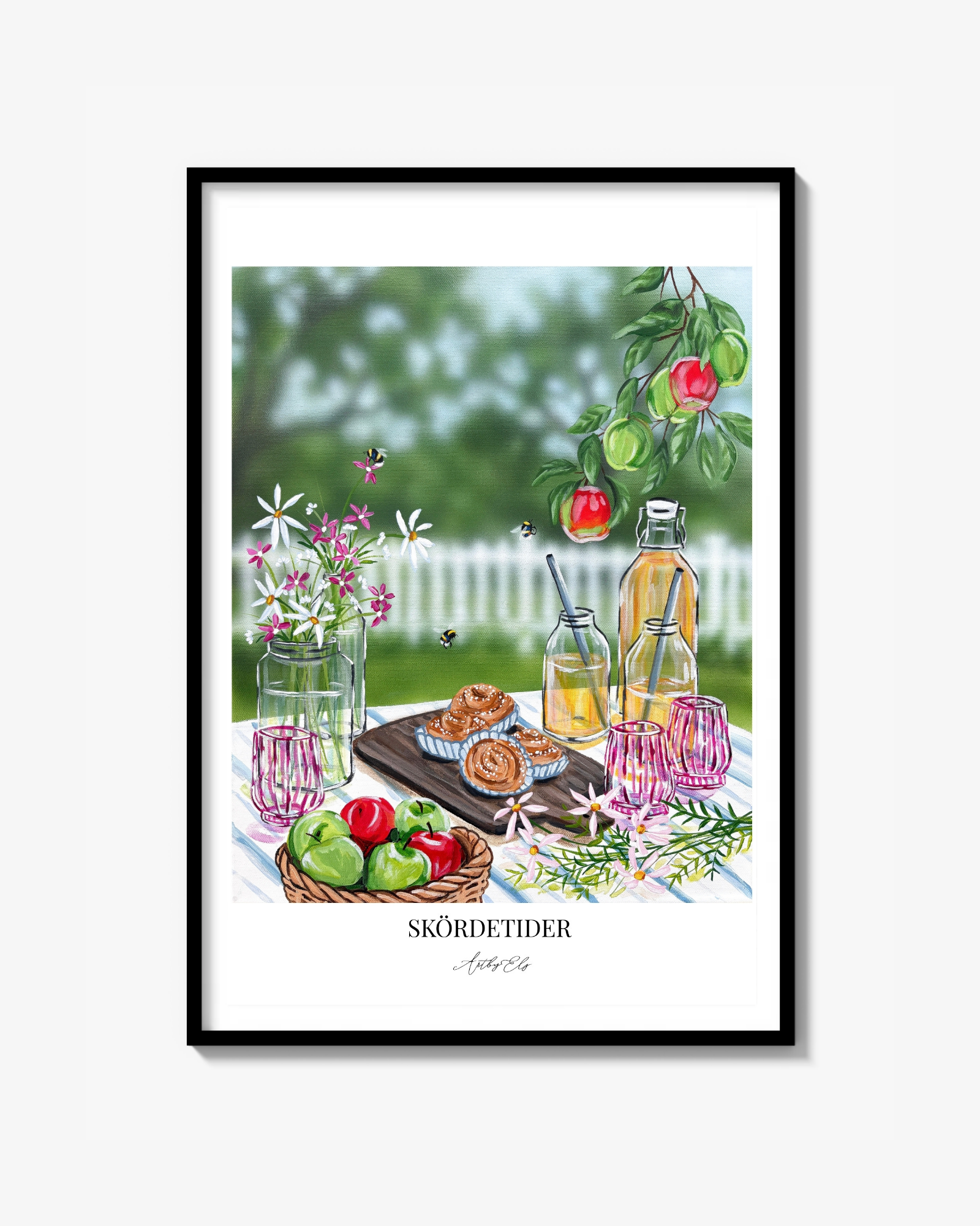 Nerifrån högra hörnet hänger en gren med äpplen ner i bild över bordet som ger en mysig känsla. På bordet ligger årets skörd i en korg och saften i saftflaskan ska såklart föreställa äppelmust. Blommorna på bordet föreställer prästkragar, rödblära och buketten som ligger på bordet föreställer de vackra blommorna rosenskära.