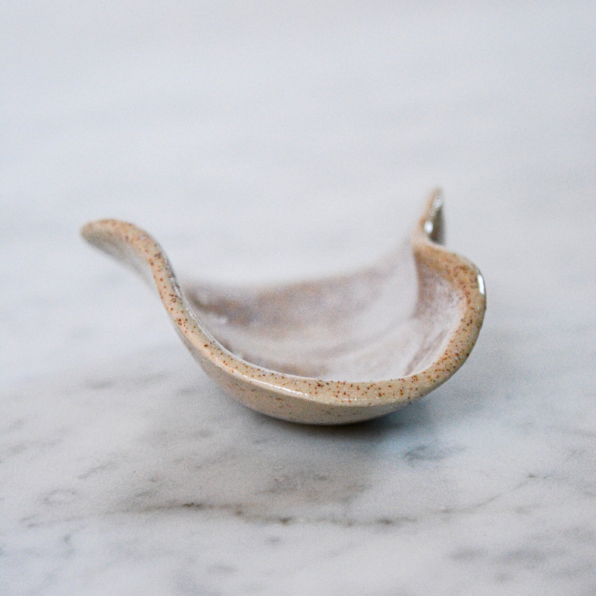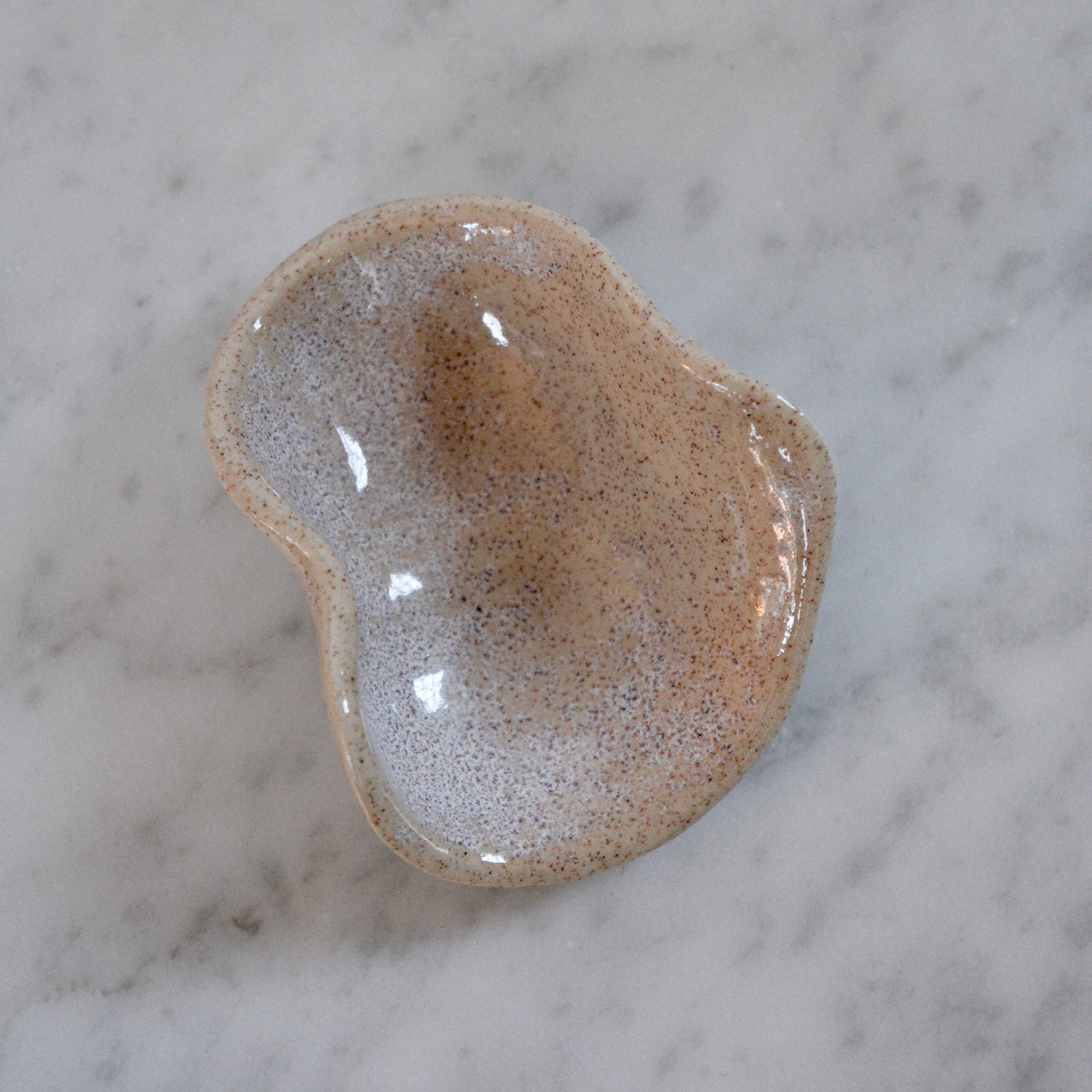 En unik organisk skål tillverkad av lergodslera med en ljus fläckig glasyr.